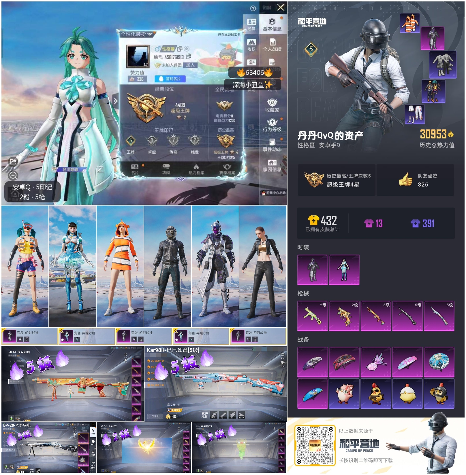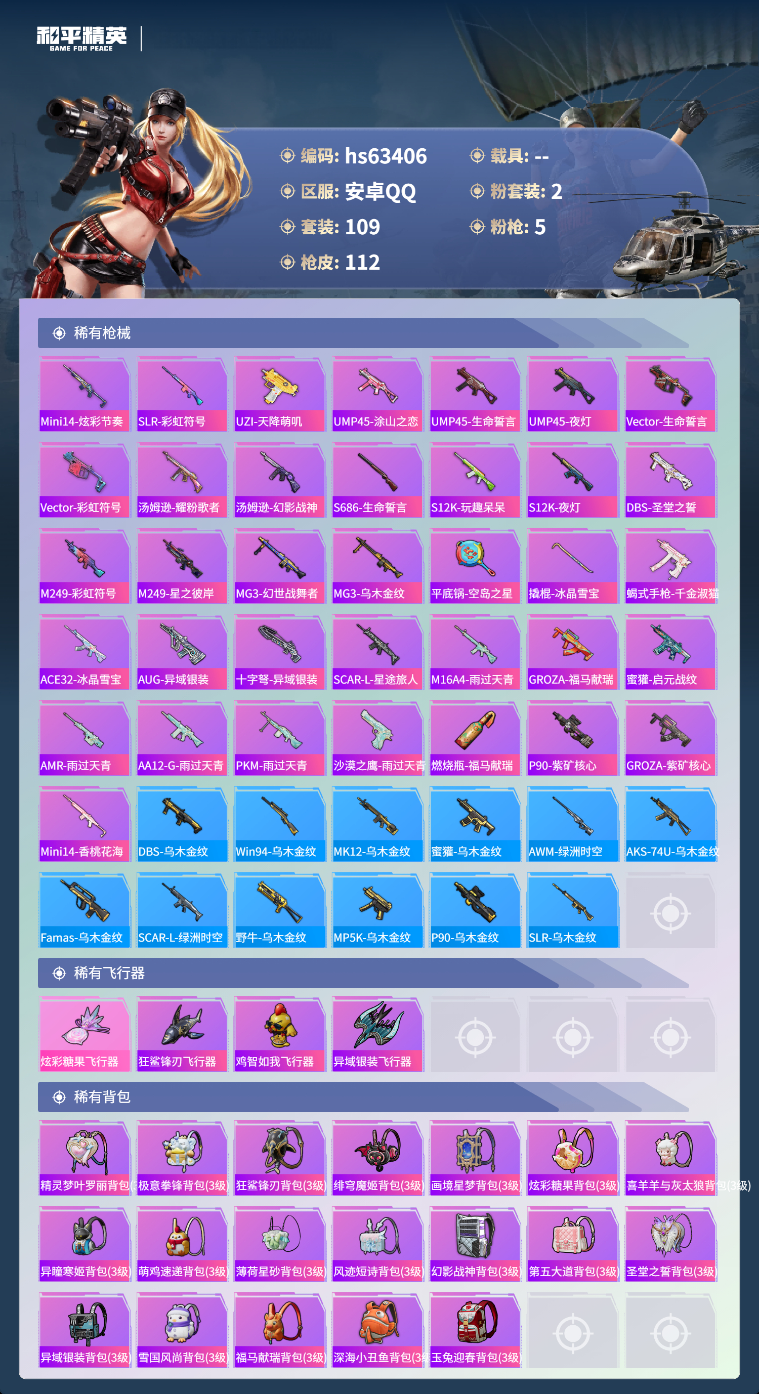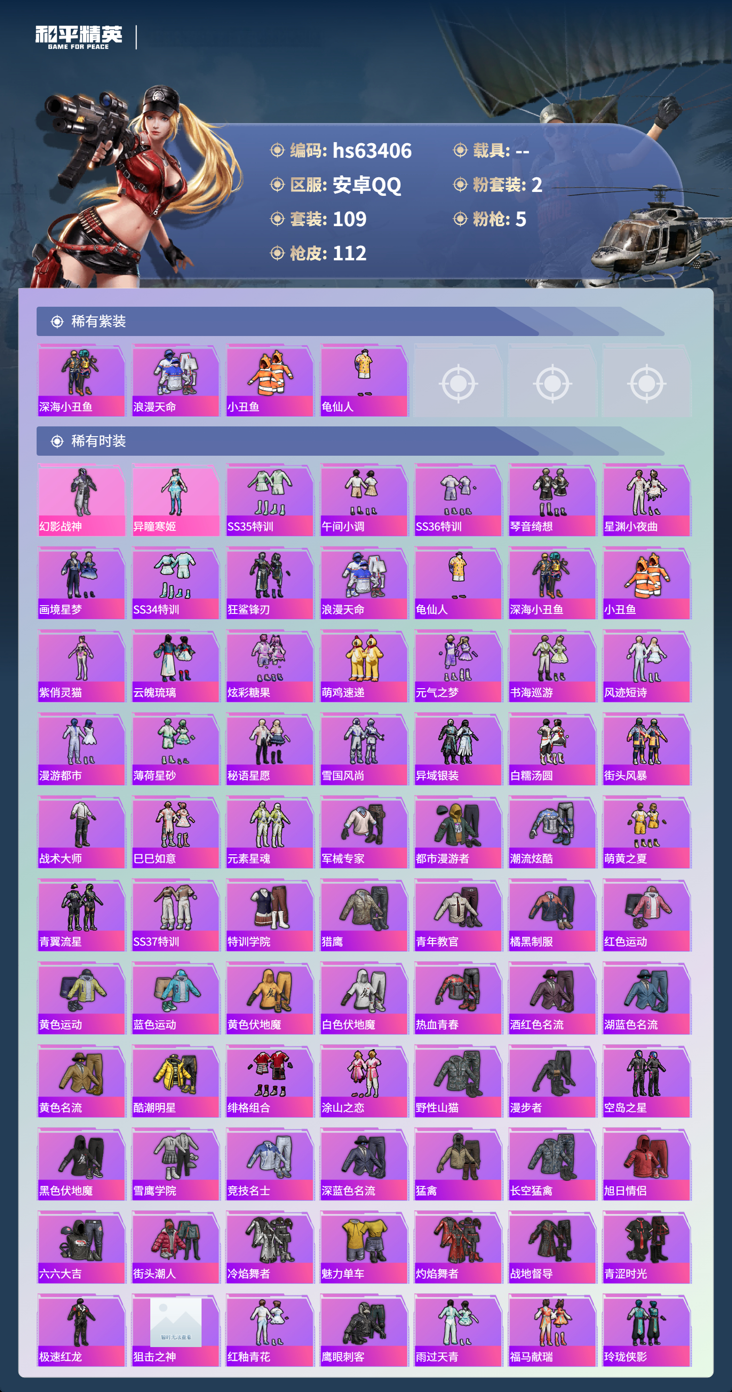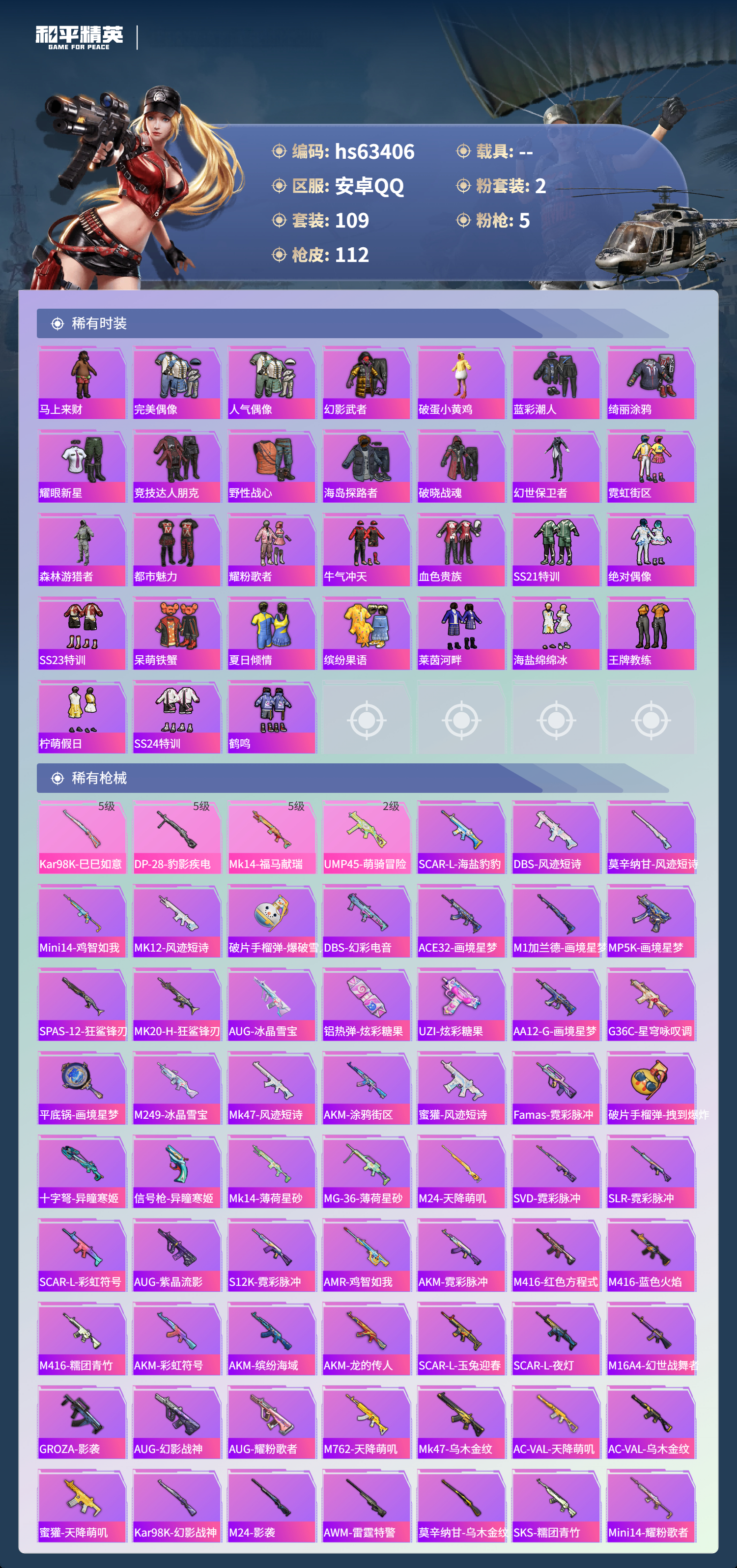 hs63406 安卓手Q-5王牌印记-2粉装-5特效枪-30953热力值-109套装-112枪皮