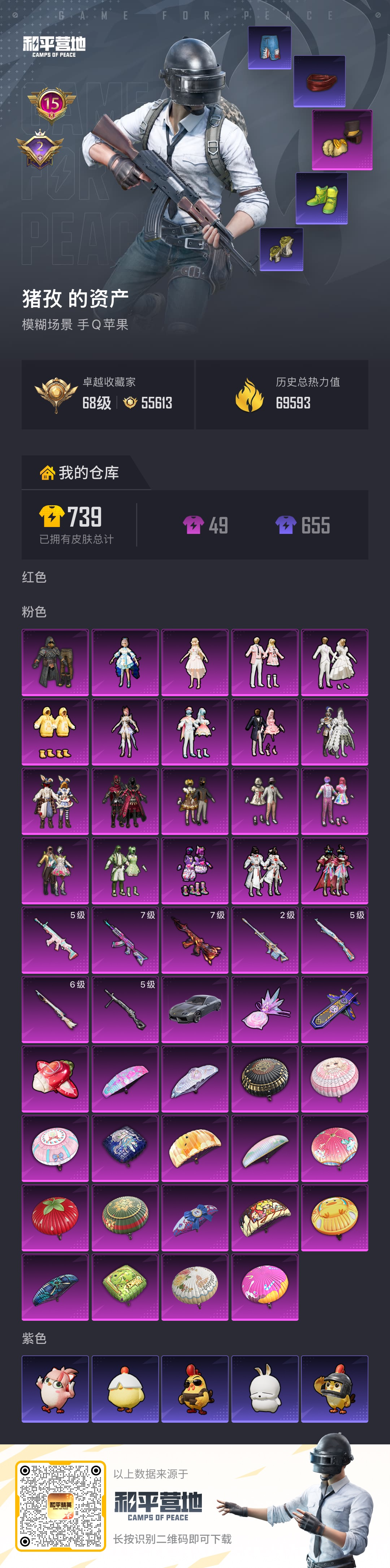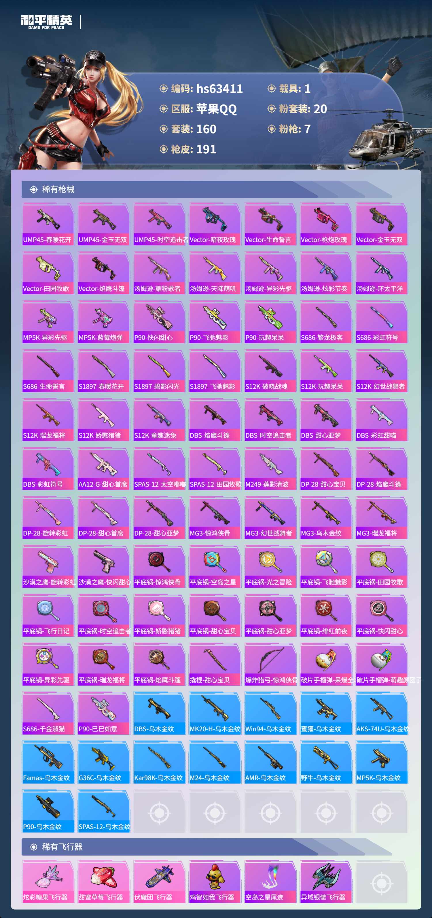hs63411 苹果手Q-15王牌印记-20粉装-7特效枪-1载具-69614热力值-160套装-191枪皮-2卓越印记