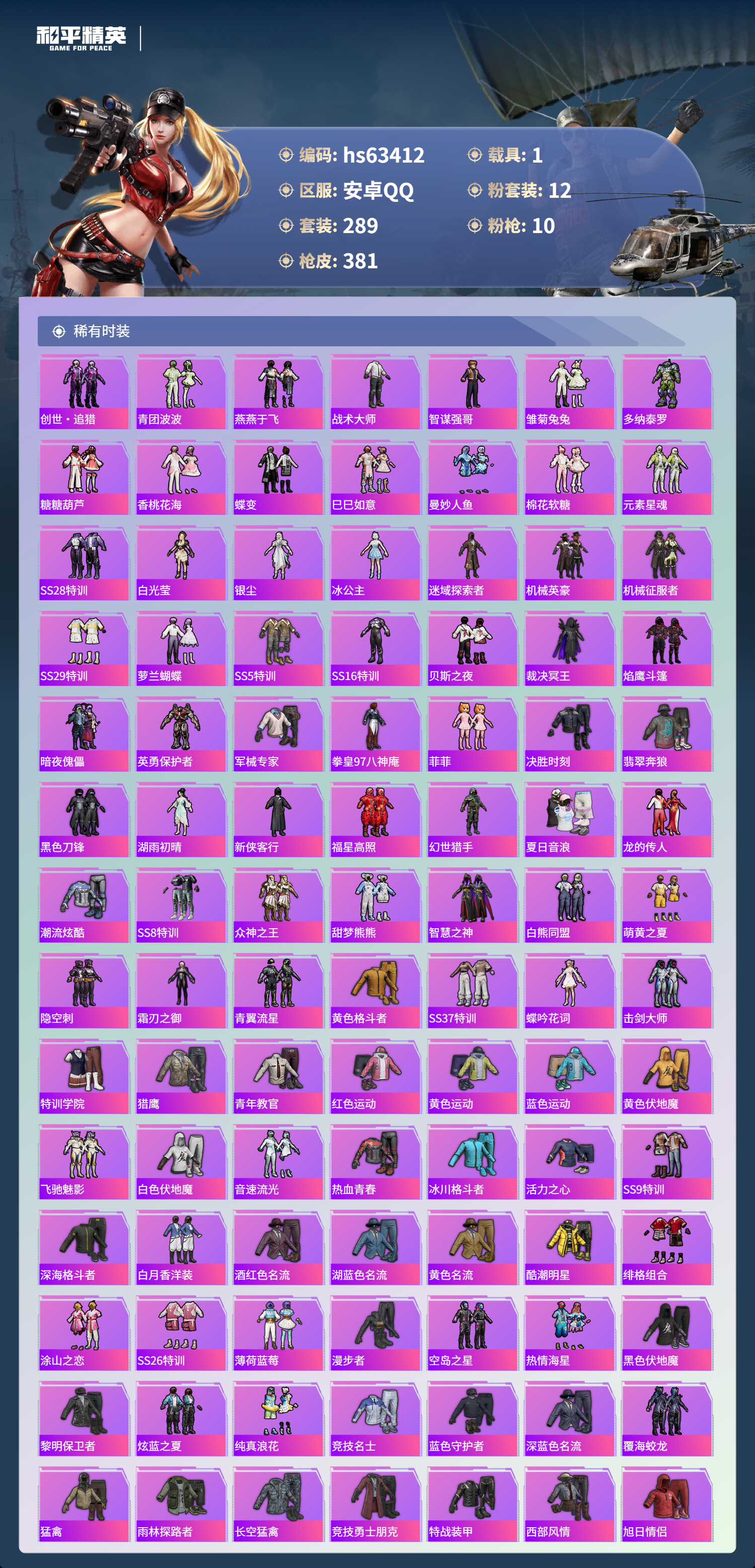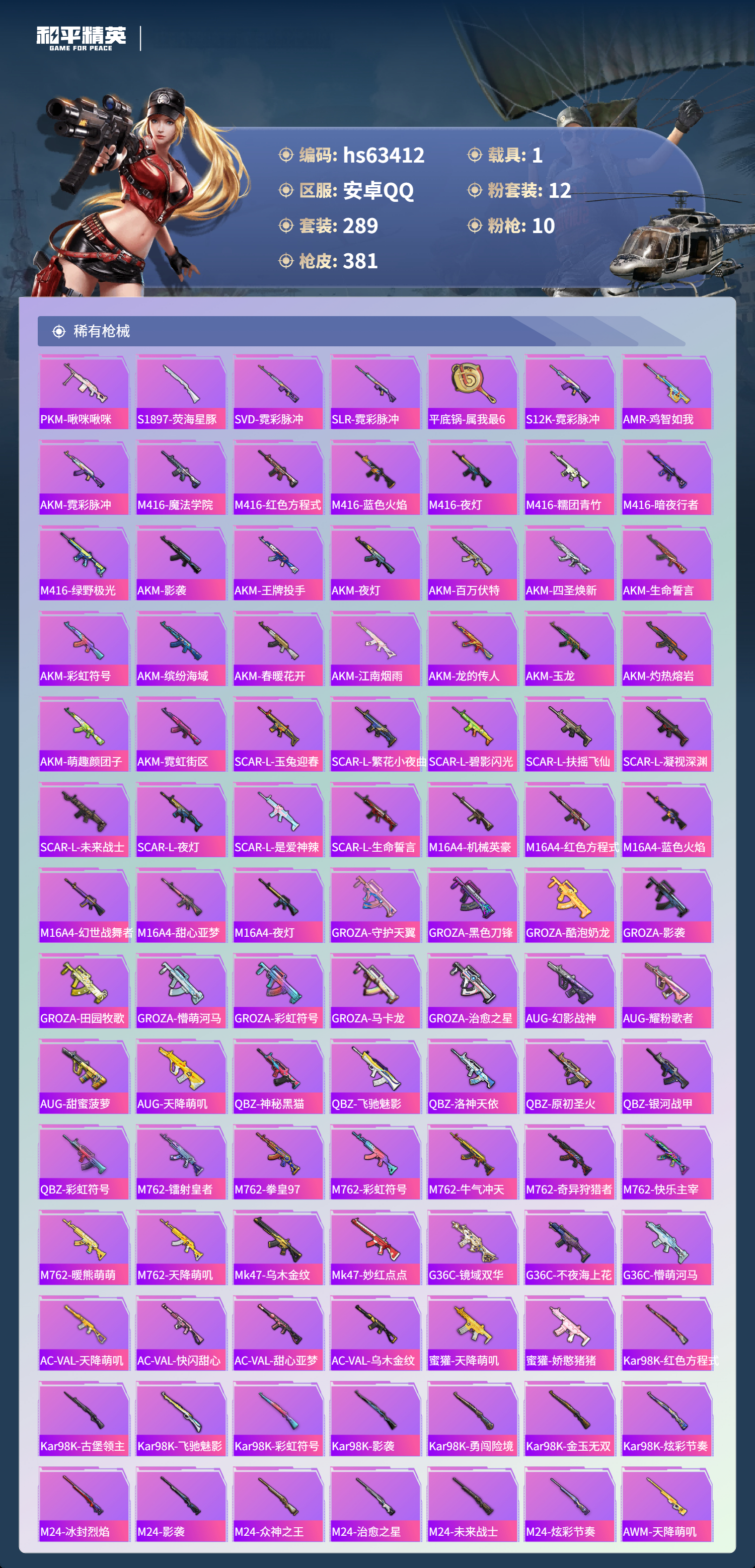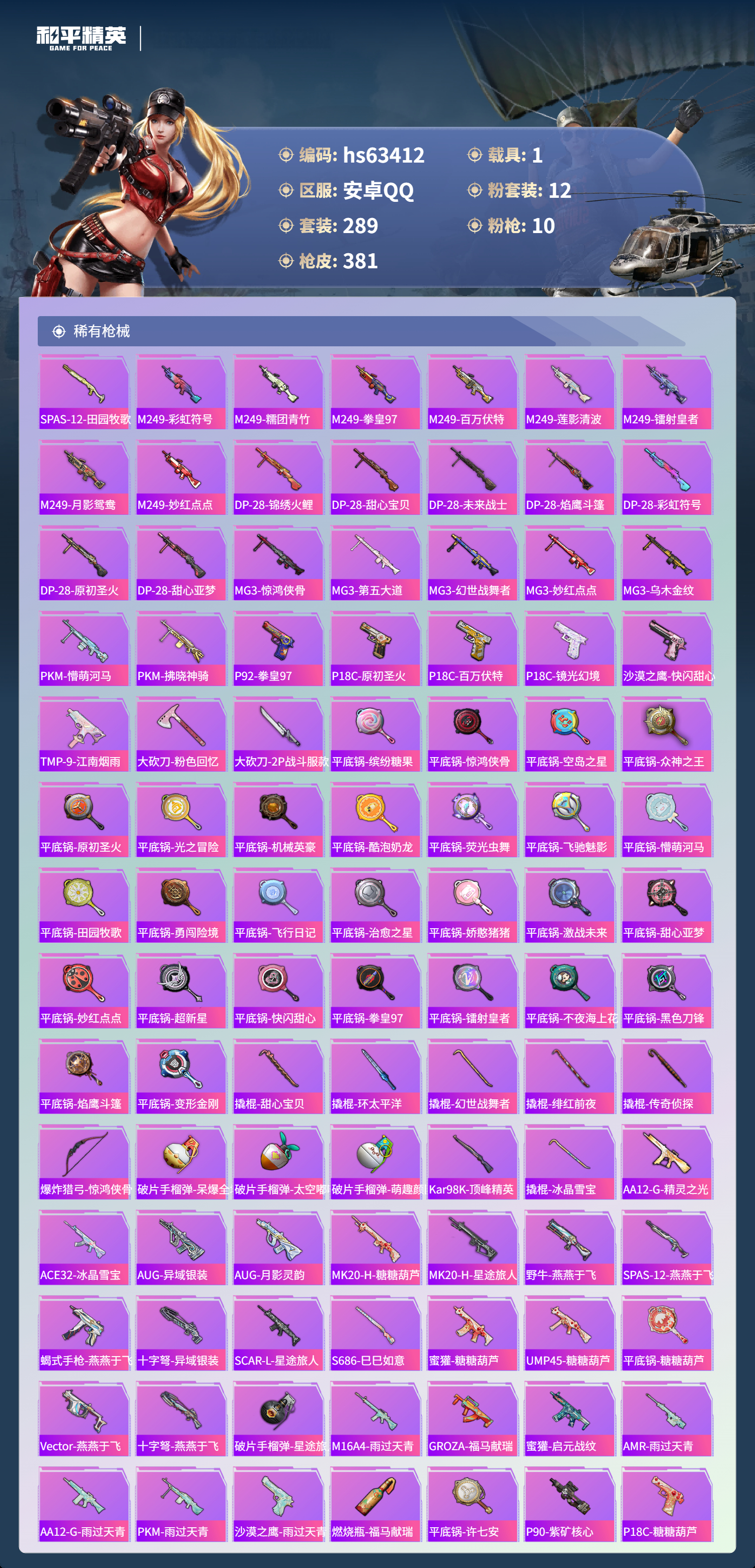 hs63412 安卓手Q-19王牌印记-1红装-12粉装-10特效枪-1载具-热力值-289套装-381枪皮-1卓越印记-1传奇印记