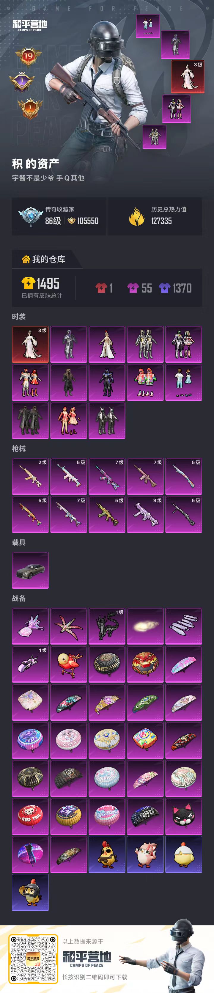 19王牌印记-1红装-12粉装-10特效枪-1载具-热力值-289套装-381枪皮-1卓越印记-1传奇印记