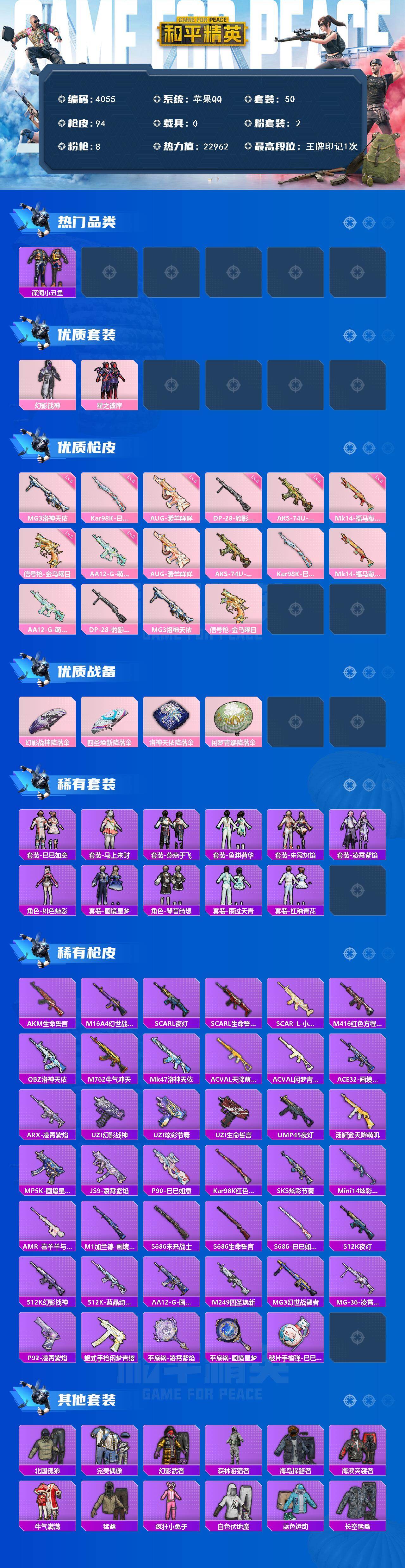 苹果 手Q-2粉装-8特效枪-0载具-0粉色飞行器-22962热力值-1王牌印记-50套装-94枪皮