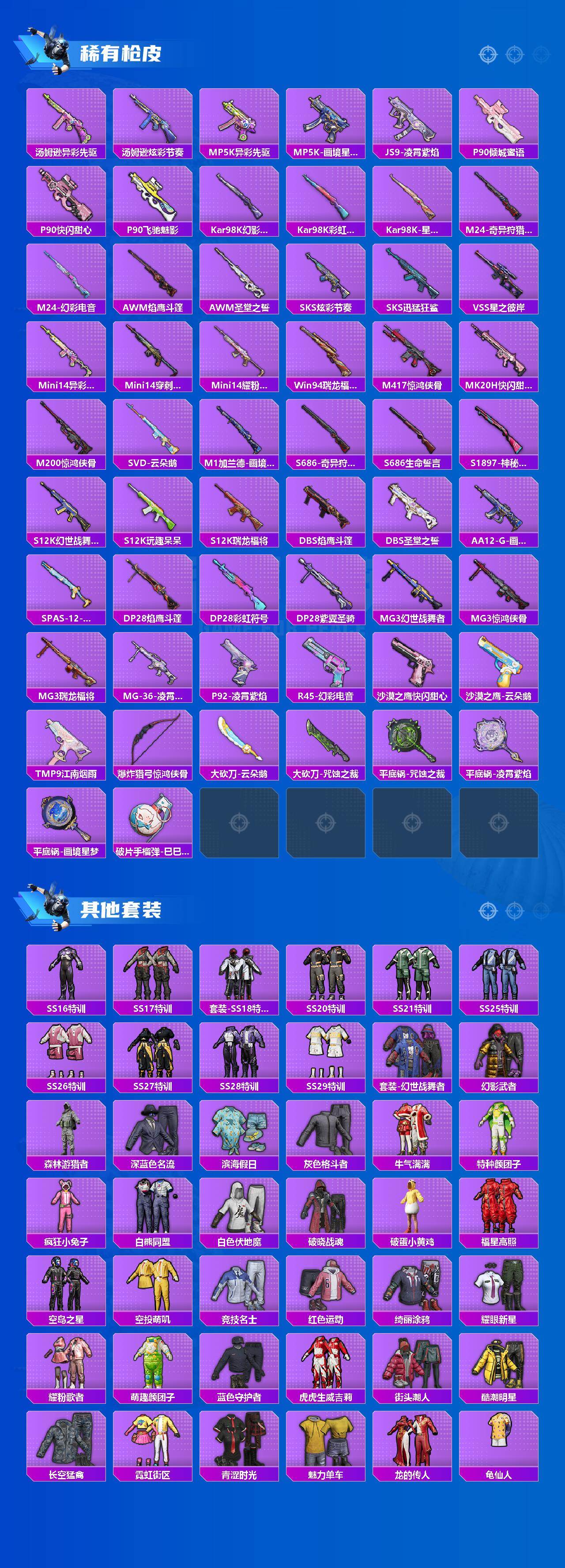 【粉色枪皮等级】:AKM-梦之光华(七级),SCAR-L-锦绣绵绵(五级),M416-心之恋语(七级),GROZA-镜光银凌(五级),ACE32-萌骑漫游(五级),UMP45-量子极限(五级),AKS-74U-森灵之息(五级),Kar