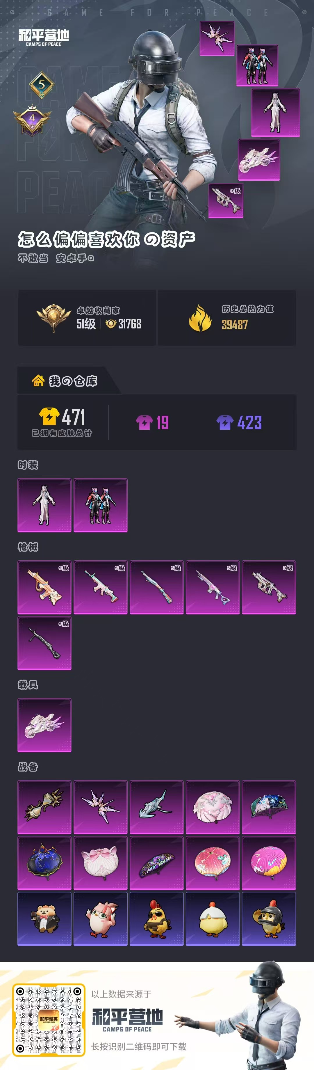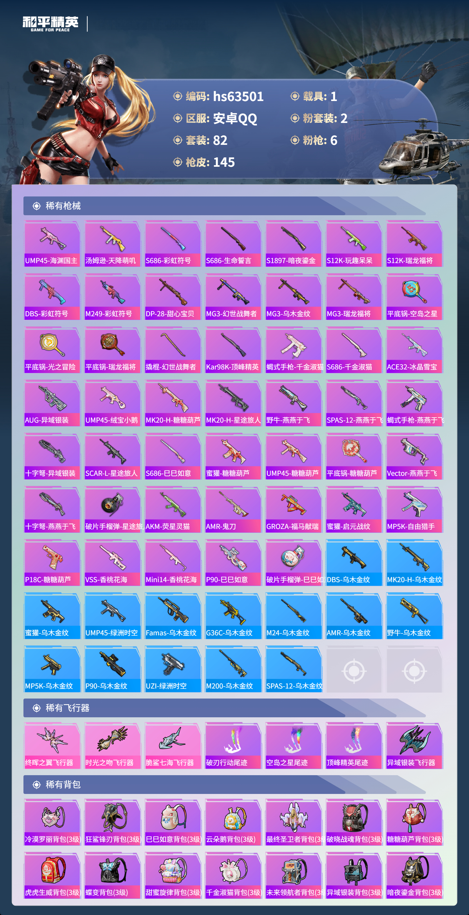 hs63501 安卓手Q-5王牌印记-2粉装-6特效枪-1载具-39504热力值-82套装-145枪皮-4卓越印记