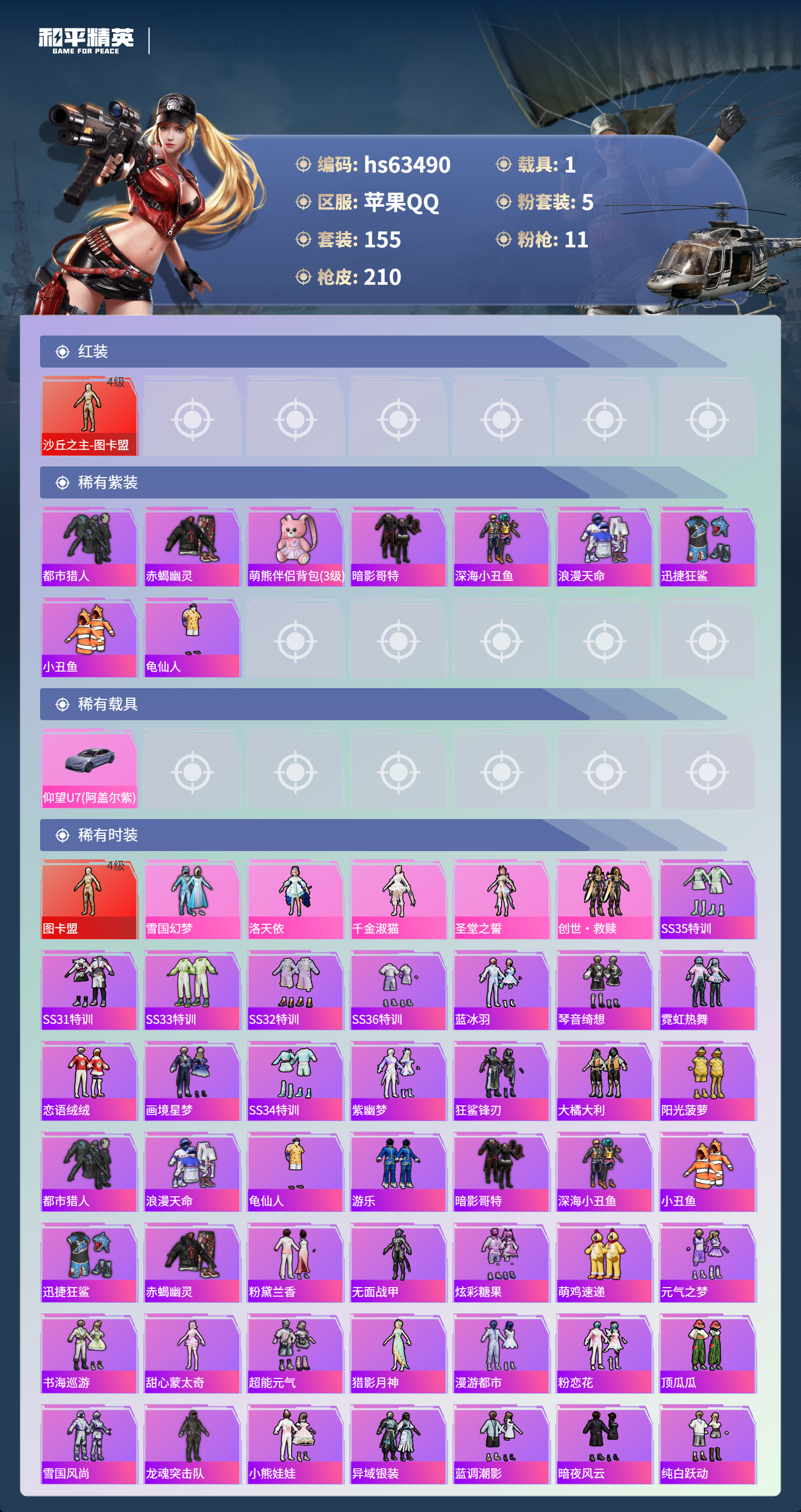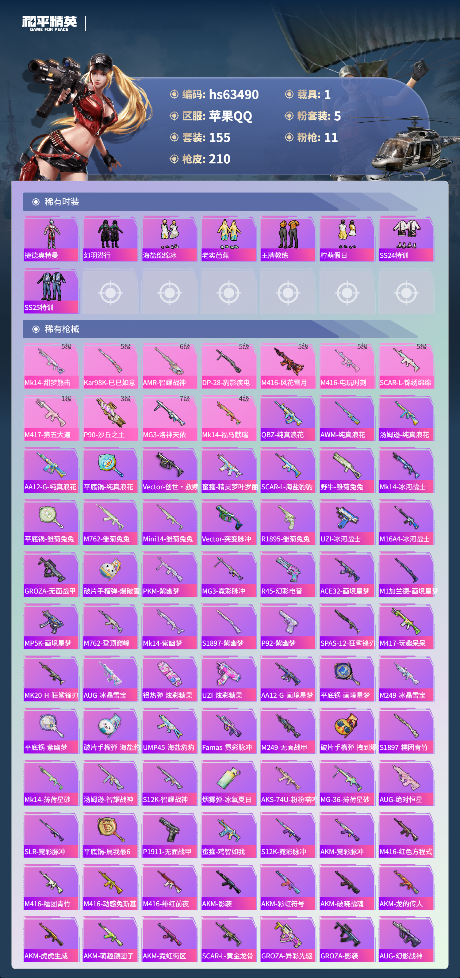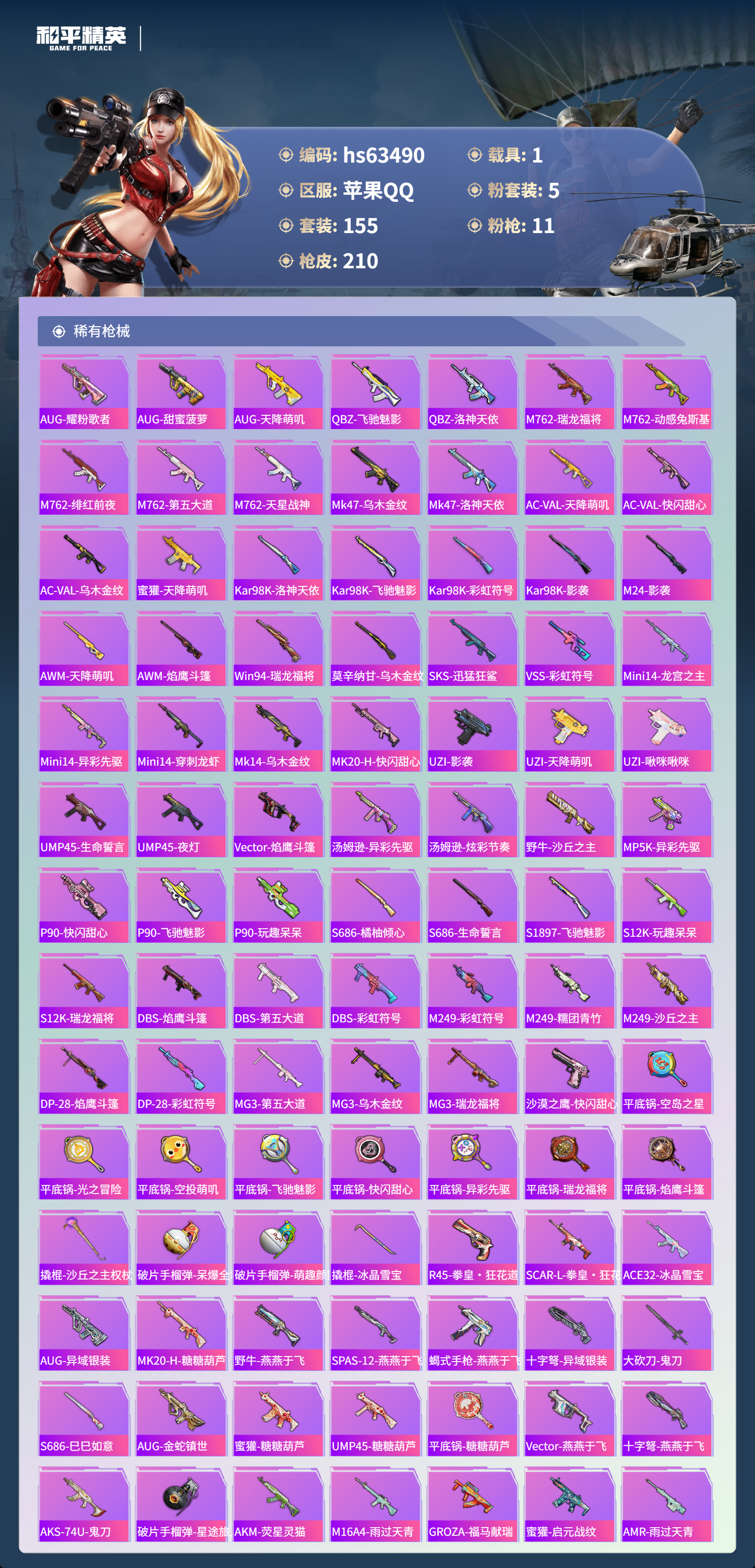 hs63490 苹果手Q-21王牌印记-有战神框-1红装-5粉装-11特效枪-1载具-71378热力值-155套装-210枪皮-7卓越印记-4传奇印记