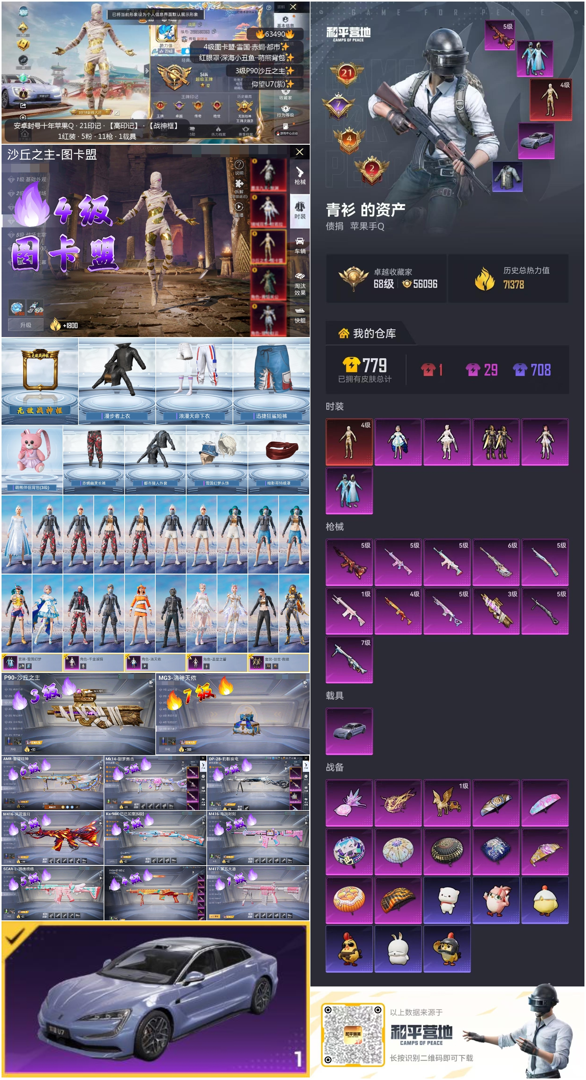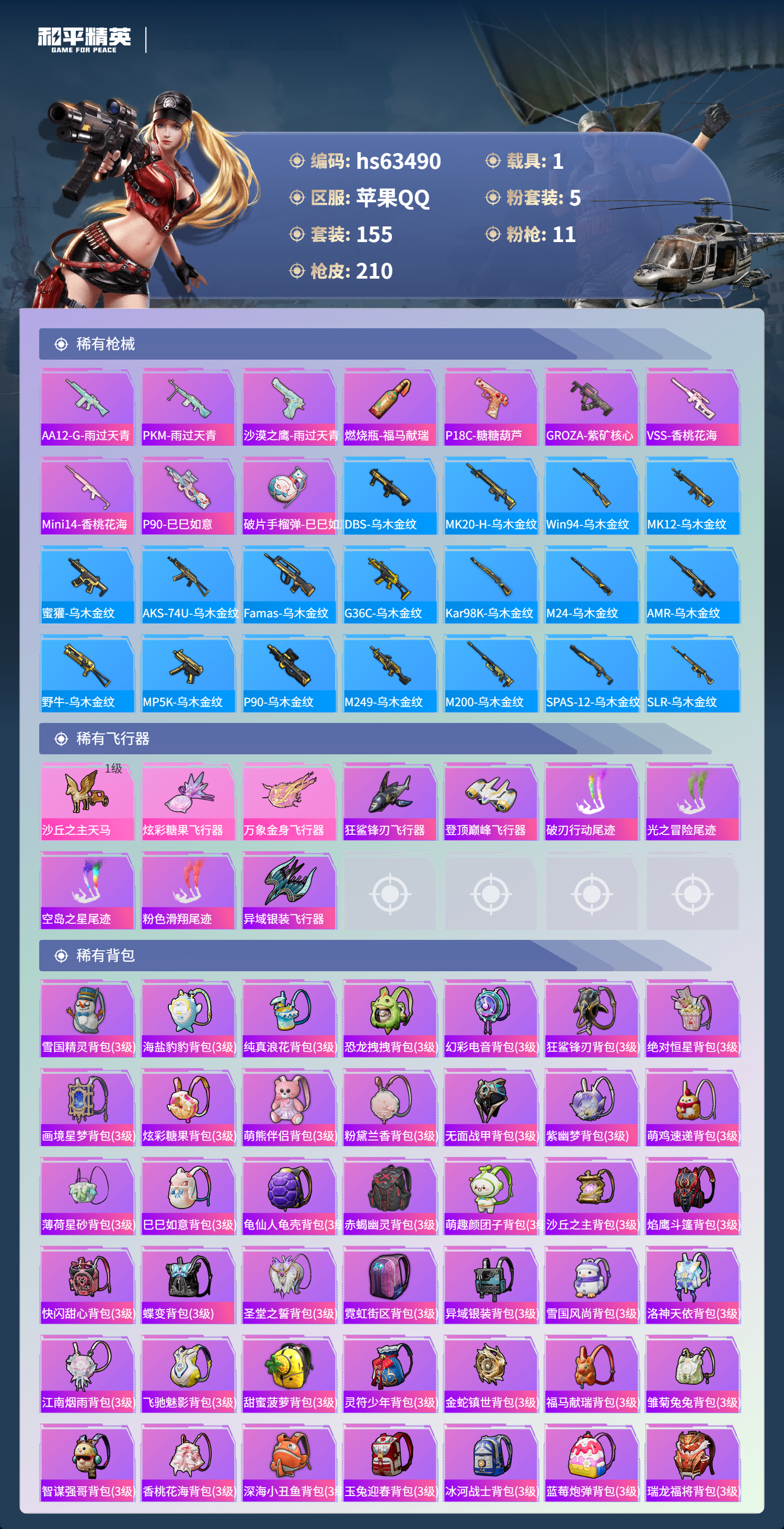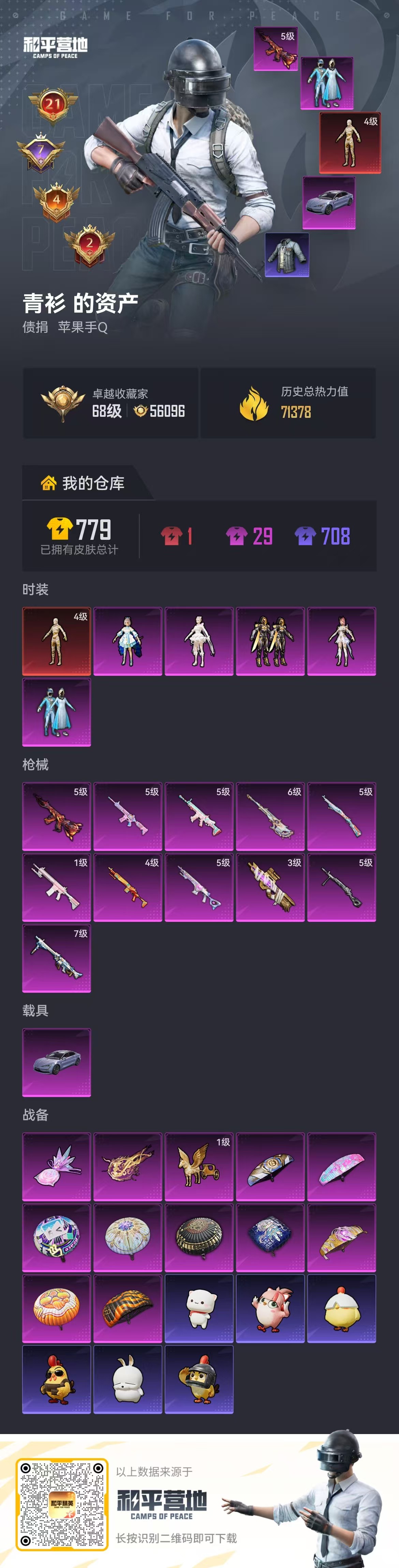 hs63490 苹果手Q-21王牌印记-有战神框-1红装-5粉装-11特效枪-1载具-71378热力值-155套装-210枪皮-7卓越印记-4传奇印记