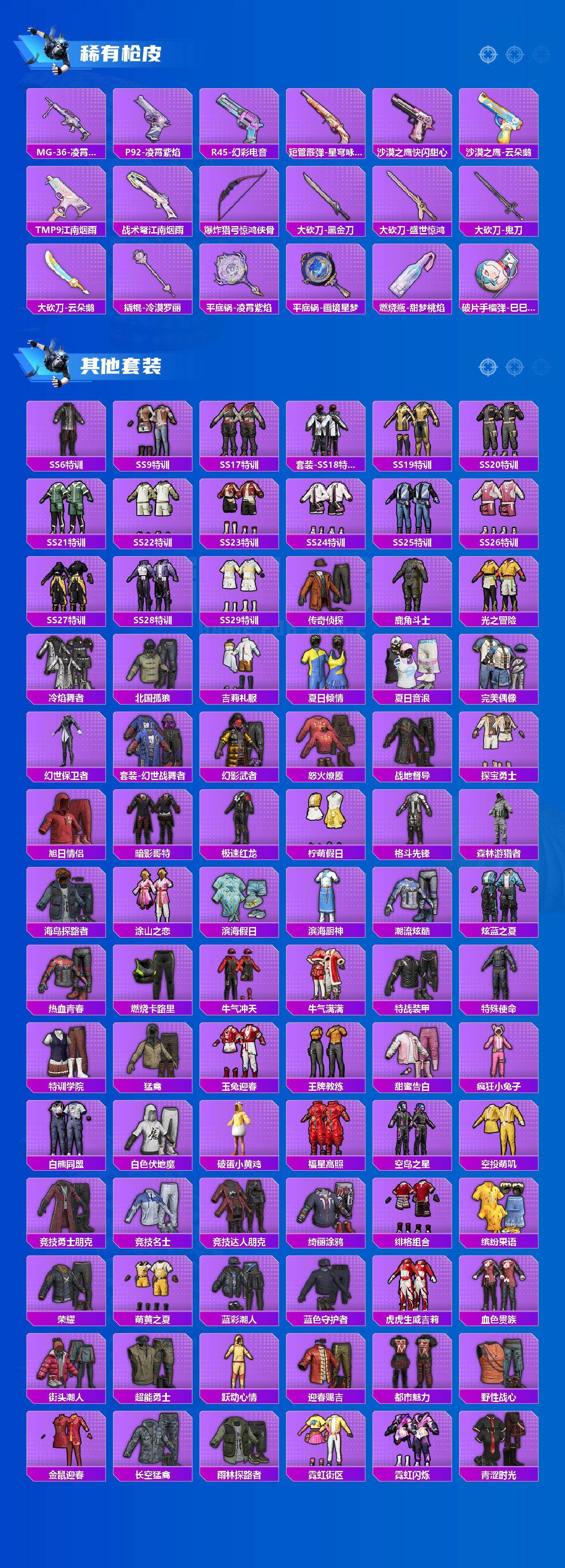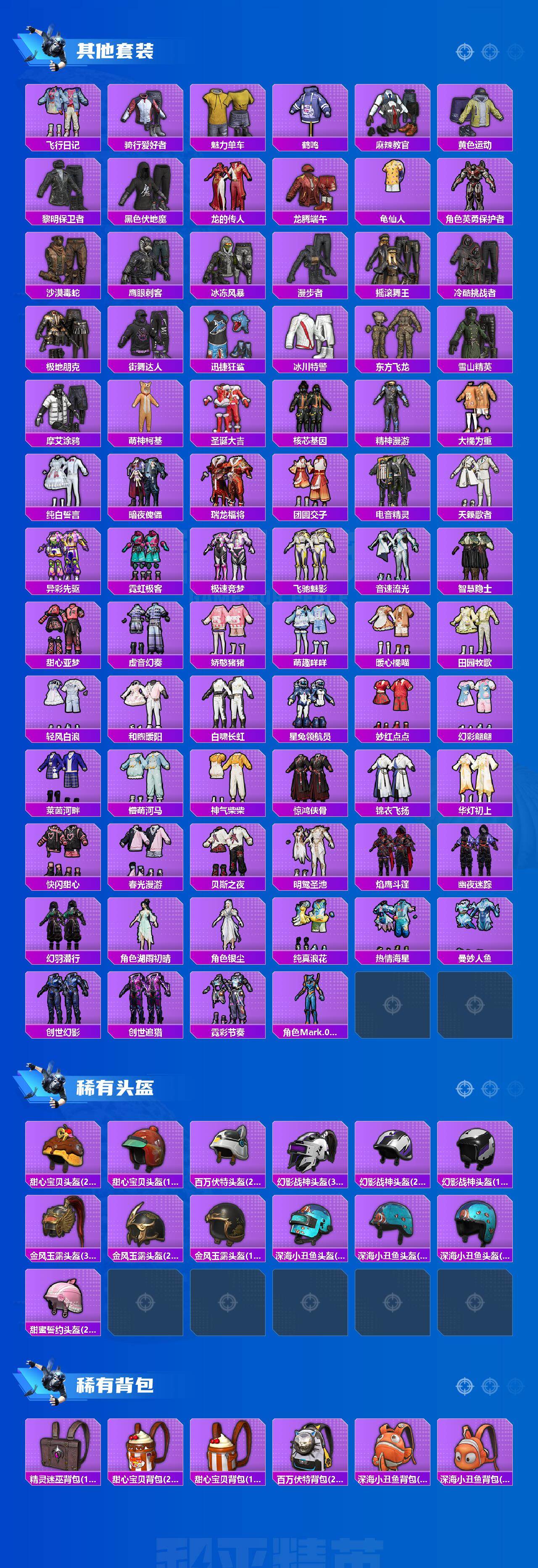 【粉色套装】:粉装-极限特训,粉装-幻影战神,粉装-宝贝奶油派,粉装-天使彩虹糖,粉装-绚金战神,角色-洛天依,粉装-第五大道,粉装-室女星神,角色-萨利娅,角色-冷漠罗丽