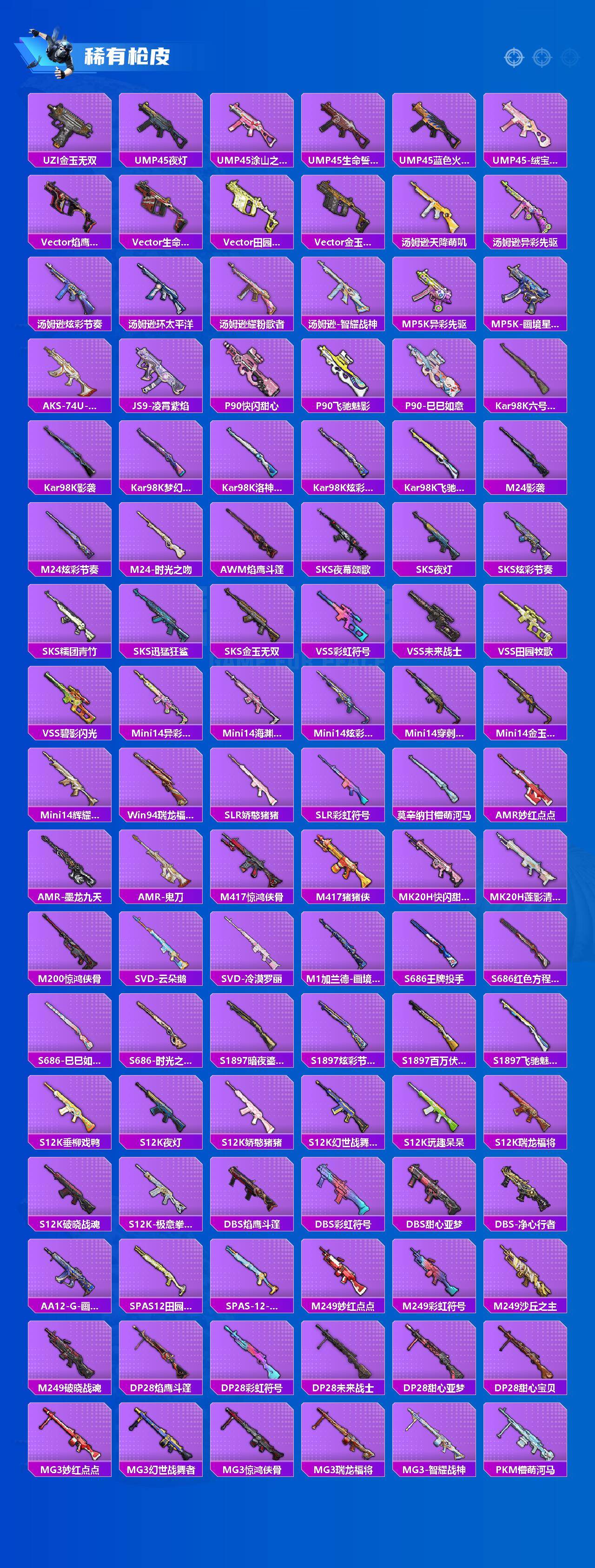 【粉色枪皮等级】:AKM-梦之光华(六级),SCAR-L-锦绣绵绵(五级),M41