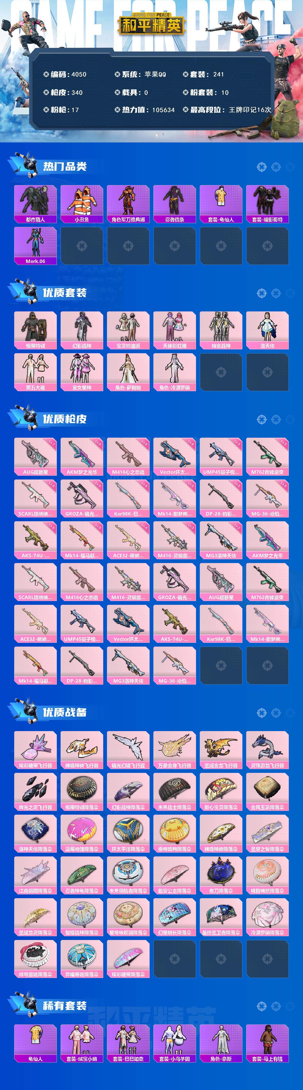 苹果 手Q-10粉装-17特效枪-0载具-8粉色飞行器-105634热力值-16王牌印记-241套装-340枪皮