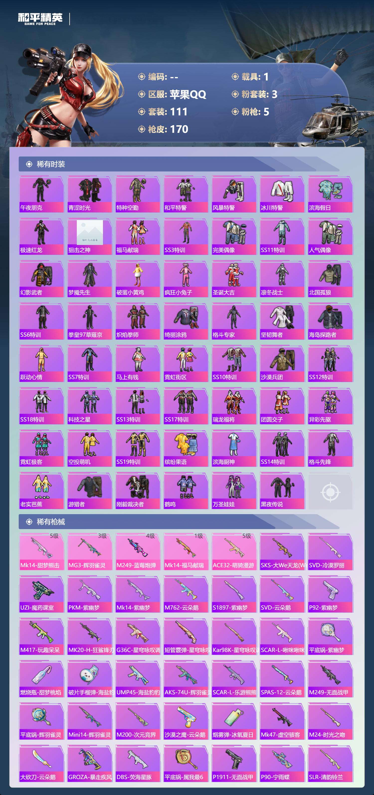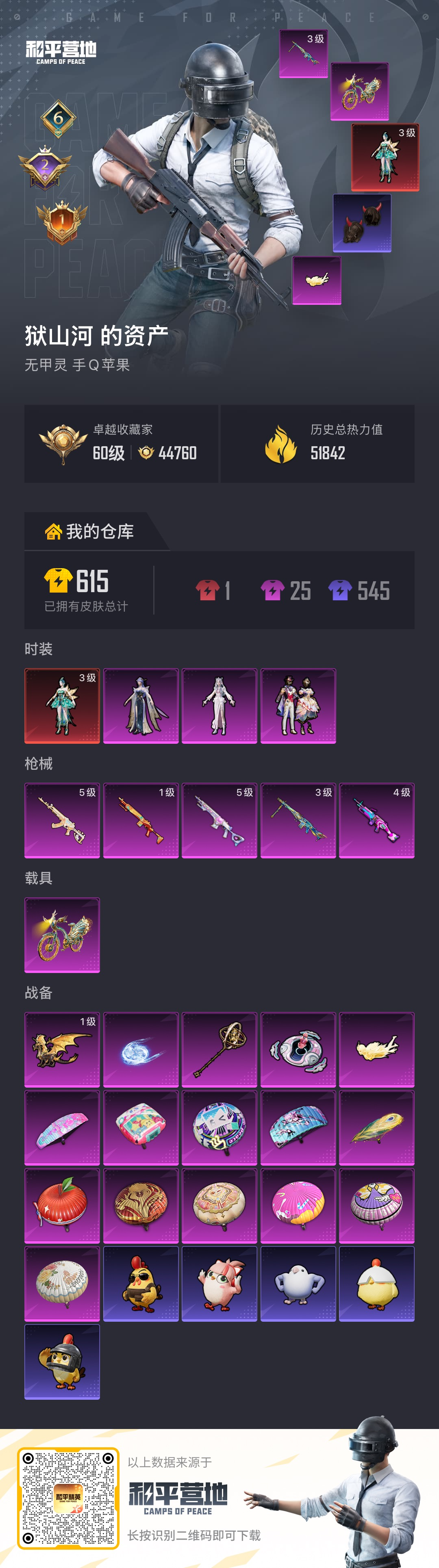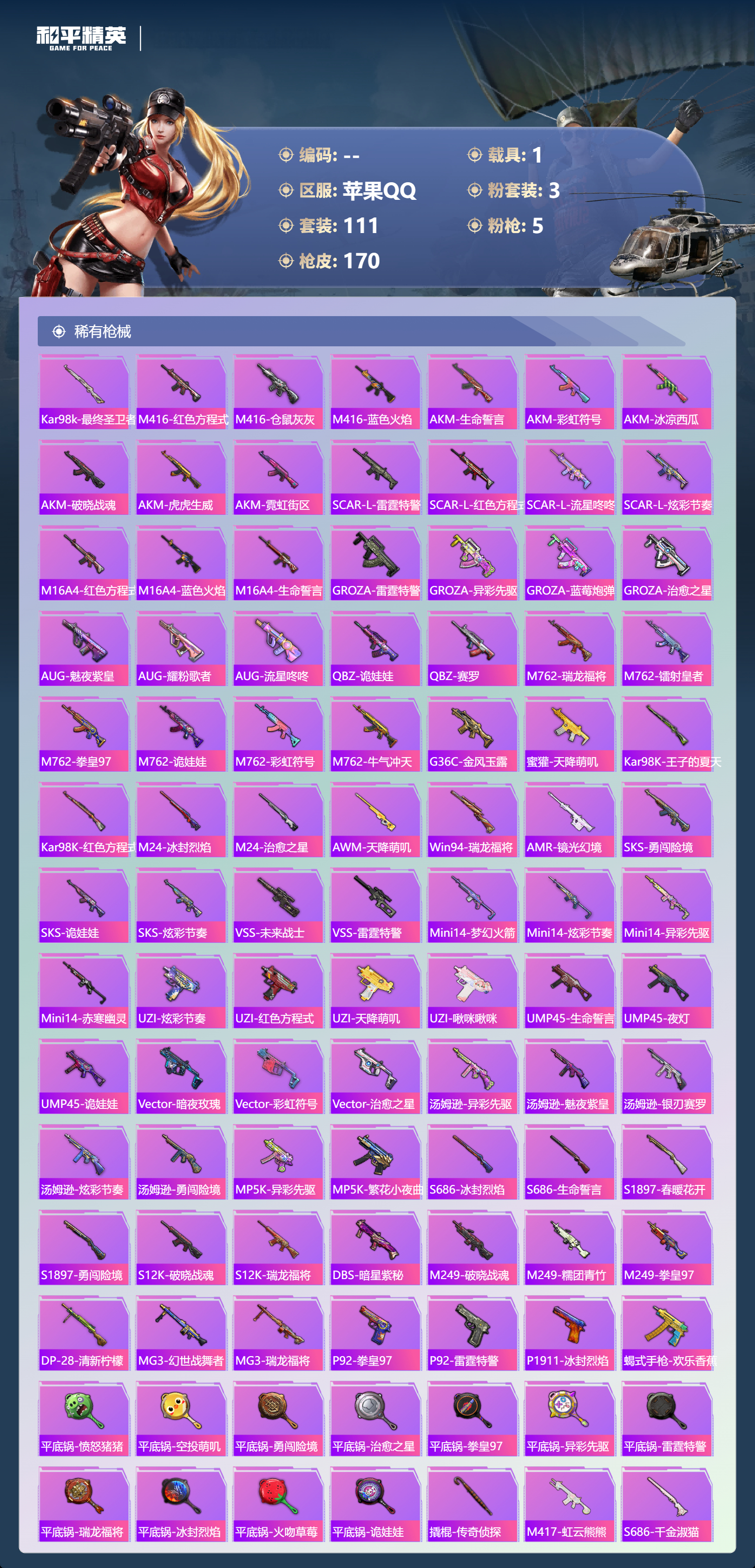 hs63447 苹果手Q-6王牌印记-1红装-3粉装-5特效枪-1载具-51842热力值-111套装-170枪皮-2卓越印记-1传奇印记