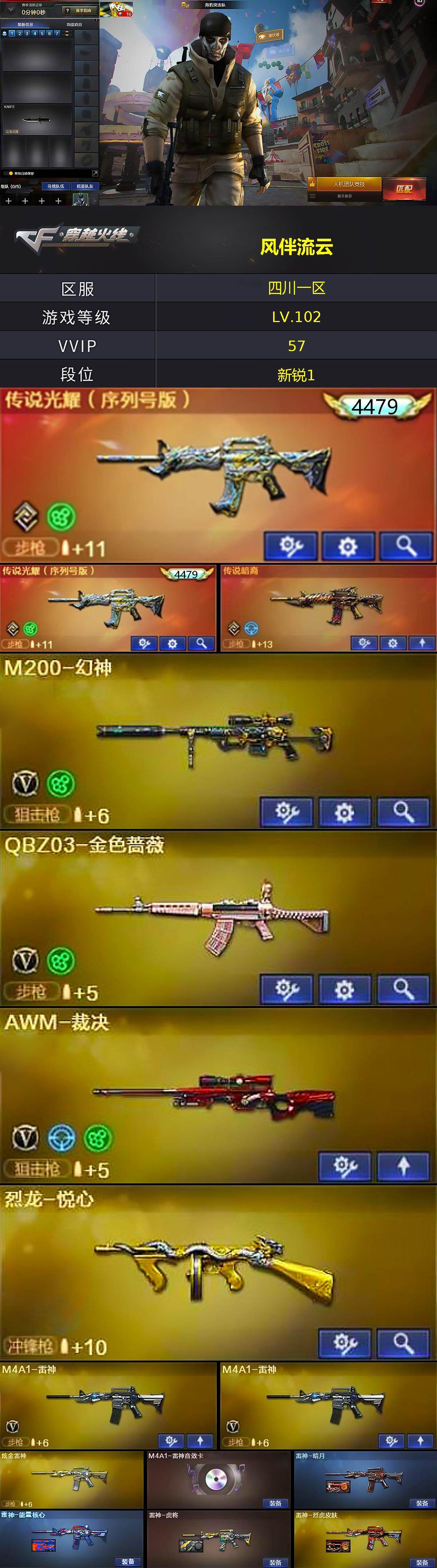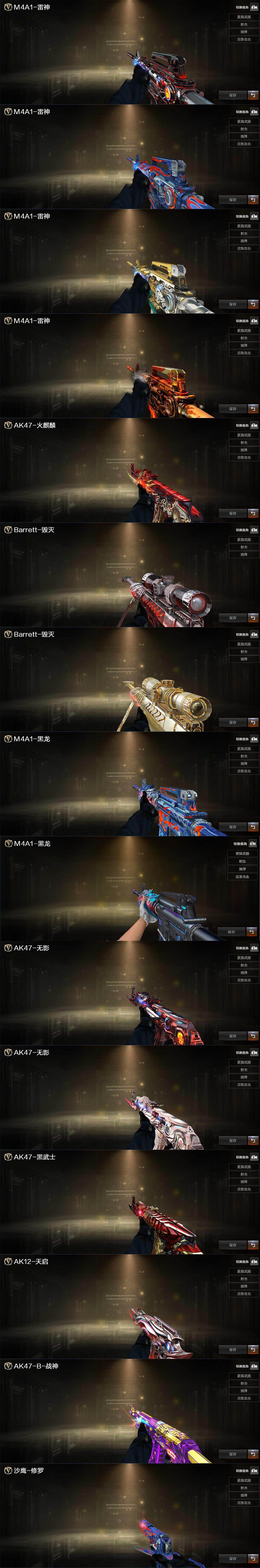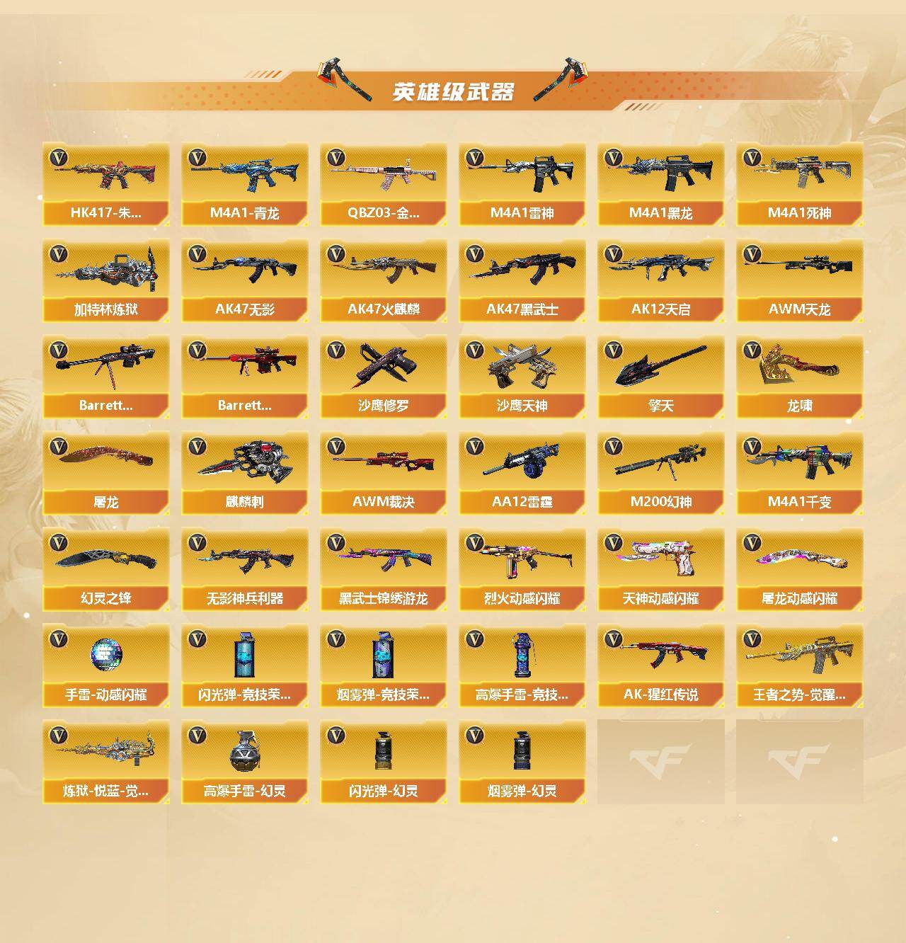 【热门武器】:传说光耀,传说暗裔,QBZ03-金色蔷薇,HK417-朱雀,M4A1-青龙,M200-幻神,死亡之眼,加特林-炼狱*6,沙鹰-修罗*2,金刚伞*3