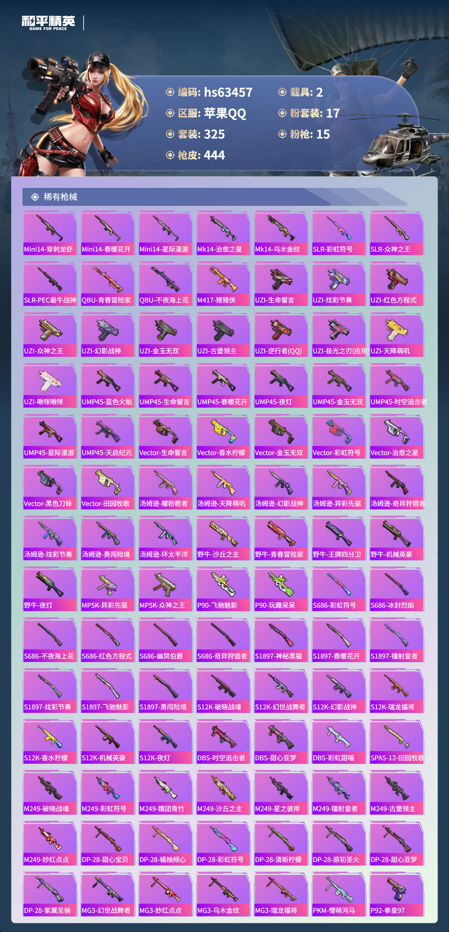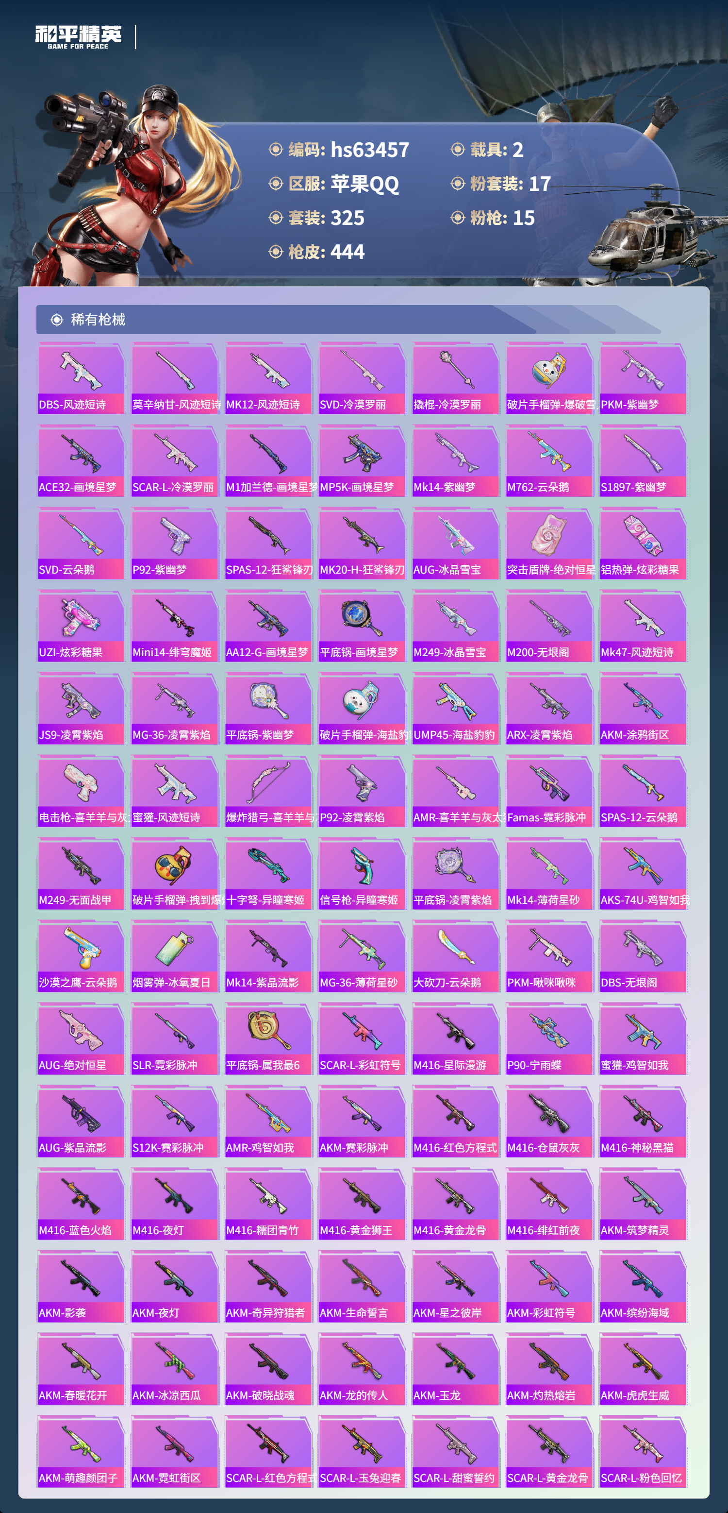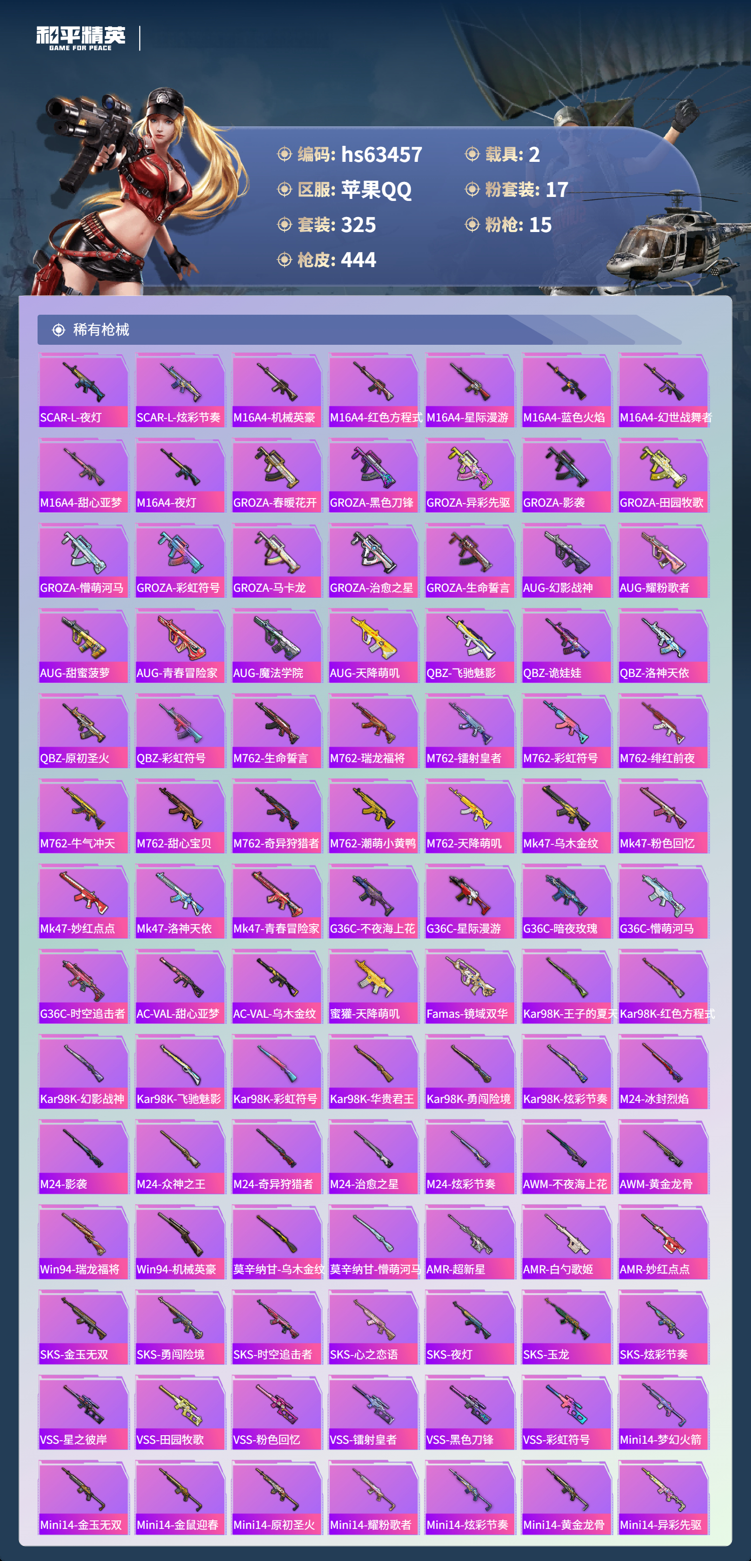 hs63457 苹果手Q-20王牌印记-17粉装-15特效枪-2载具-热力值-325套装-444枪皮-5卓越印记-2传奇印记