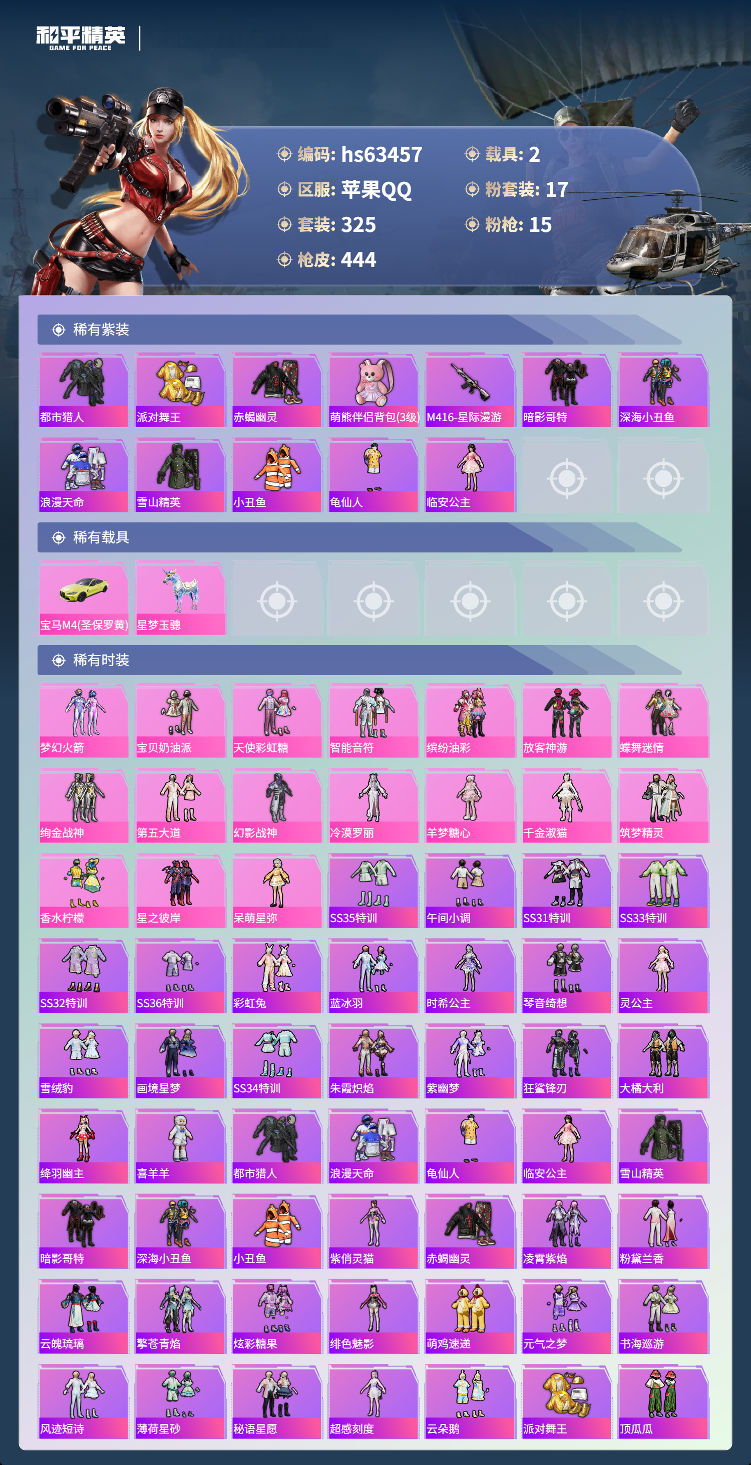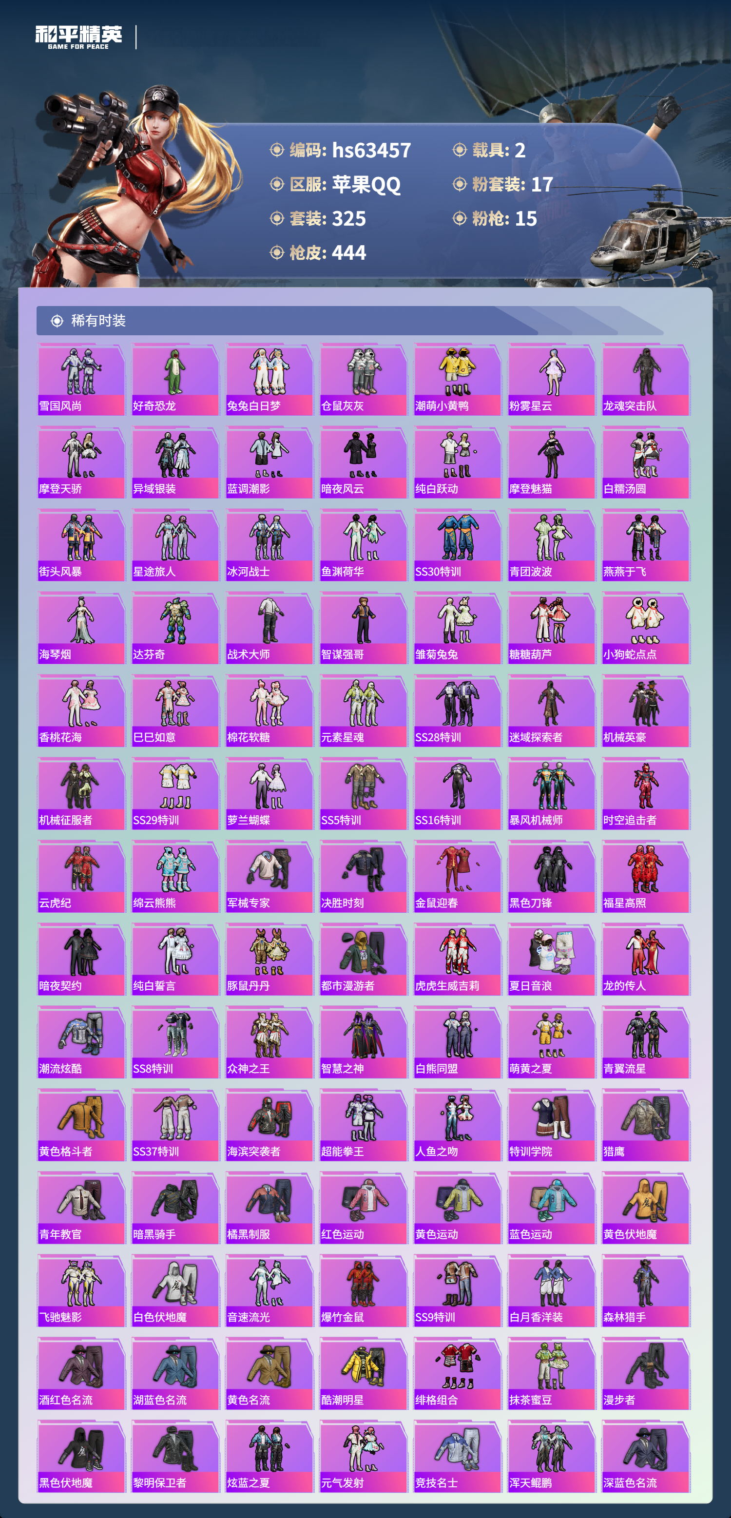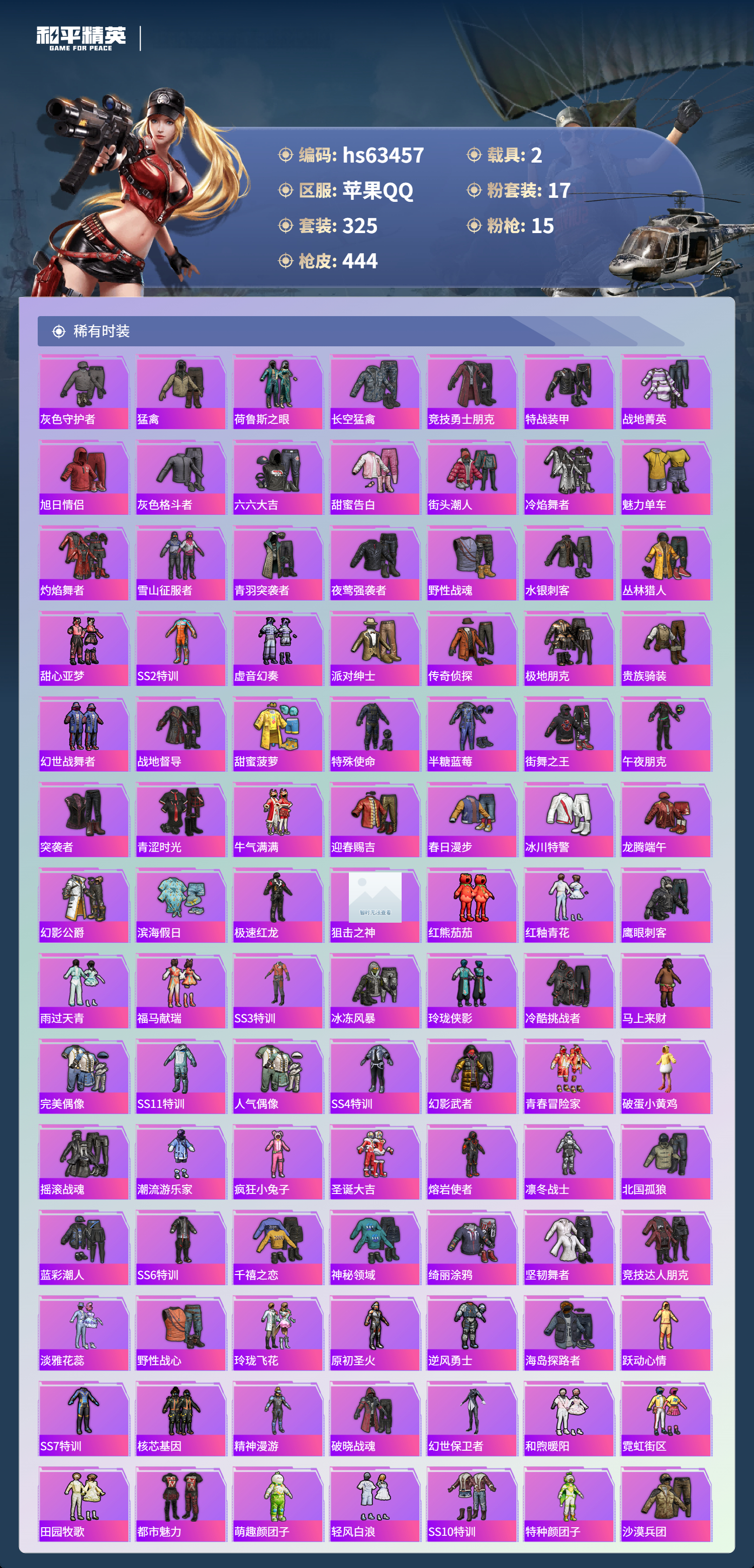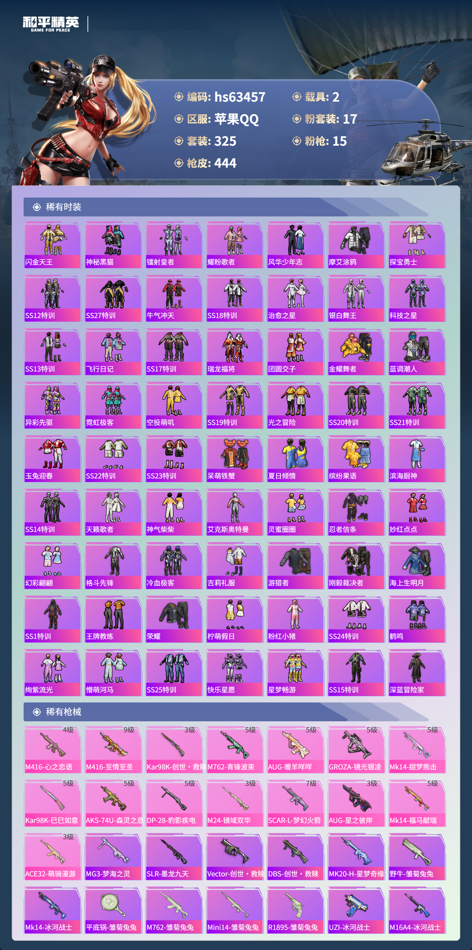 hs63457 苹果手Q-20王牌印记-17粉装-15特效枪-2载具-热力值-325套装-444枪皮-5卓越印记-2传奇印记