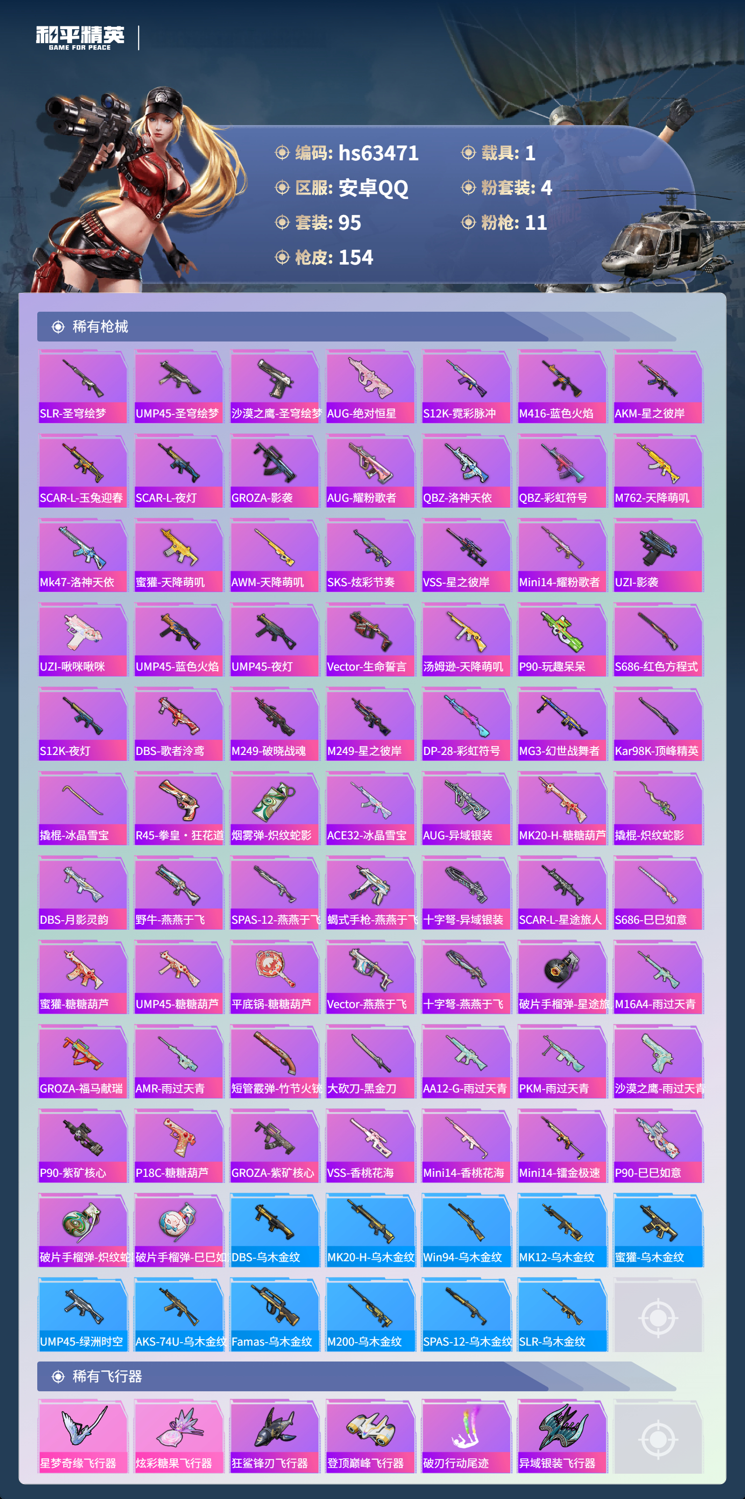 hs63471 安卓手Q-6王牌印记-4粉装-11特效枪-1载具-45271热力值-95套装-154枪皮-1卓越印记