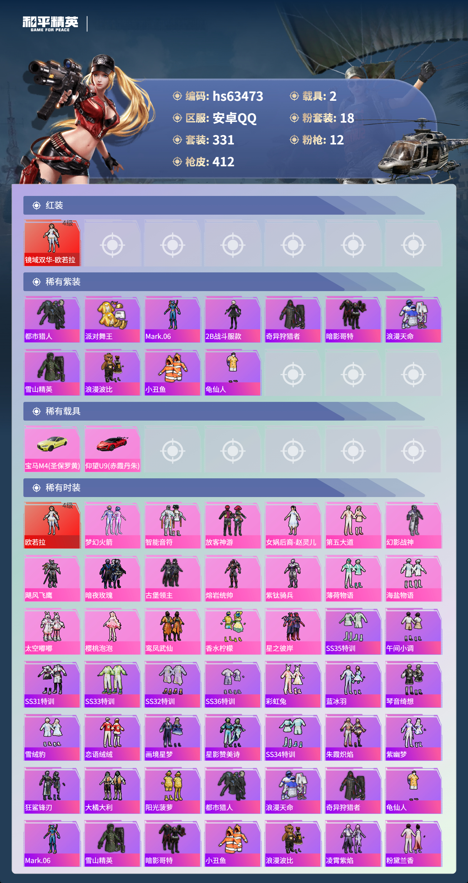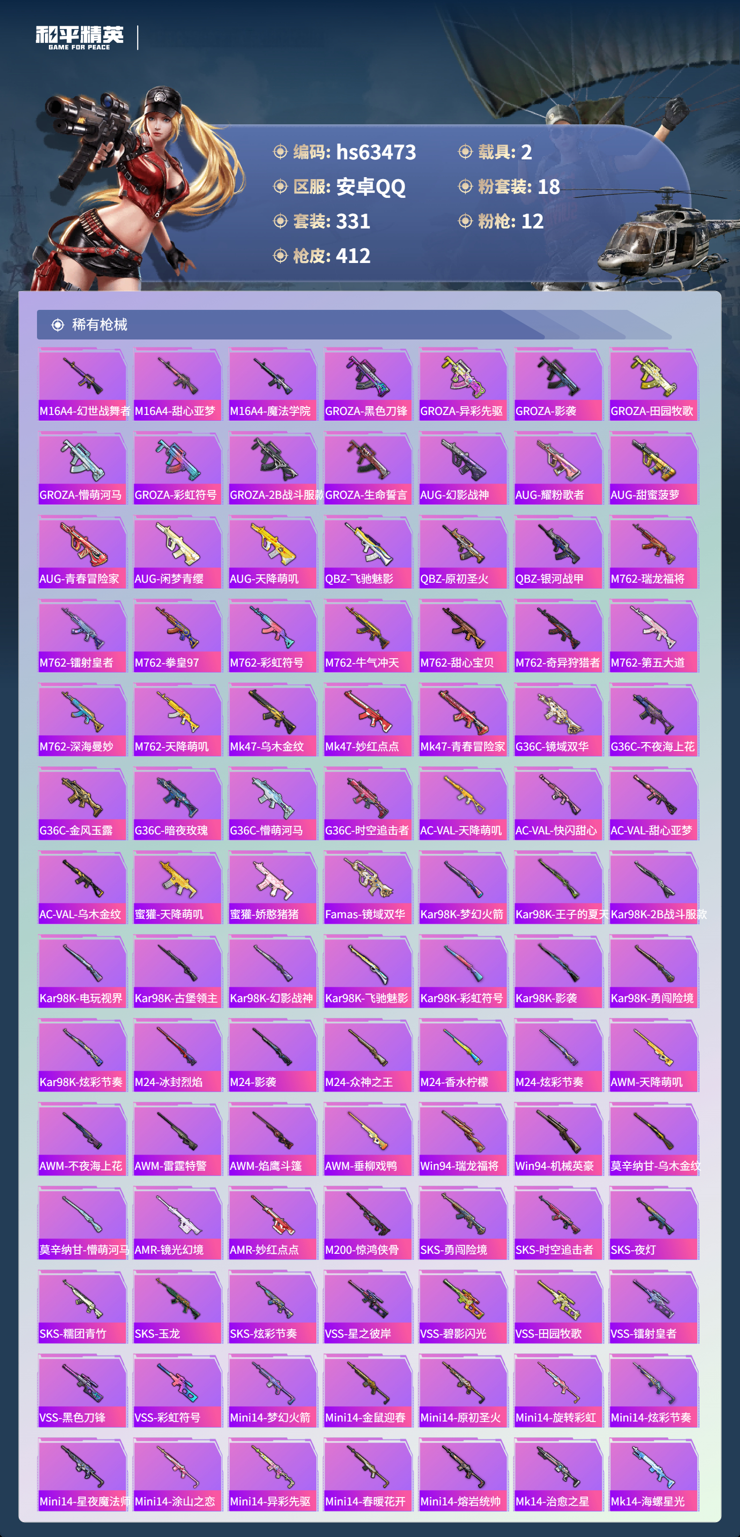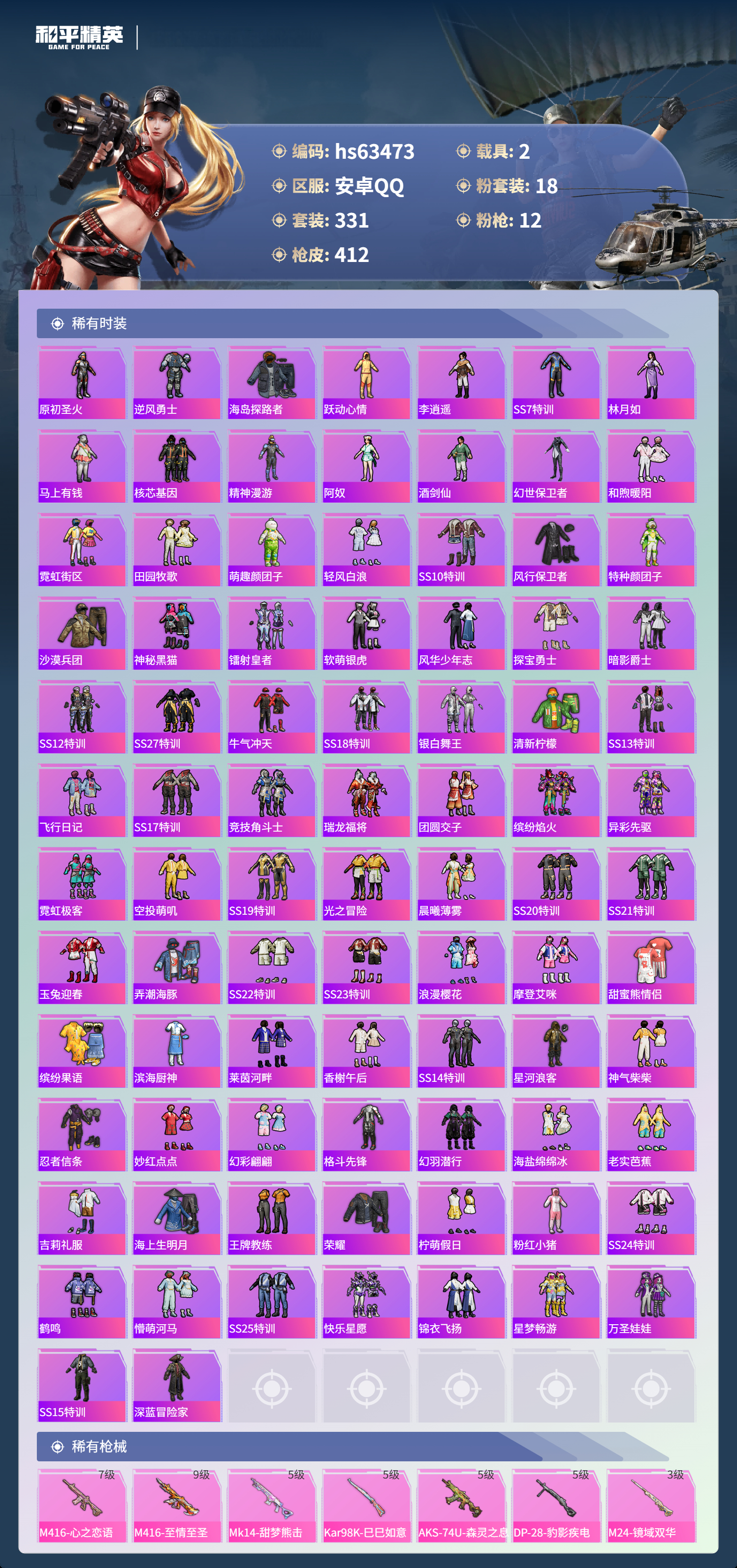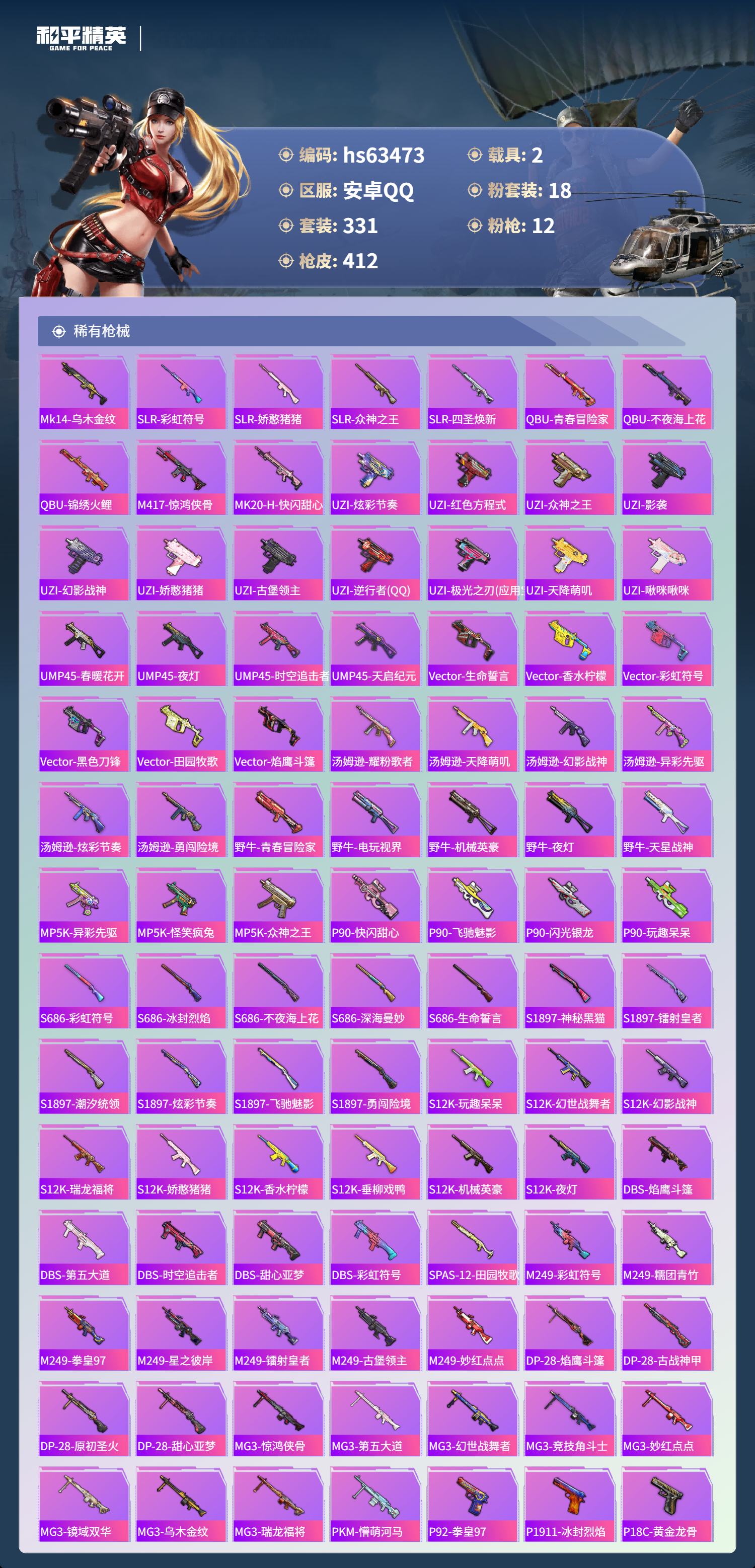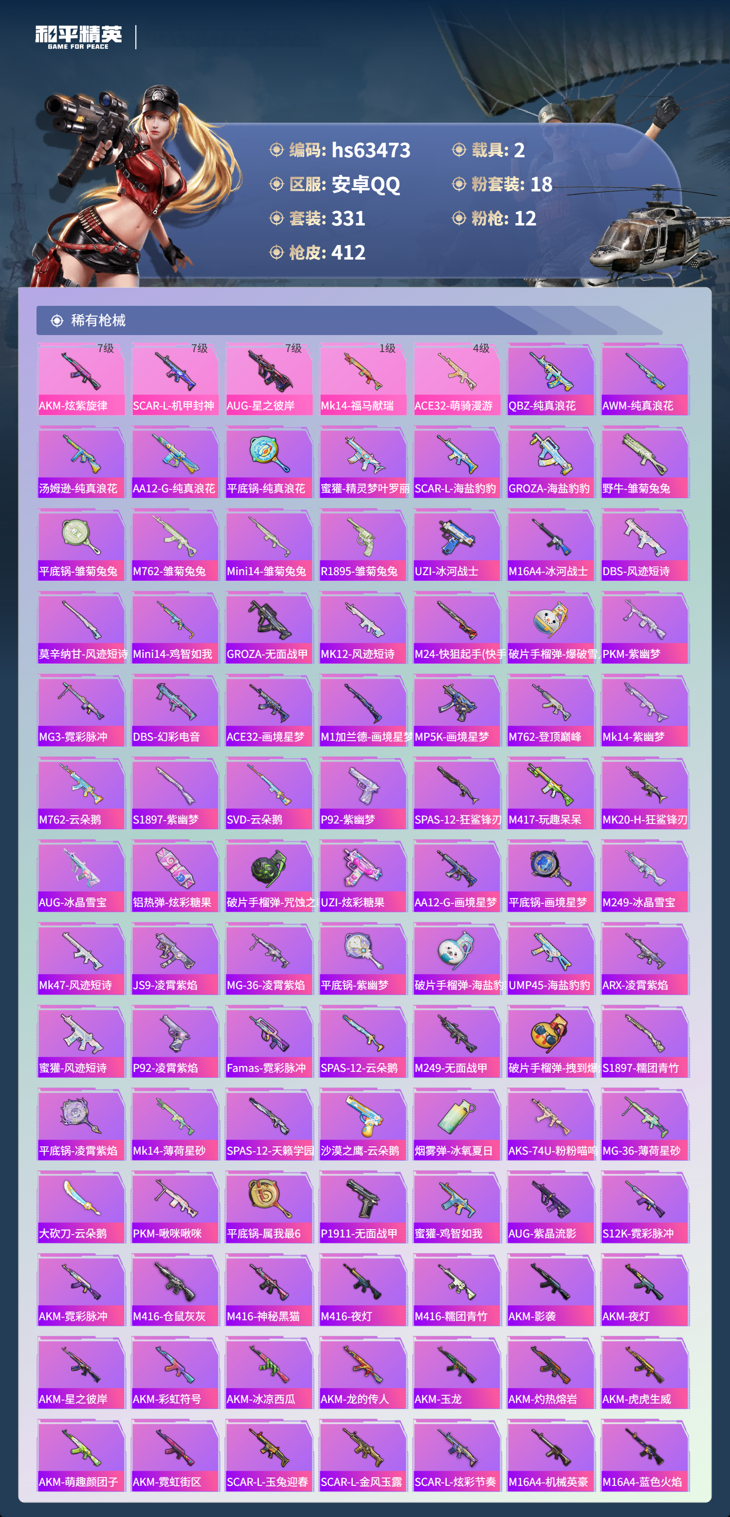 hs63473 安卓手Q-25王牌印记-1红装-18粉装-12特效枪-2载具-热力值-331套装-412枪皮-5卓越印记-1传奇印记
