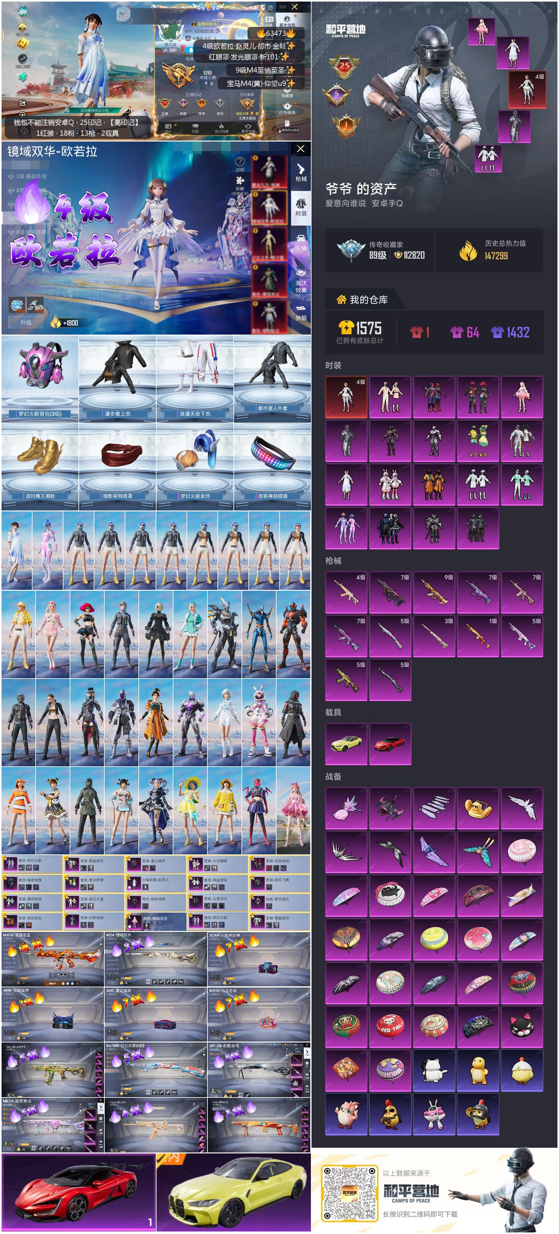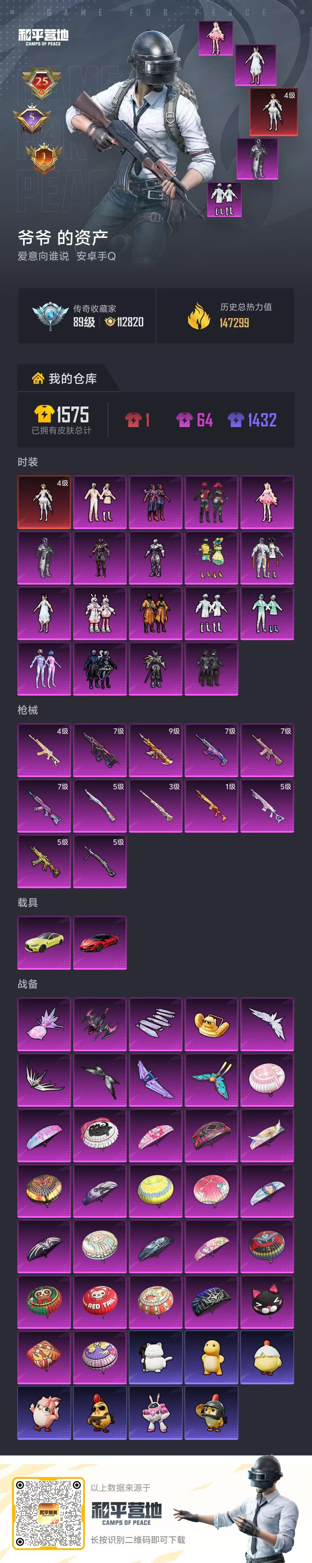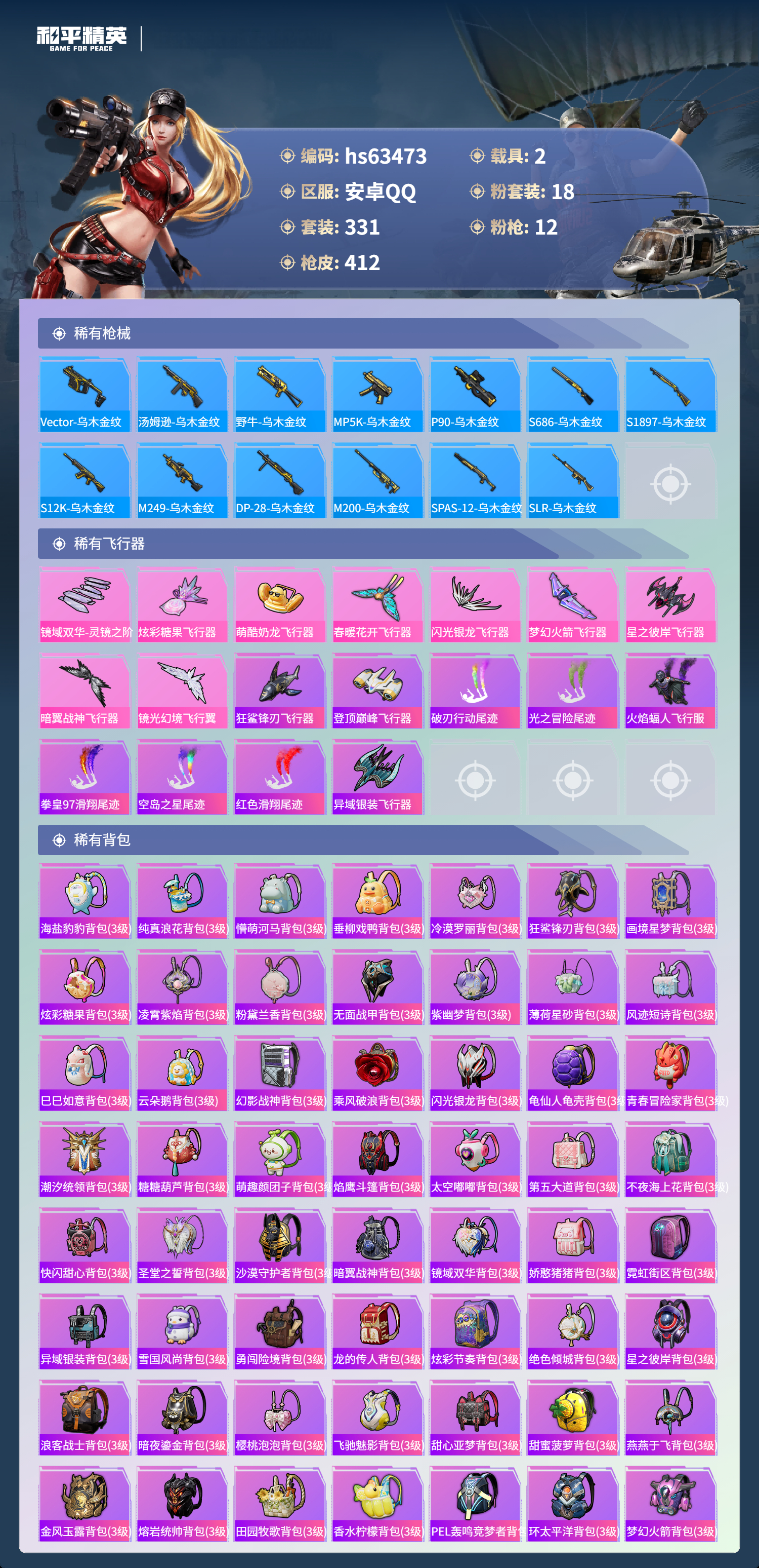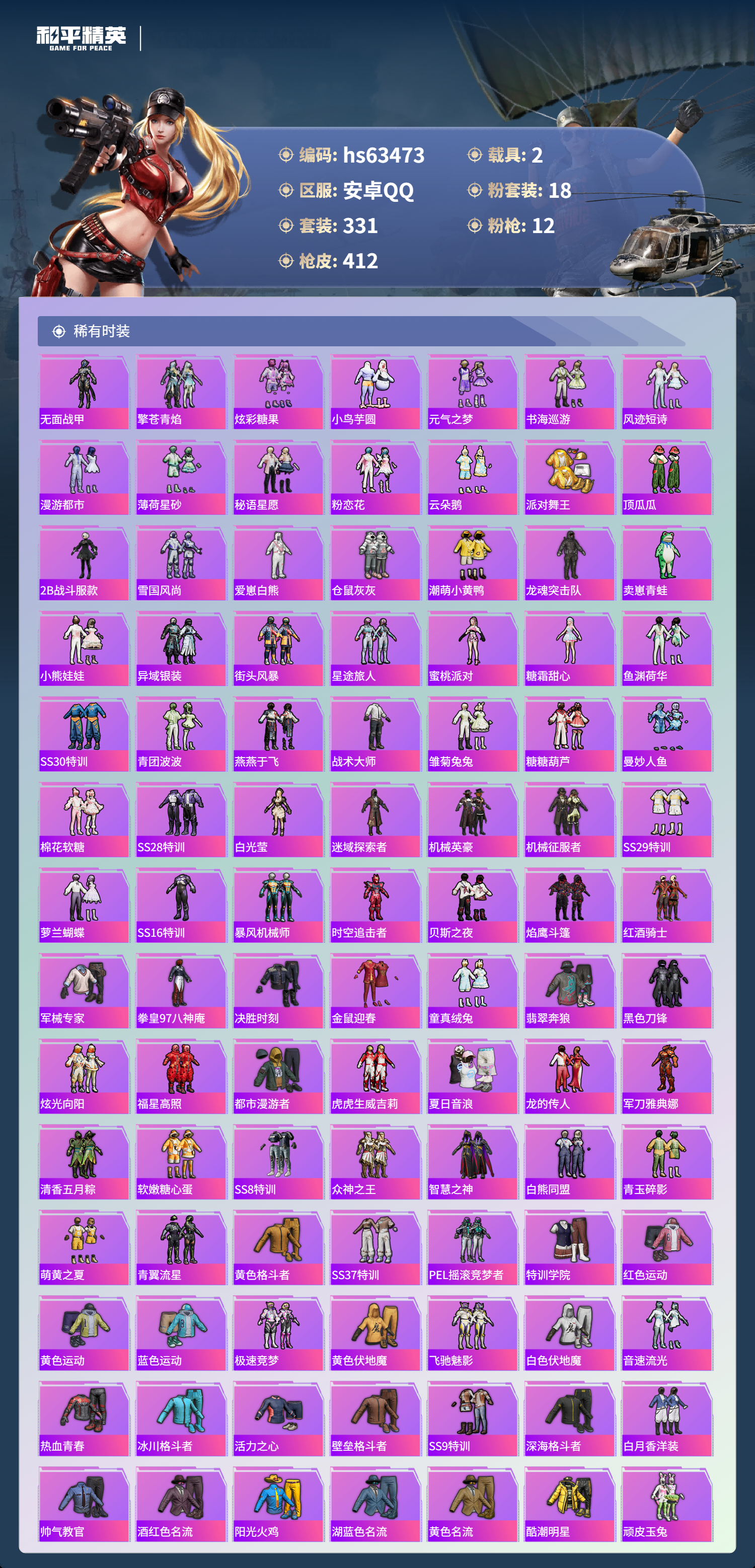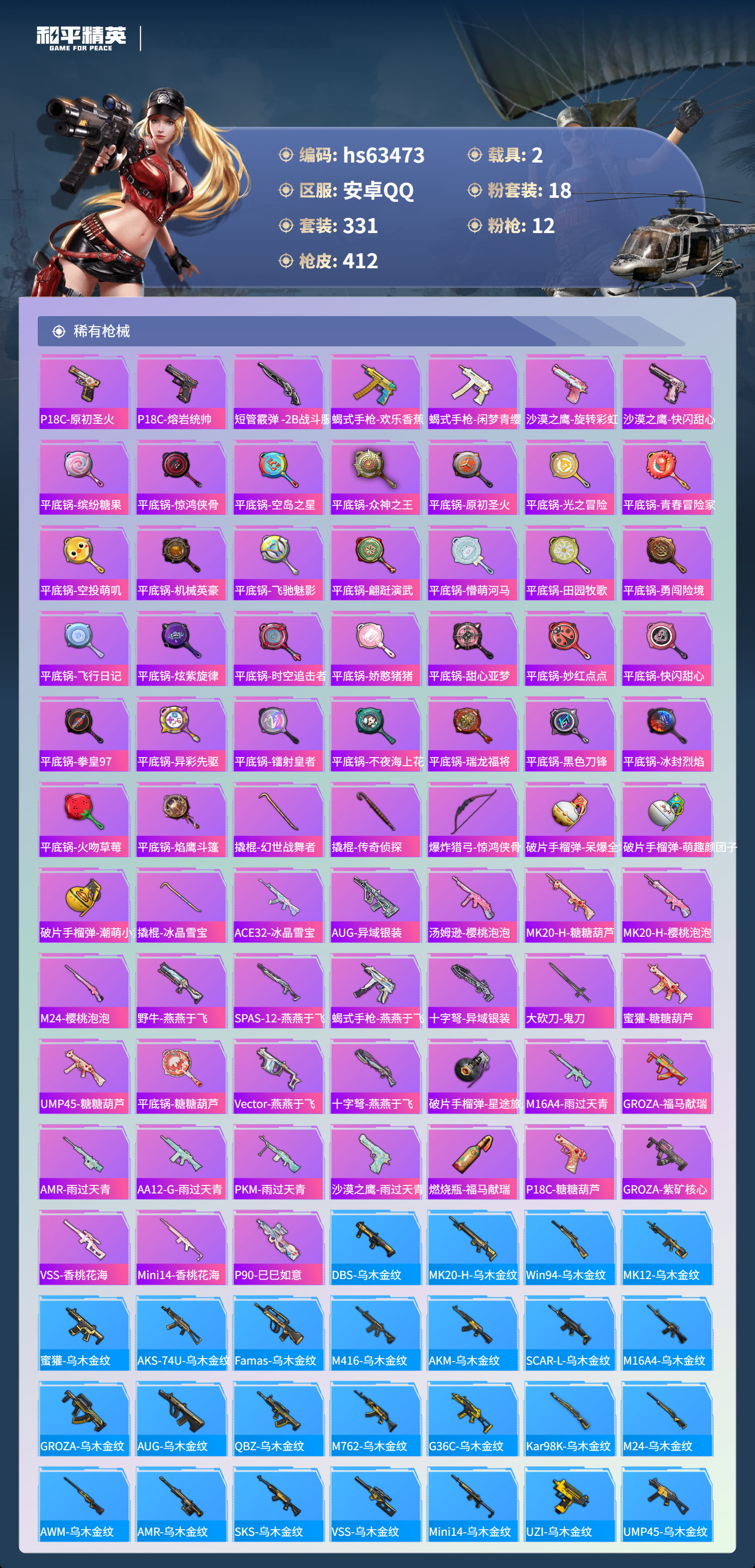 hs63473 安卓手Q-25王牌印记-1红装-18粉装-12特效枪-2载具-热力值-331套装-412枪皮-5卓越印记-1传奇印记