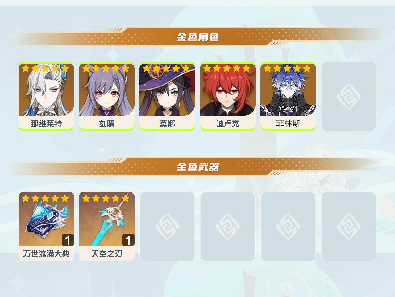 【YSYT1000】49级/7黄/女主/5个五星角色/2个五星武器/那维莱特/0命菲林斯/刻晴/迪卢克/莫娜/万世流涌大典/天空之刃