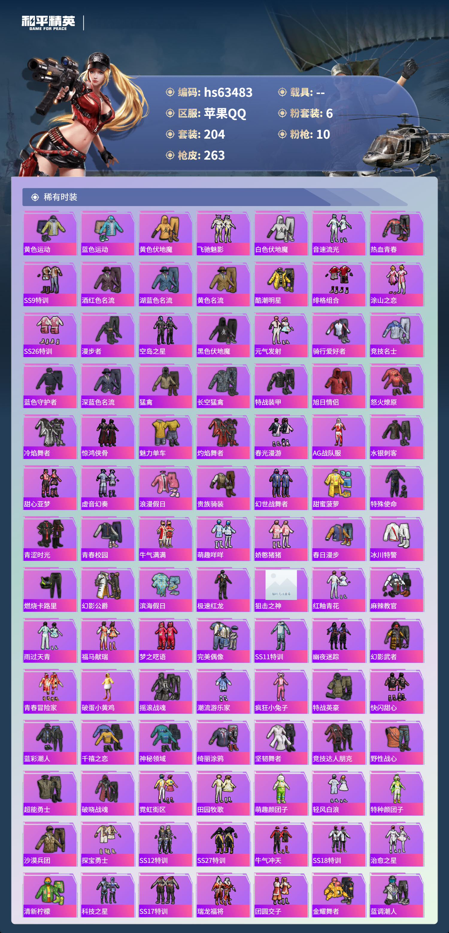 hs63483 苹果手Q-21王牌印记-6粉装-10特效枪-82122热力值-204套装-263枪皮-3卓越印记-3传奇印记