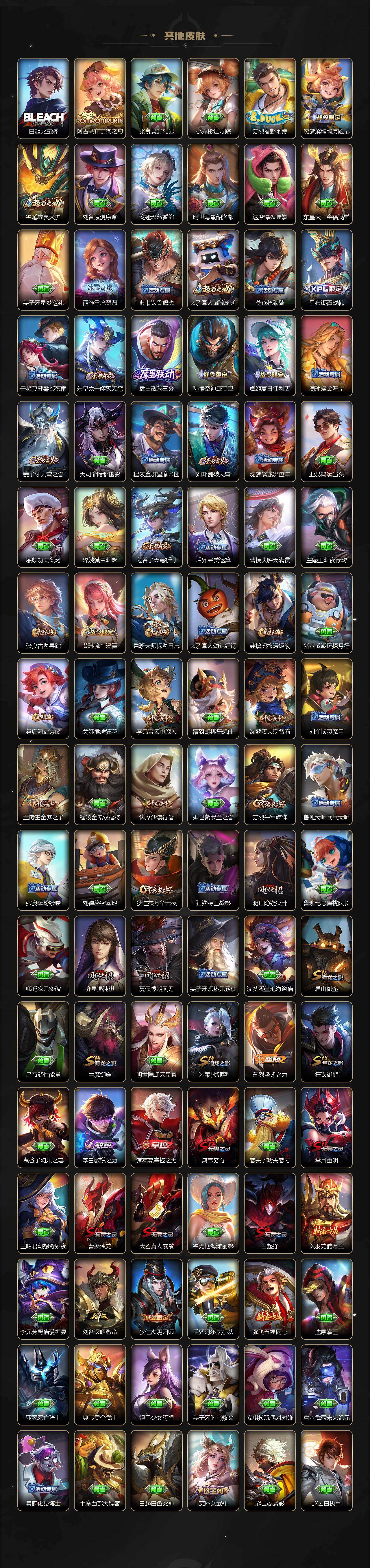 【传说皮肤】:虞姬愿照岁时盈,桑启鸣野蒿,典韦战鼓燎原,吕布怒海麟威,孙策末日机甲,花木兰冠军飞将,孙尚香末日机甲,宫本武藏地狱之眼,狄仁杰超时空战士