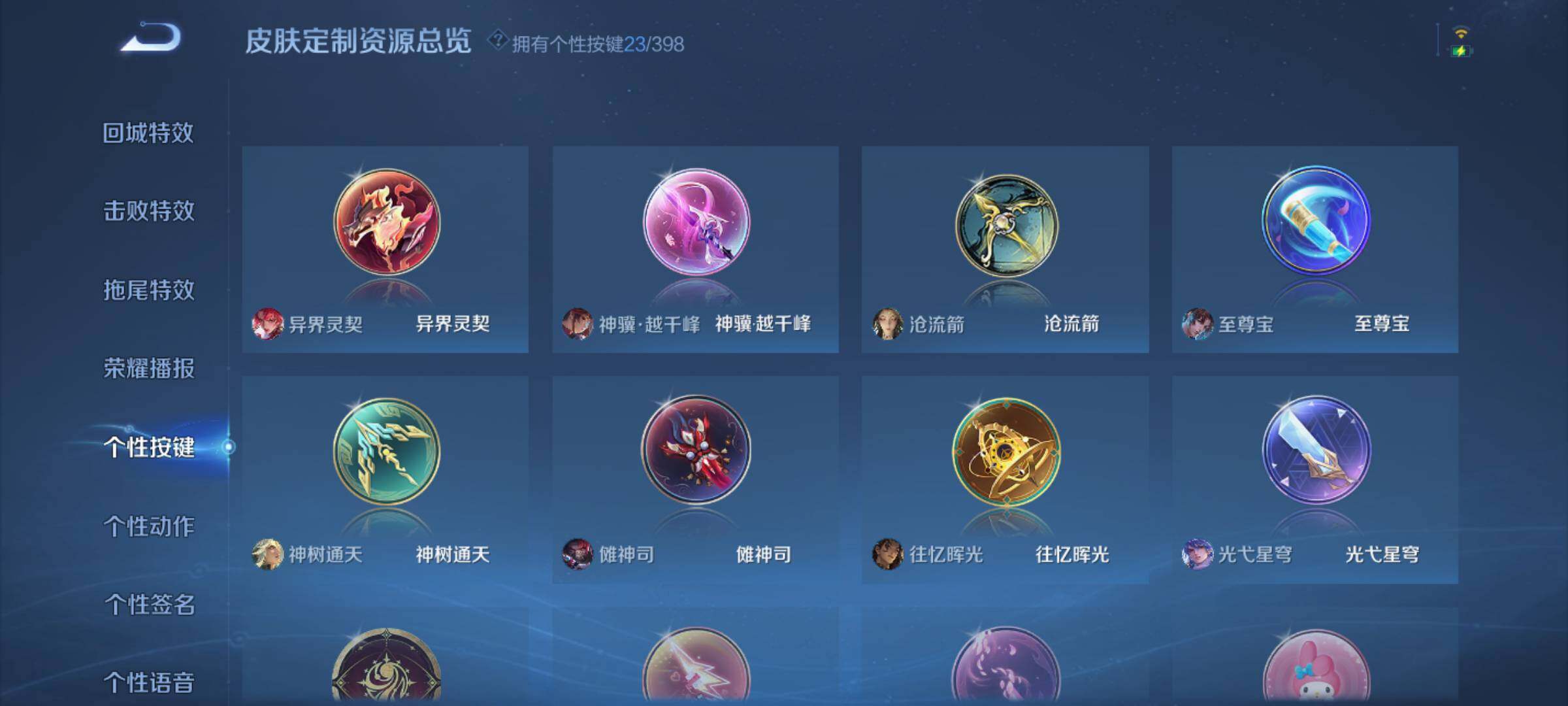 【传说皮肤】:云缨神骥越千峰,花木兰异界灵契,后羿神树通天,公孙离云诺千山,妲己愿照众生和,澜愿照九州拓,桑启鸣野蒿,典韦战鼓燎原,澜逐花归海,李信山海炽霜斩,马可波罗深海之息,铠绛天战甲,虞姬启明星使,曜云鹰飞将,李信一念神魔,后羿黄金射