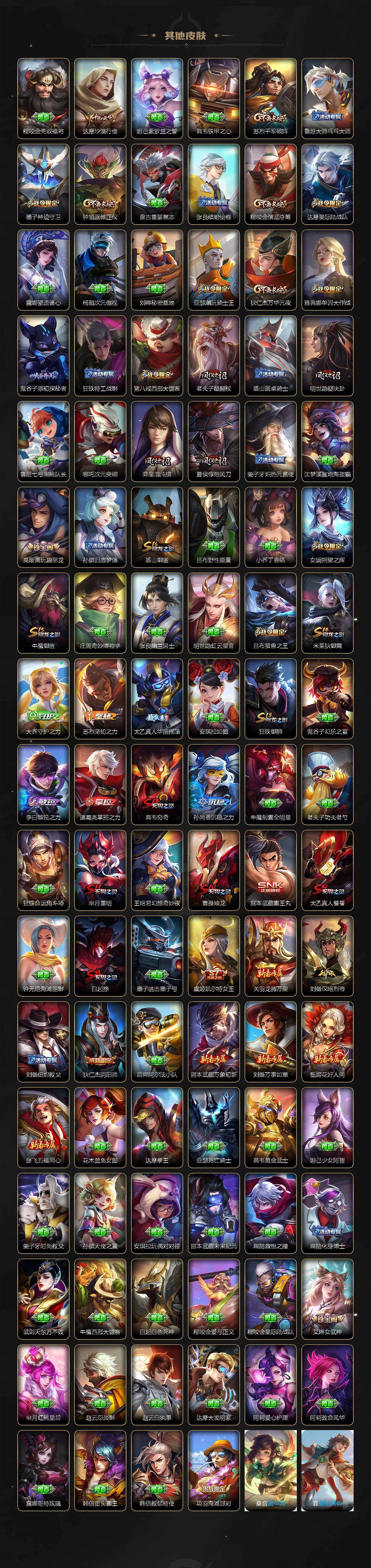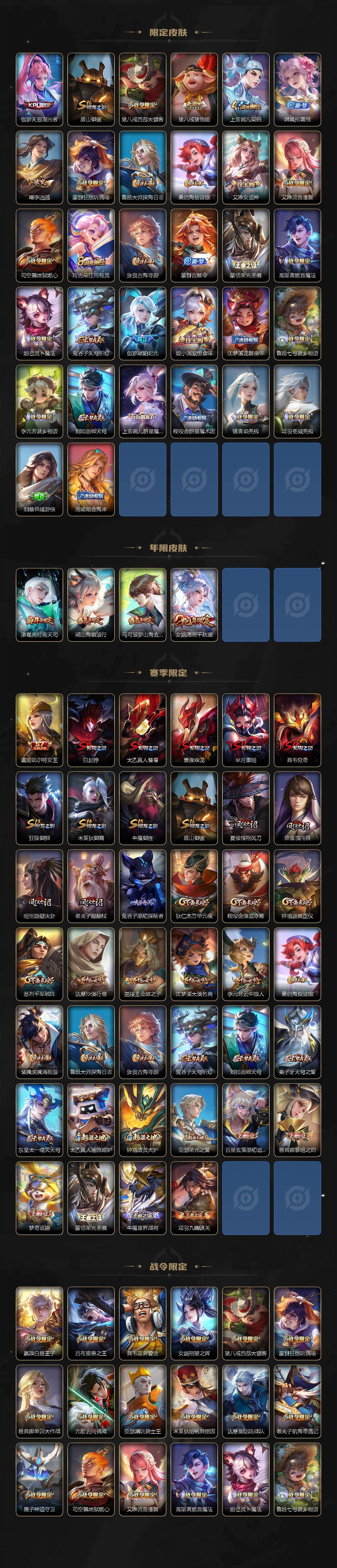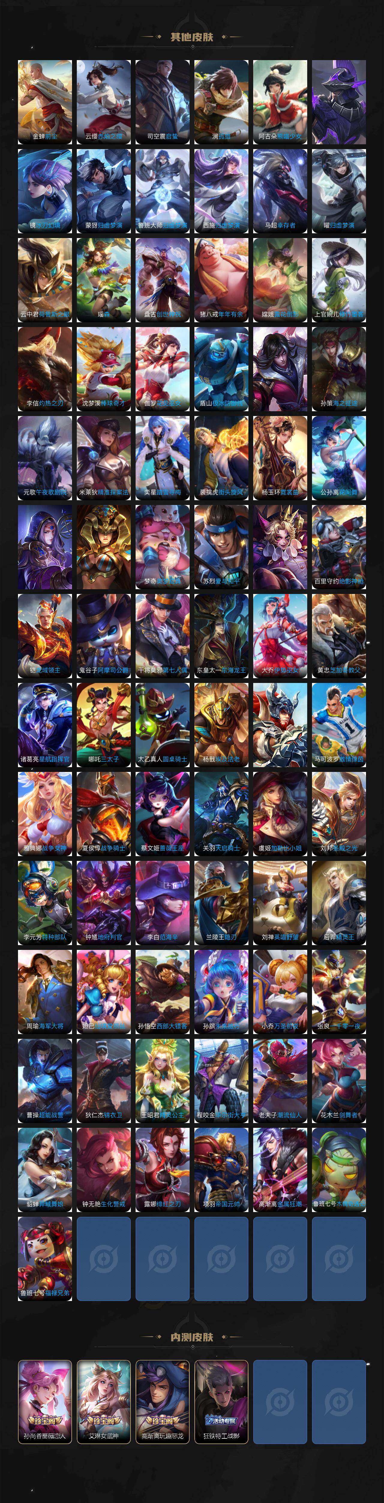 【传说皮肤】:女娲愿照千秋盛,桑启鸣野蒿,澜逐花归海,马超无双飞将,王昭君乞巧织情,西施游龙清影,曜李逍遥 ,周瑜音你心动,小乔音你心动,诸葛亮时雨天司,镜炽阳神光,虞姬启明星使,曜云鹰飞将,虞姬云霓雀翎,花木兰冠军飞将,梦奇胖达荣荣