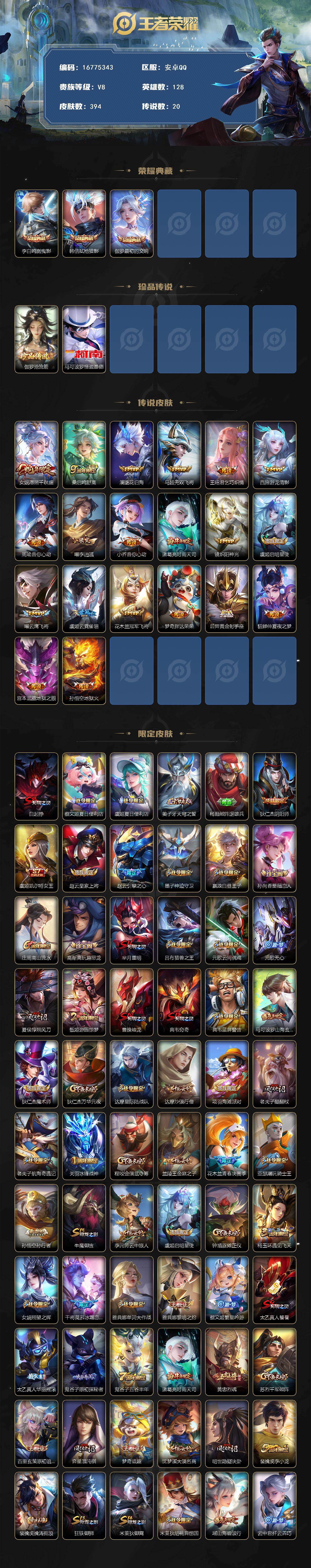 安卓Q-V8-最强王者段位-128英雄-394皮肤-3典藏皮肤-2珍品传说-20