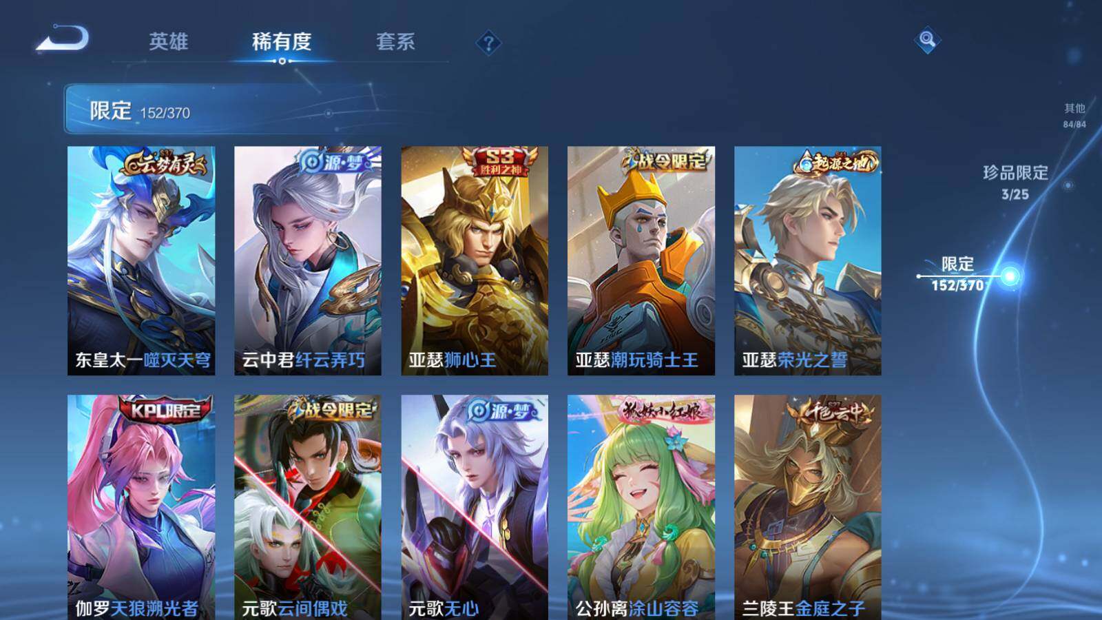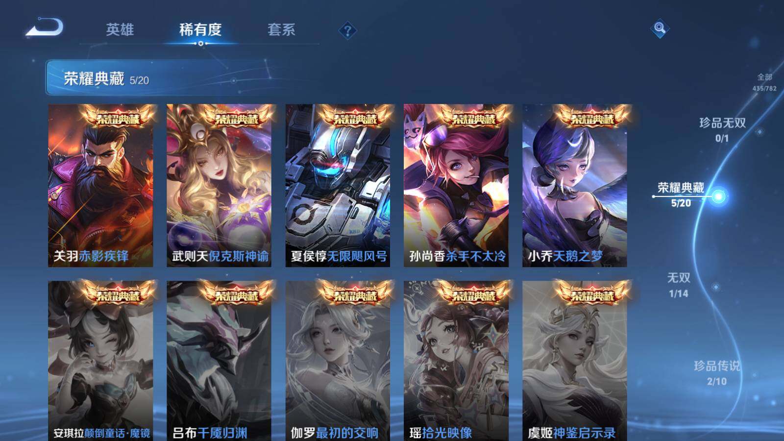 苹果Q-V10-最强王者段位-128英雄-435皮肤-5典藏皮肤-1典藏英雄-1无双-2珍品传说-33传说-127史诗