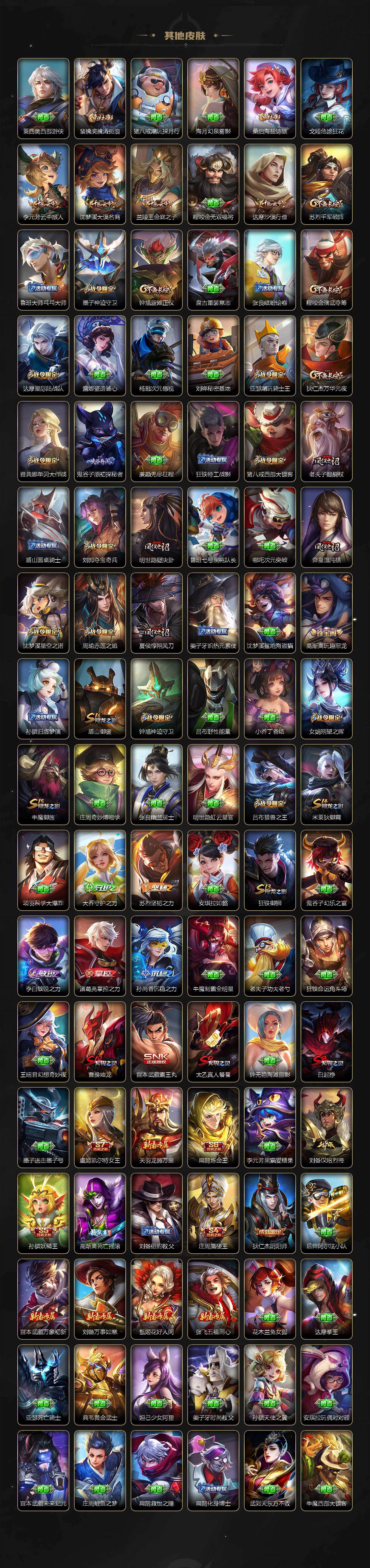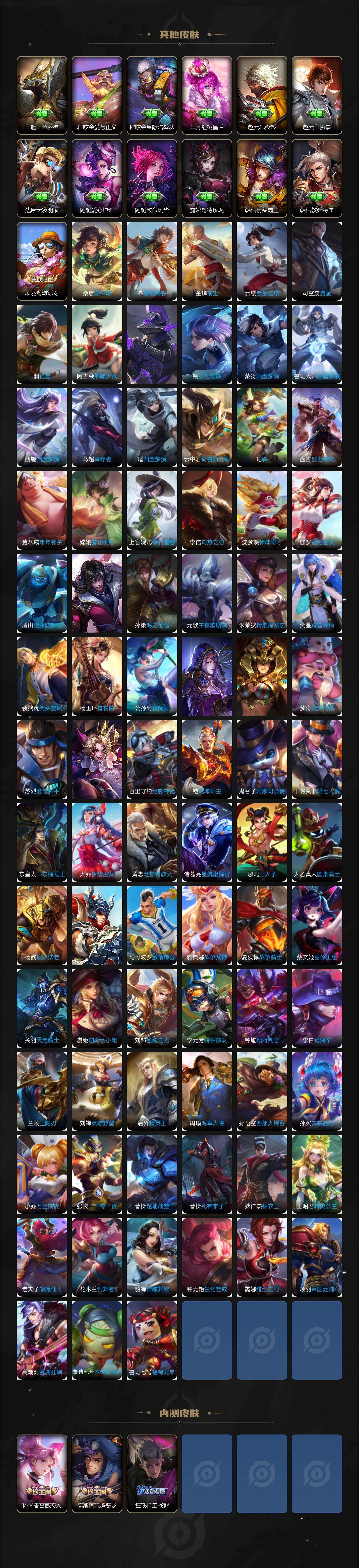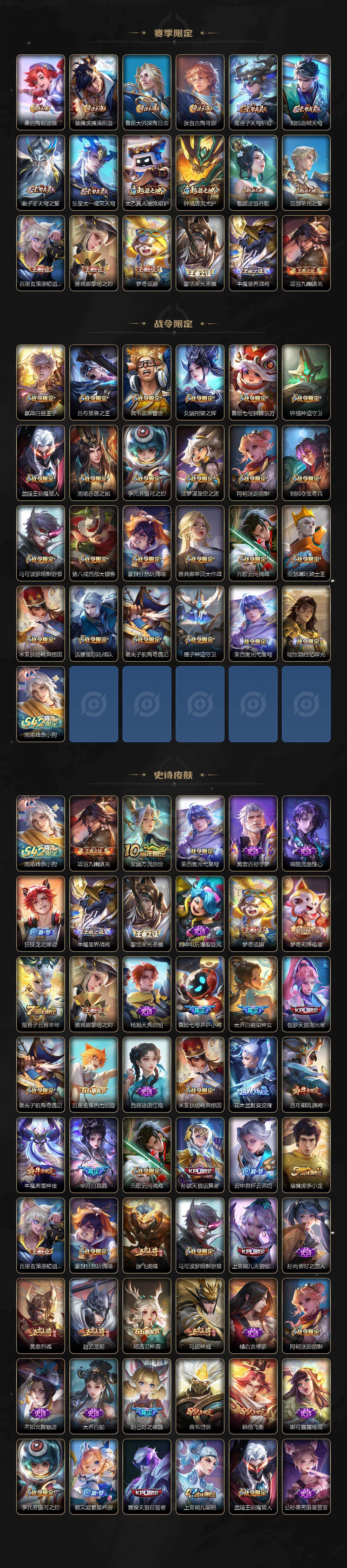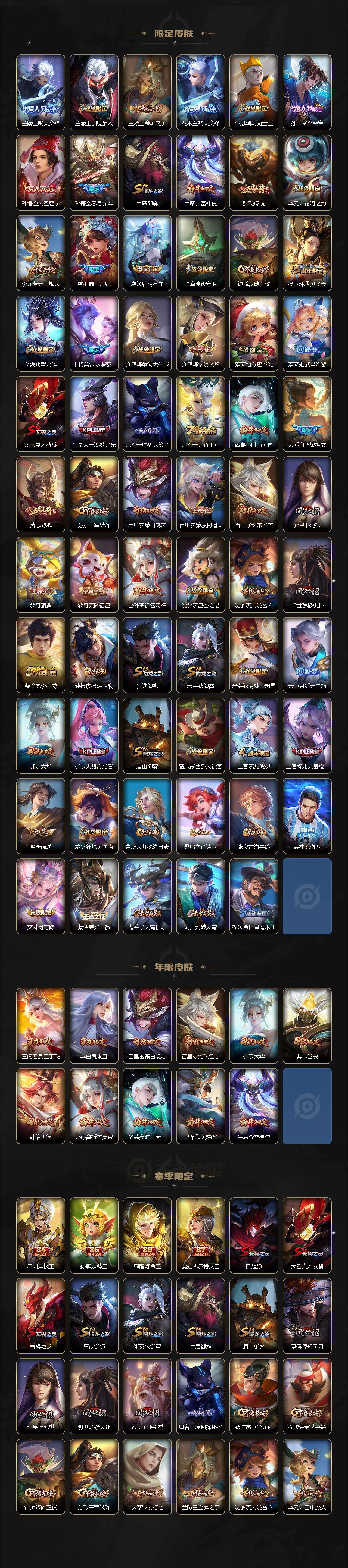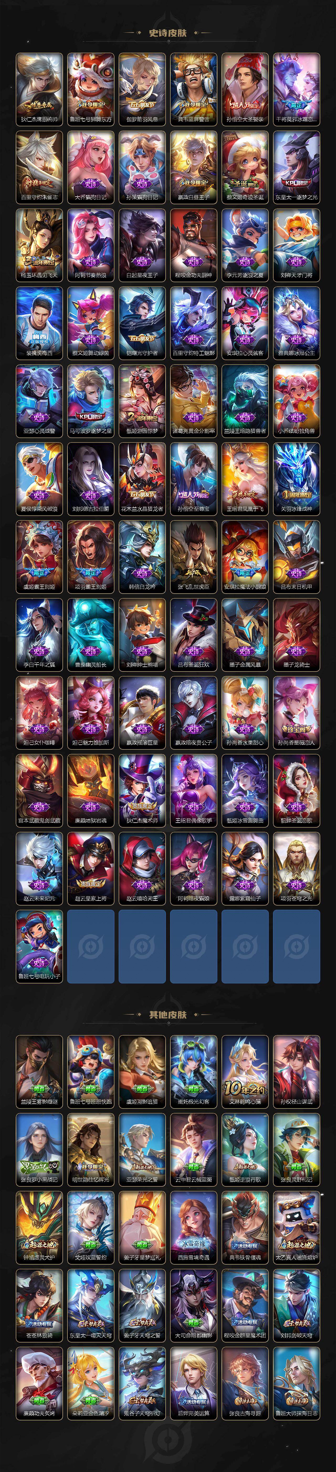 【荣耀典藏】:武则天英雄,孙悟空全息碎影,武则天倪克斯神谕,夏侯惇无限飓风号,小乔天鹅之梦,孙尚香杀手不太冷,鲁班七号星空梦想,芈月大秦宣太后,程咬金活力突击,李白鸣剑曳影,诸葛亮星域神启,花木兰九霄神辉
