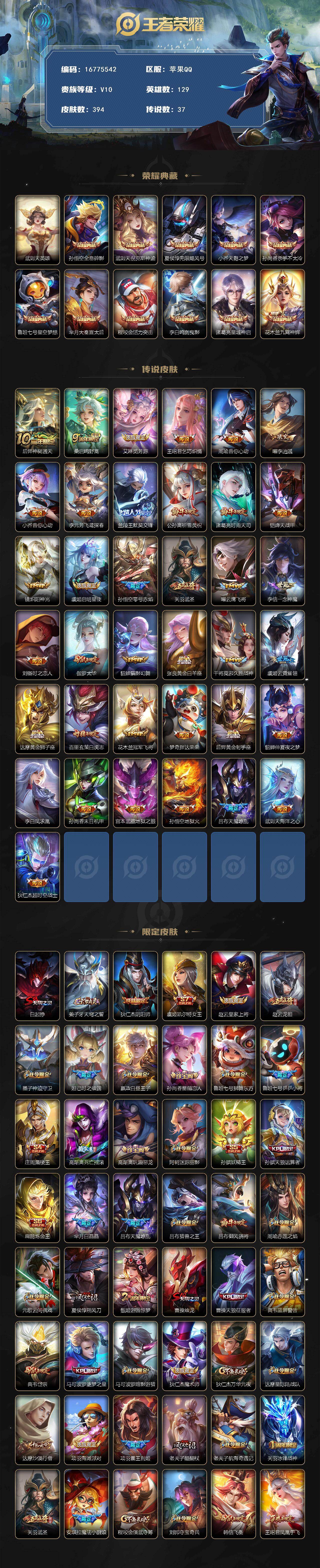 苹果Q-V10-最强王者段位-129英雄-394皮肤-11典藏皮肤-1典藏英雄-37传说-120史诗
