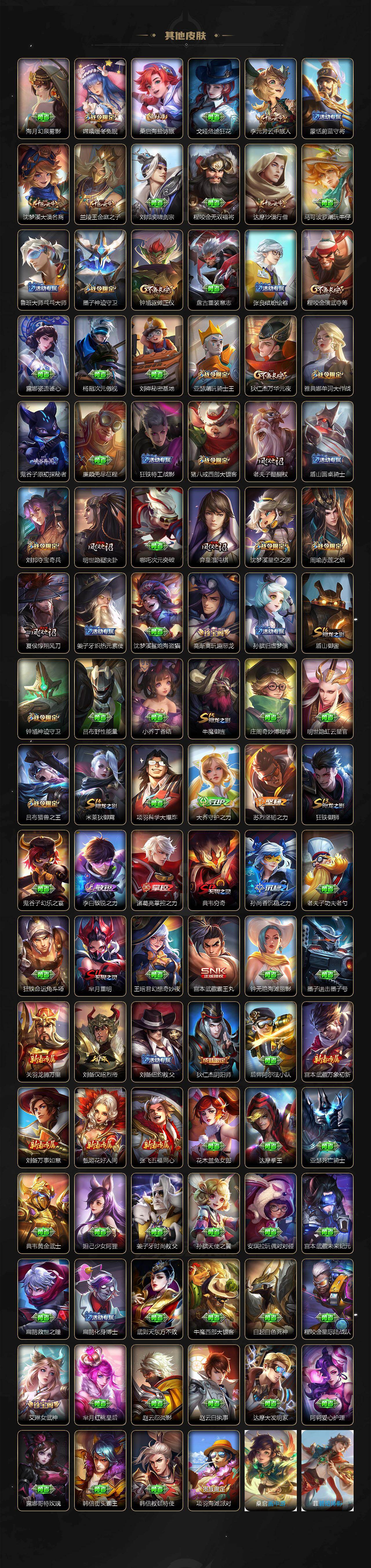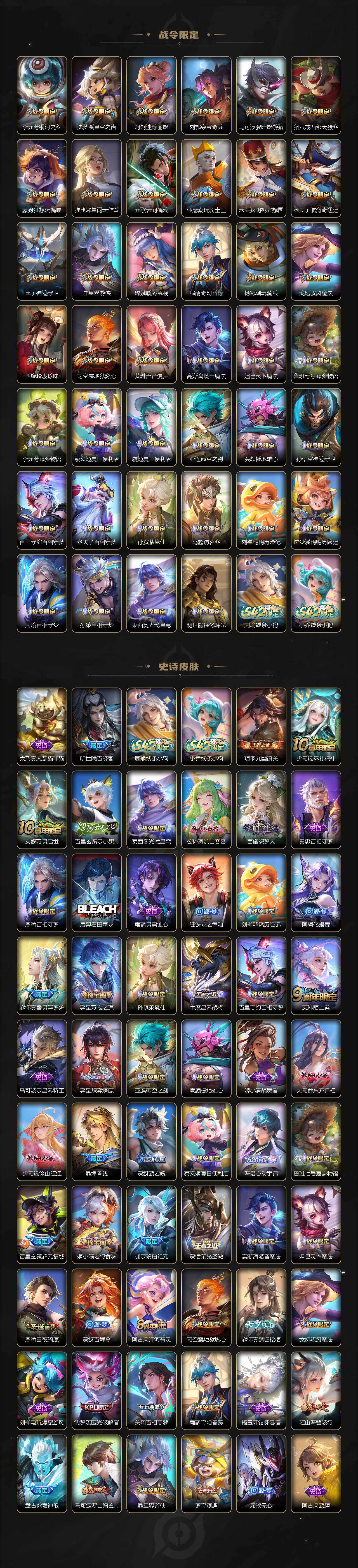 【英雄全皮】:周瑜全皮,刘邦全皮,孙权全皮,艾琳全皮,鬼谷子全皮,铠全皮,沈梦溪全皮,猪八戒全皮,敖隐全皮,蒙恬全皮,澜全皮,阿古朵全皮,夏洛特全皮,赵怀真全皮,戈娅全皮,空空儿全皮,影全皮,海诺全皮,少司缘全皮