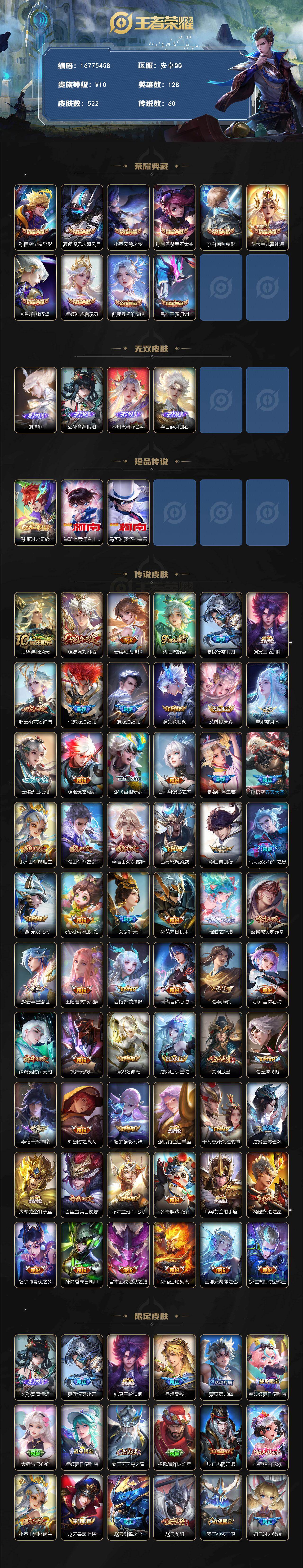 安卓Q-V10-最强王者段位-128英雄-522皮肤-10典藏皮肤-4无双-3珍品传说-60传说-178史诗