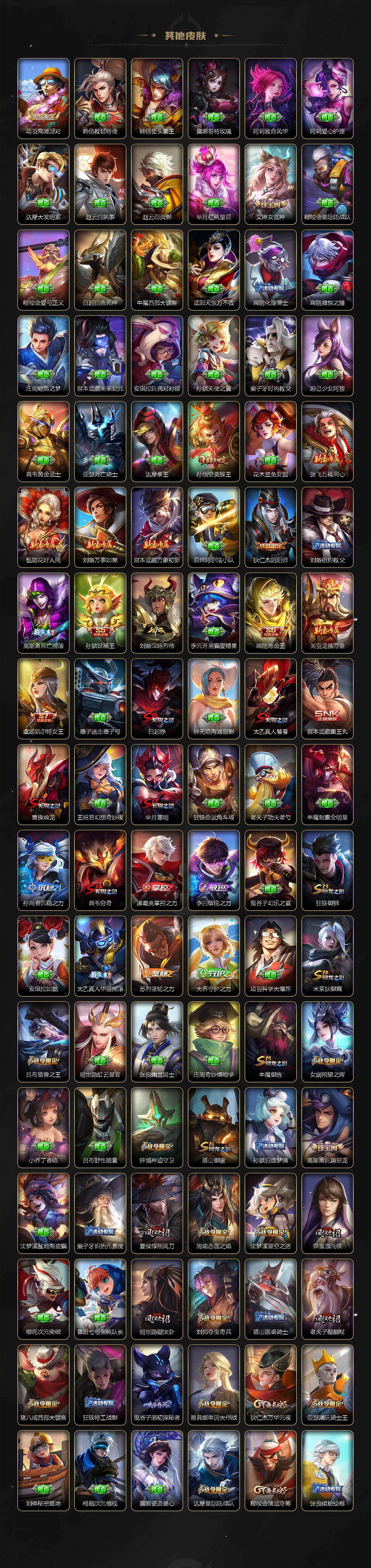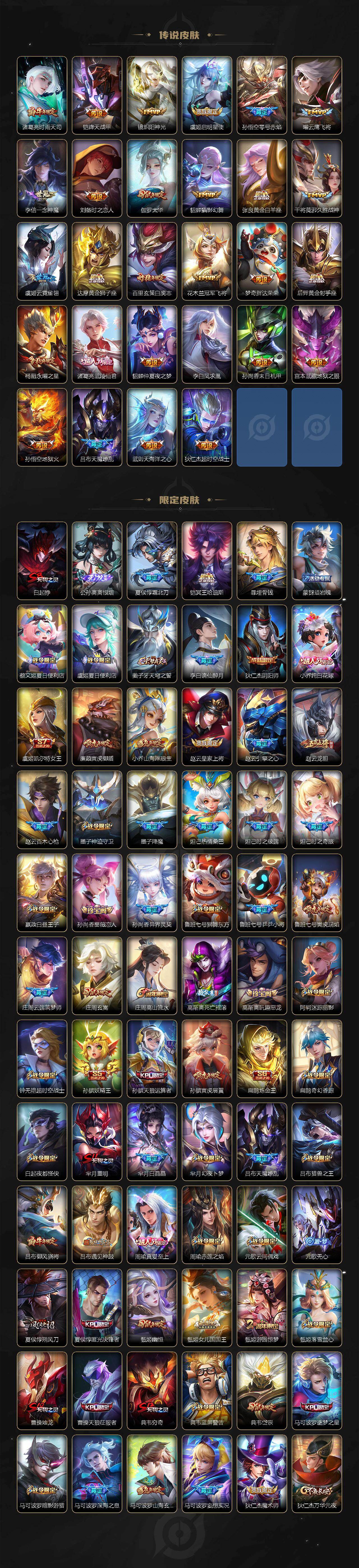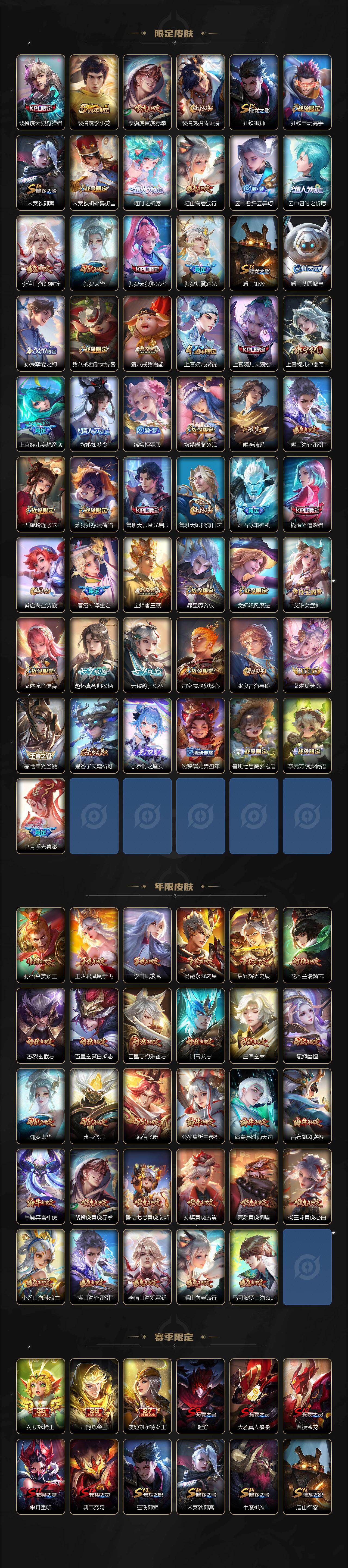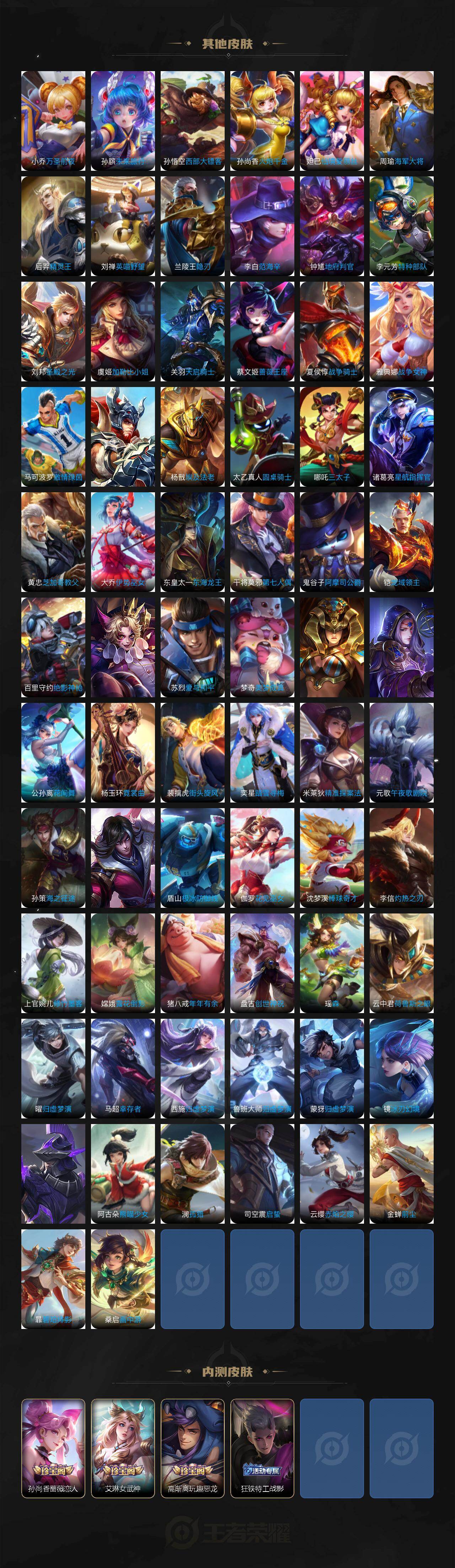 【英雄全皮】:刘禅全皮,阿轲全皮,孙膑全皮,扁鹊全皮,芈月全皮,夏侯惇全皮,马可波罗全皮,武则天全皮,姜子牙全皮,艾琳全皮,娜可露露全皮,橘右京全皮,东皇太一全皮,苏烈全皮,百里守约全皮,梦奇全皮,沈梦溪全皮,狂铁全皮,米莱狄全皮,盾山全皮,猪八戒全皮,鲁班大师全皮,夏洛特全皮,金蝉全皮,赵怀真全皮,戈娅全皮,影全皮