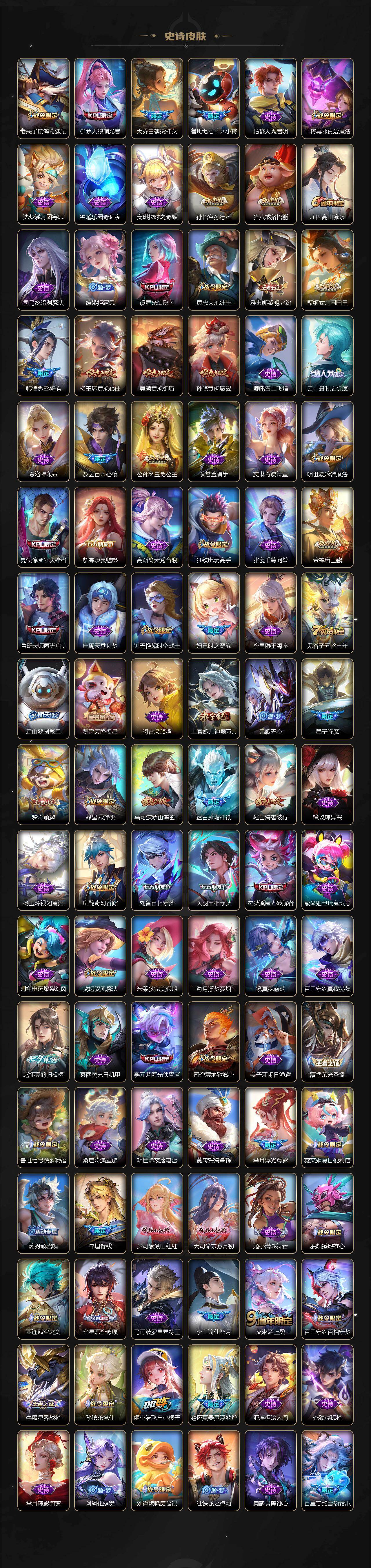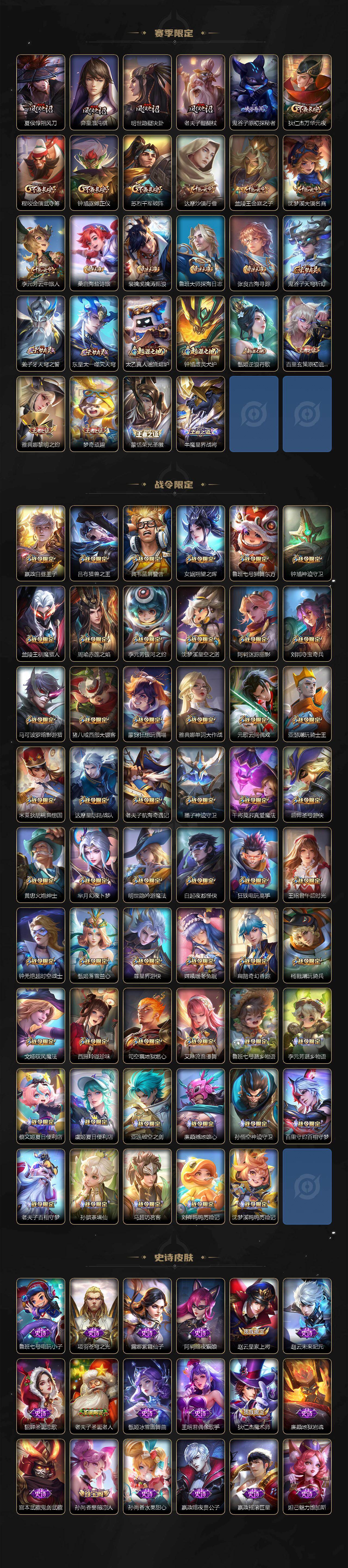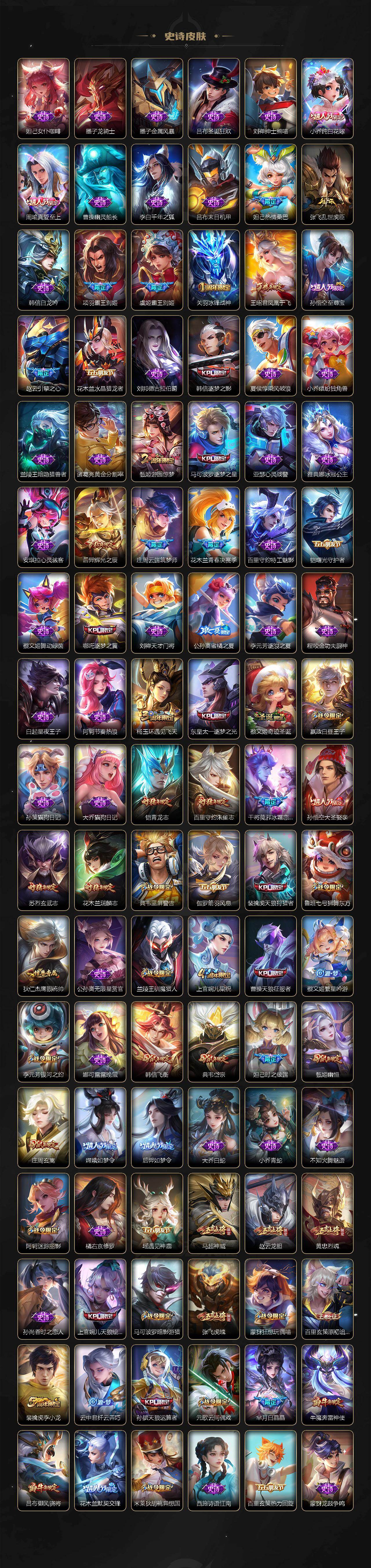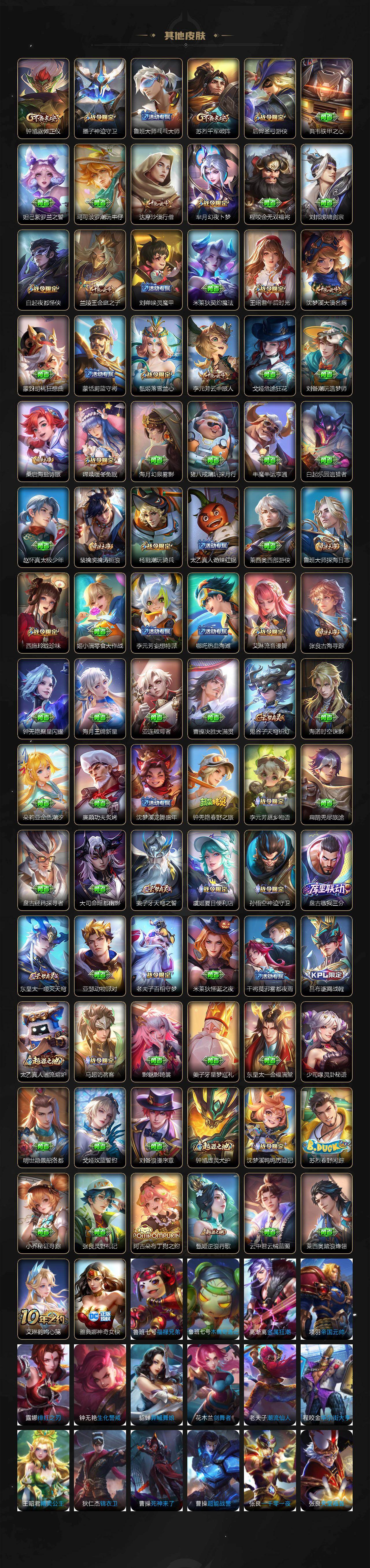 【英雄全皮】:刘禅全皮,阿轲全皮,孙膑全皮,扁鹊全皮,芈月全皮,夏侯惇全皮,马可波罗全皮,武则天全皮,姜子牙全皮,艾琳全皮,娜可露露全皮,橘右京全皮,东皇太一全皮,苏烈全皮,百里守约全皮,梦奇全皮,沈梦溪全皮,狂铁全皮,米莱狄全皮,盾山全皮,猪八戒全皮,鲁班大师全皮,夏洛特全皮,金蝉全皮,赵怀真全皮,戈娅全皮,影全皮