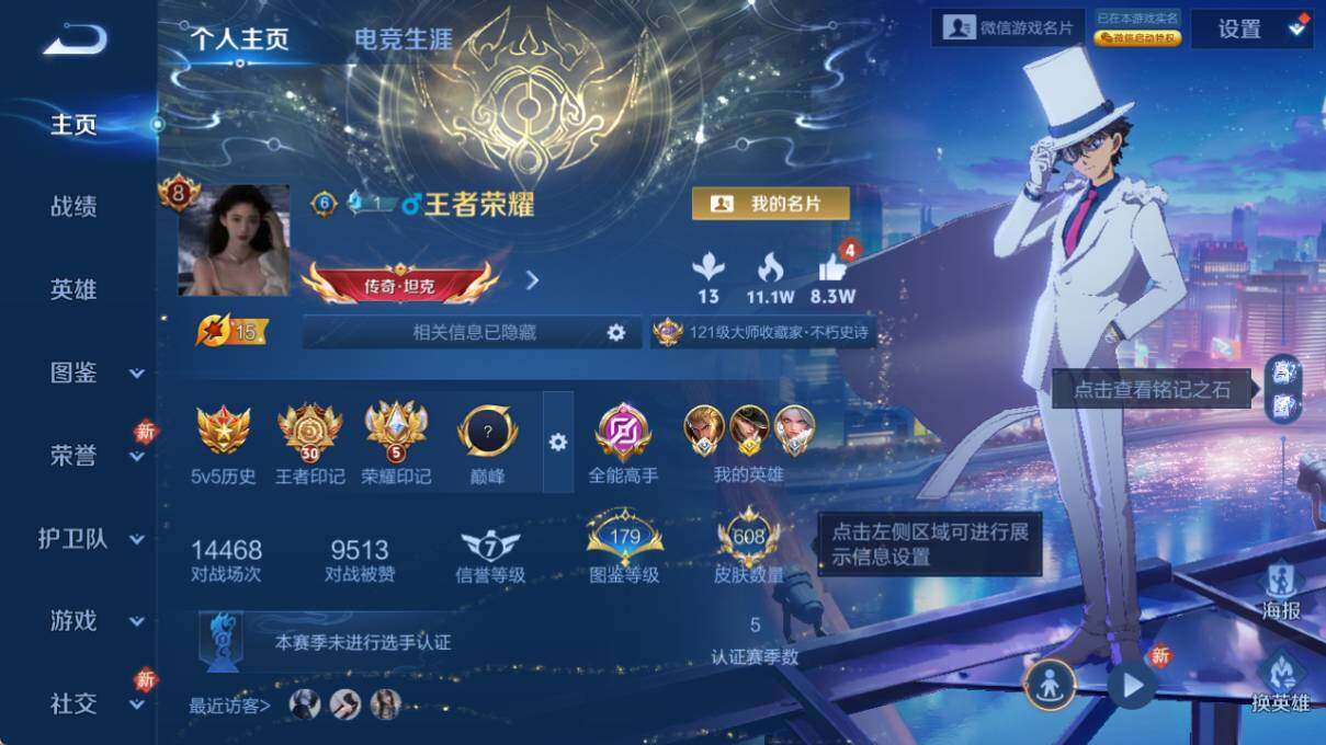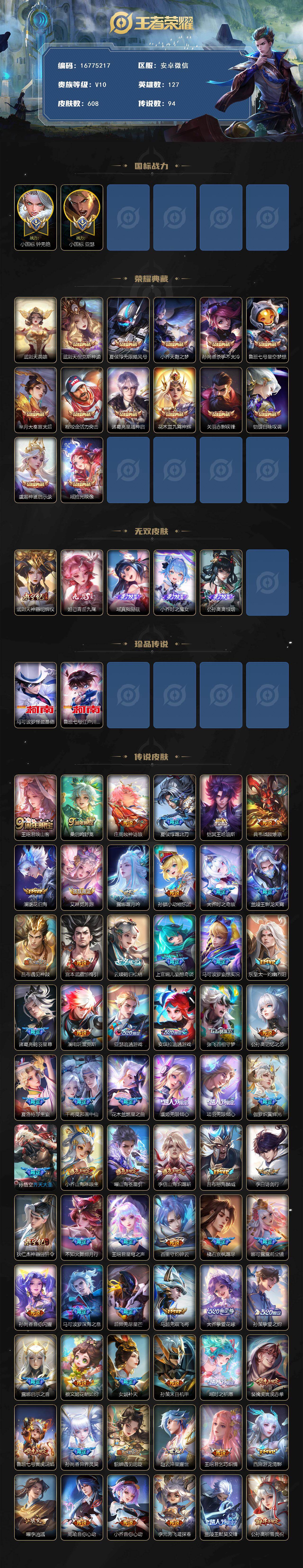 安卓WX-V8-至尊星耀I段位-127英雄-608皮肤-13典藏皮肤-1典藏英雄-5无双-2珍品传说-94传说-222史诗