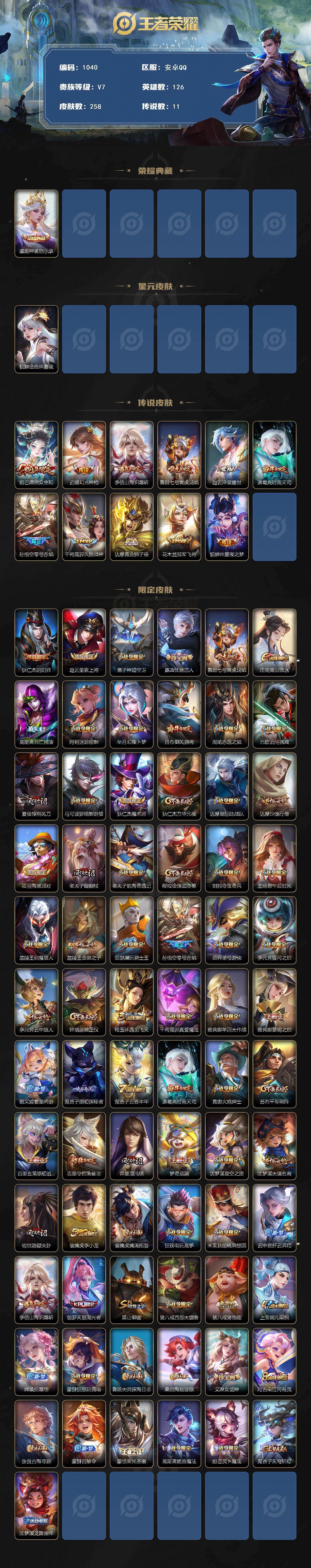 安卓Q-V0-尊贵铂金II段位-126英雄-258皮肤-1典藏皮肤-11传说-64史诗