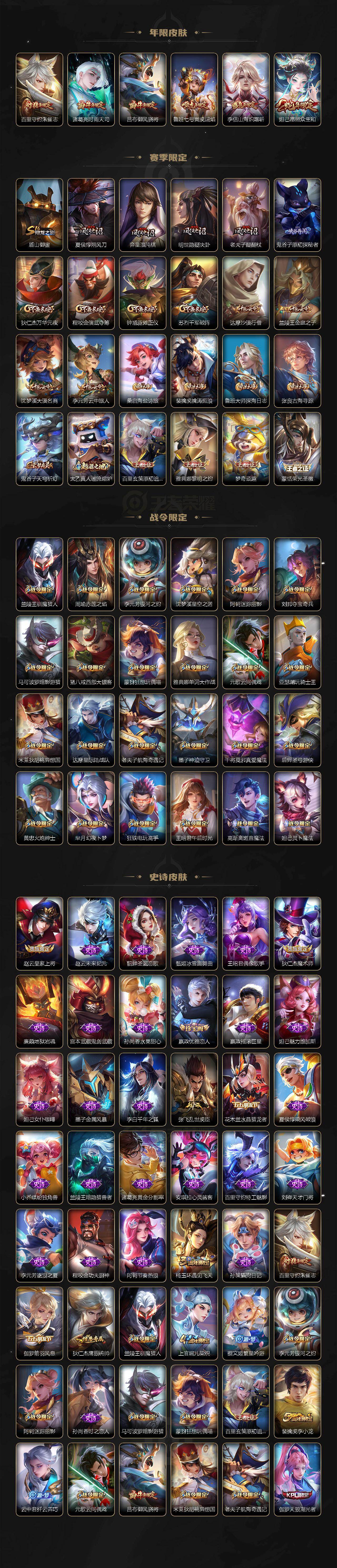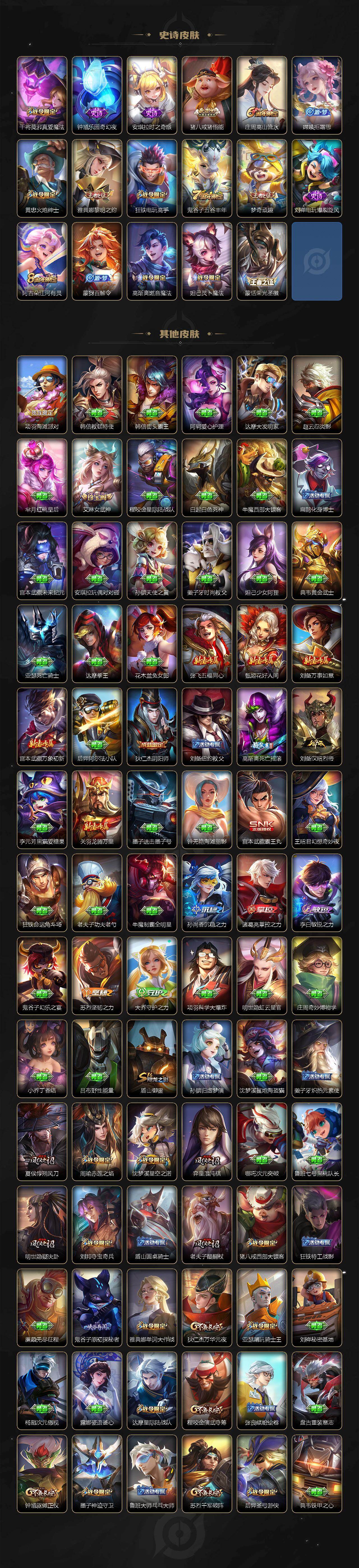 【限定皮肤】:狄仁杰阴阳师,赵云皇家上将,墨子神迹守卫,嬴政优雅恋人,鲁班七号寅虎瑞焰,庄周高山流水,高渐离死亡摇滚,阿轲迷踪丽影,芈月幻夜卜梦,吕布御风骁将,周瑜赤