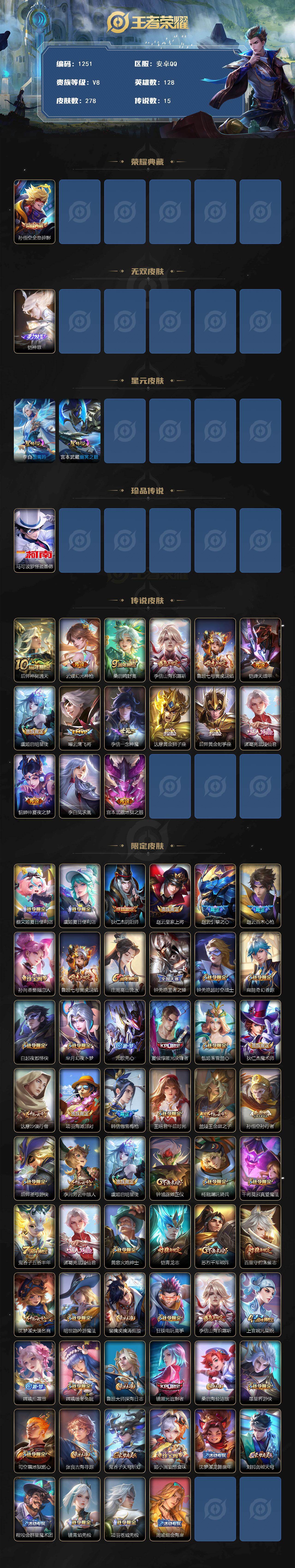 安卓Q-V5-至尊星耀IV段位-128英雄-278皮肤-1典藏皮肤-1无双-1珍品传说-15传说-83史诗