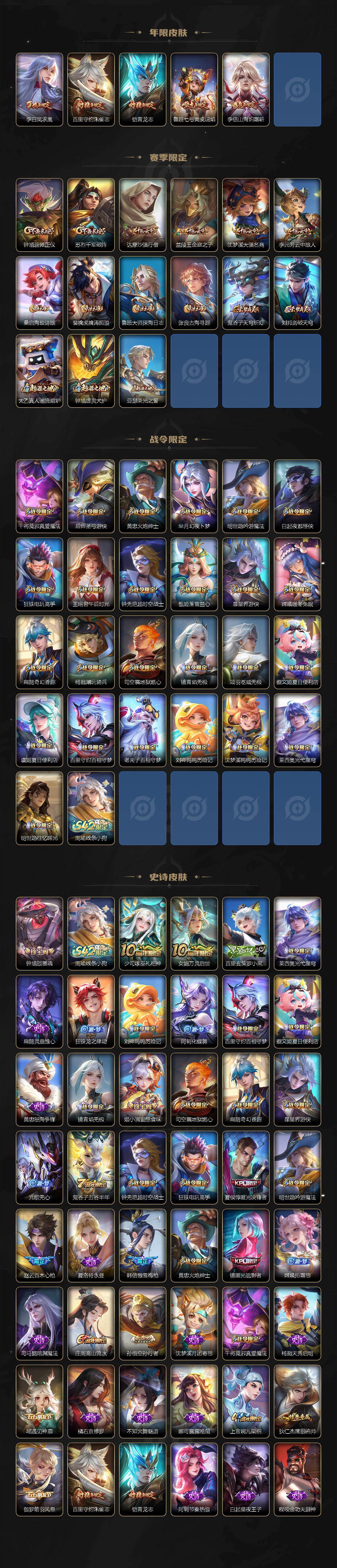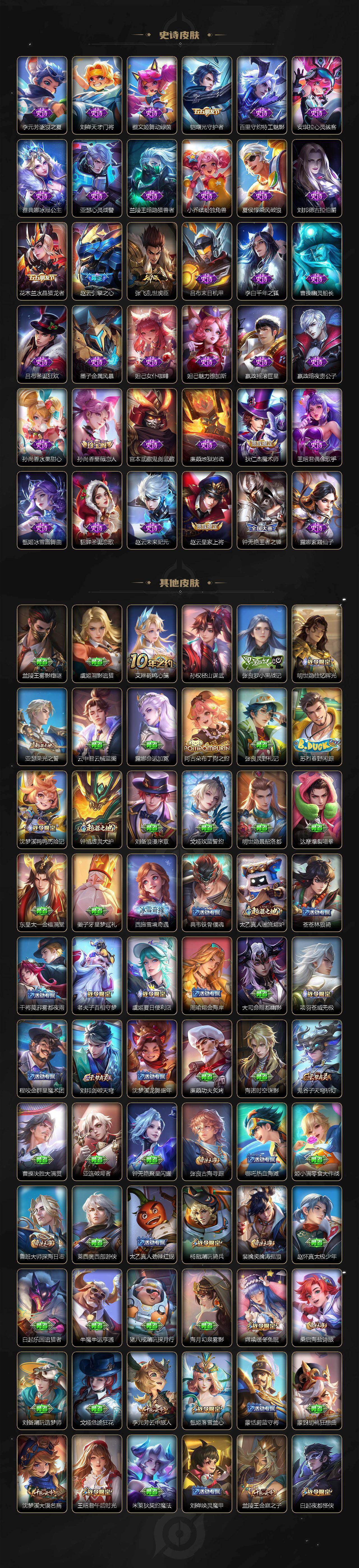 【传说皮肤】:后羿神树通天,云缨幻光神枪,桑启鸣野蒿,李信山海炽霜斩,鲁班七号寅虎瑞焰,铠绛天战甲,虞姬启明星使,曜云鹰飞将,李信一念神魔,达摩黄金狮子座,后羿黄金射手座,诸葛亮武陵仙君,貂蝉仲夏夜之梦,李白凤求凰,宫本武藏地狱之眼