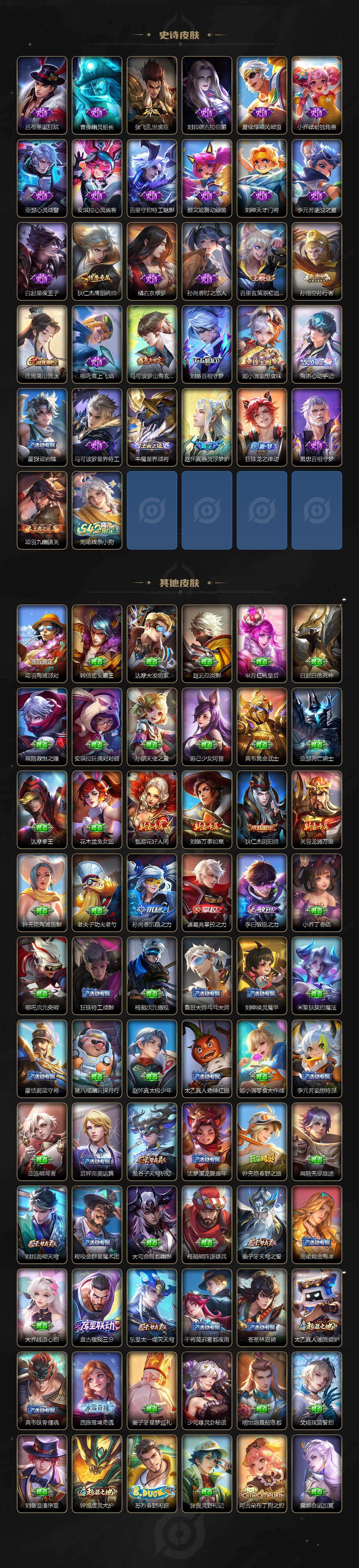 【传说皮肤】:后羿神树通天,司空震愿照山河定,女娲愿照千秋盛,妲己愿照众生和,澜愿照九州拓,蔡文姬愿照福禄聚,虞姬愿照岁时盈,云缨幻光神枪,桑启鸣野蒿,吕布曦玄引,孙策乘龙淬吴钩,赵云乘龙铭钟鼎,澜逐花归海,露娜霜月吟,鲁班七号时之奇旅,马超无双飞将,王昭君乞巧织情,铠绛天战甲,镜炽阳神光,李信一念神魔,刘备时之恋人,张良黄金白羊座,干将莫邪久胜战神,达摩黄金狮子座,后羿黄金射手座,貂蝉仲夏夜之梦