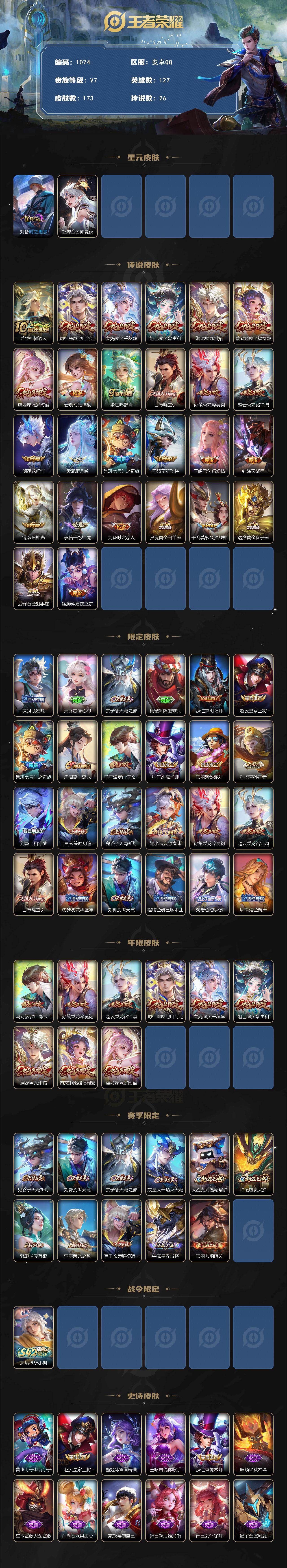 V5-最强王者段位-127英雄-173皮肤-26传说-43史诗