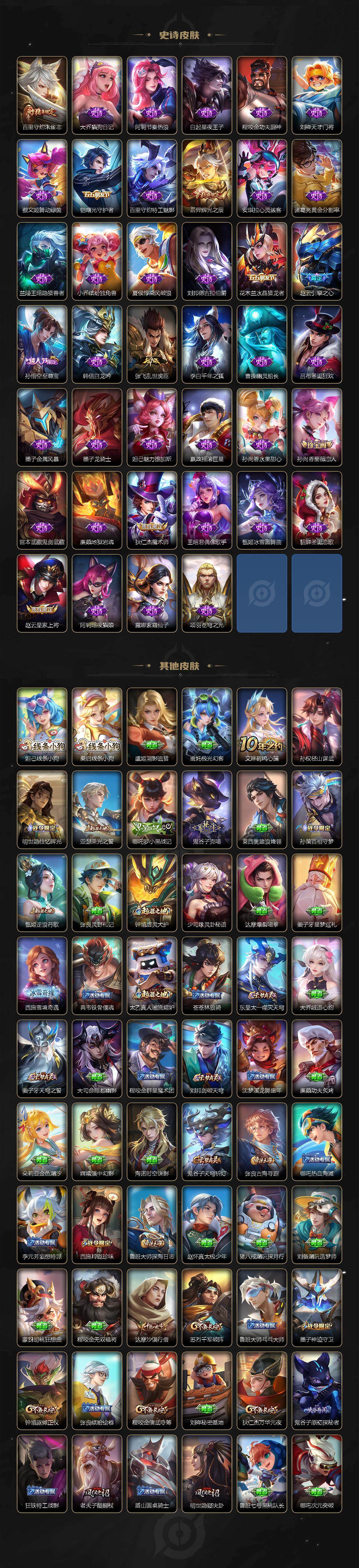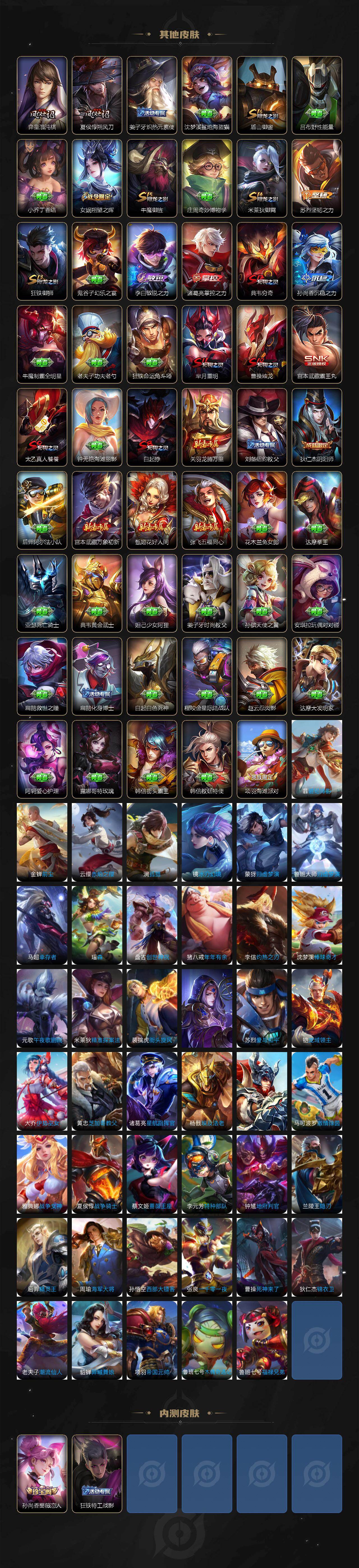 【传说皮肤】:云缨神骥越千峰,后羿神树通天,司空震愿照山河定,女娲愿照千秋盛,妲己愿照众生和,澜愿照九州拓,蔡文姬愿照福禄聚,虞姬愿照岁时盈,云缨幻光神枪,桑启鸣野蒿,马可波罗妄想实况,王昭君乞巧织情,公孙离祈雪灵祝,虞姬启明星使,孙悟空零号赤焰,李信一念