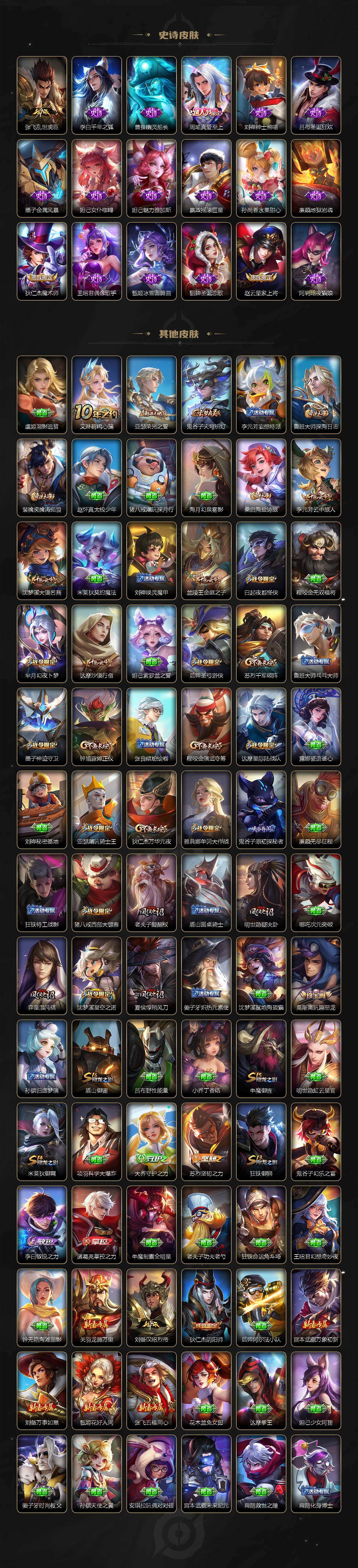 【传说皮肤】:朵莉亚心动手记,貂蝉遇见胡旋,西施游龙清影,镜炽阳神光,虞姬启明星使,曜云鹰飞将,李信一念神魔,貂蝉猫影幻舞,后羿黄金射手座,孙尚香末日机甲