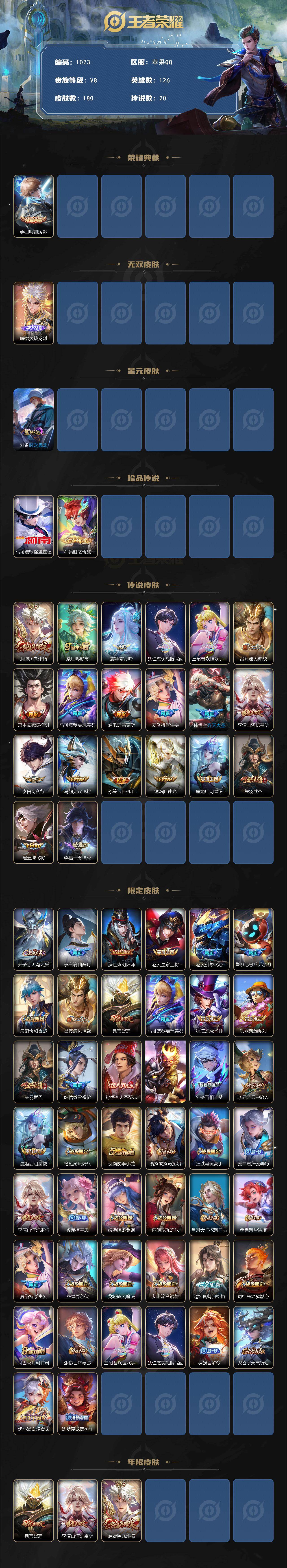 苹果Q-V8-永恒钻石IV段位-126英雄-180皮肤-1典藏皮肤-1无双-2珍品传说-20传说-61史诗