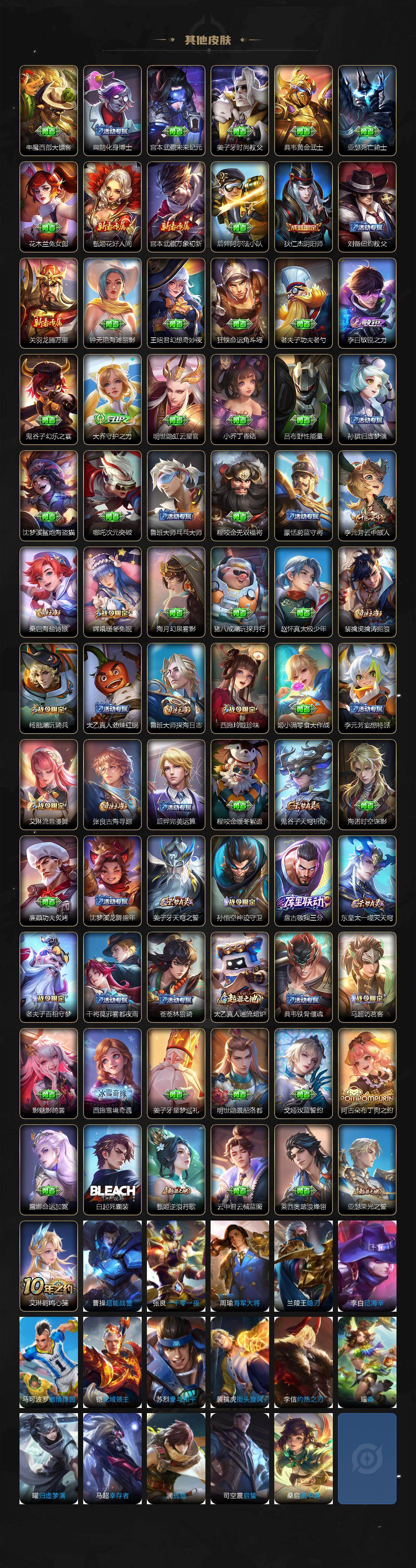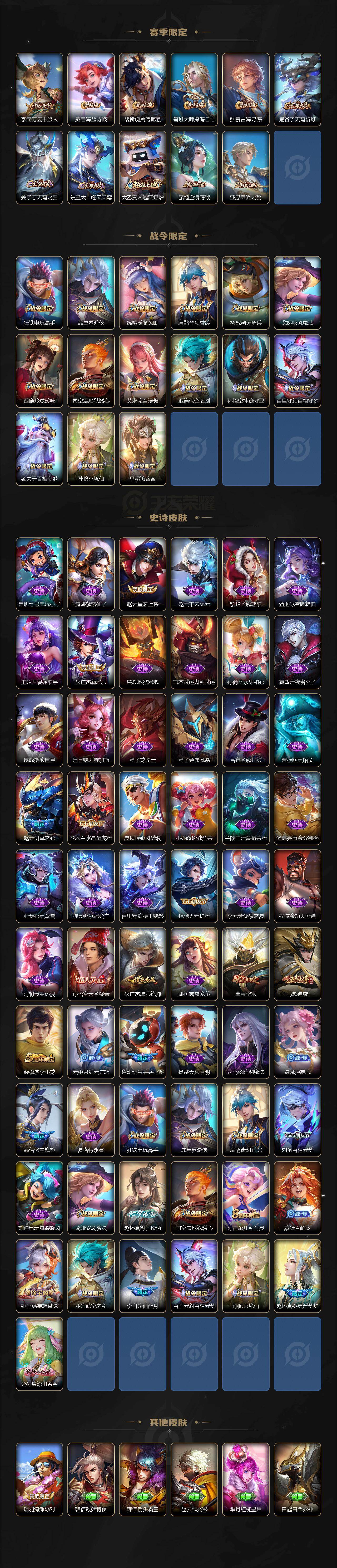 【传说皮肤】:澜愿照九州拓,桑启鸣野蒿,露娜霜月吟,狄仁杰夜礼服假面,王昭君永恒水手月亮,吕布遇见神鼓,宫本武藏惊梅引,马可波罗妄想实况,澜电玩雷克斯,夏洛特浮生妄,孙悟空齐天大圣,李信山海炽霜斩,李白诗剑行,马超无双飞将,孙策末日机甲,镜炽阳