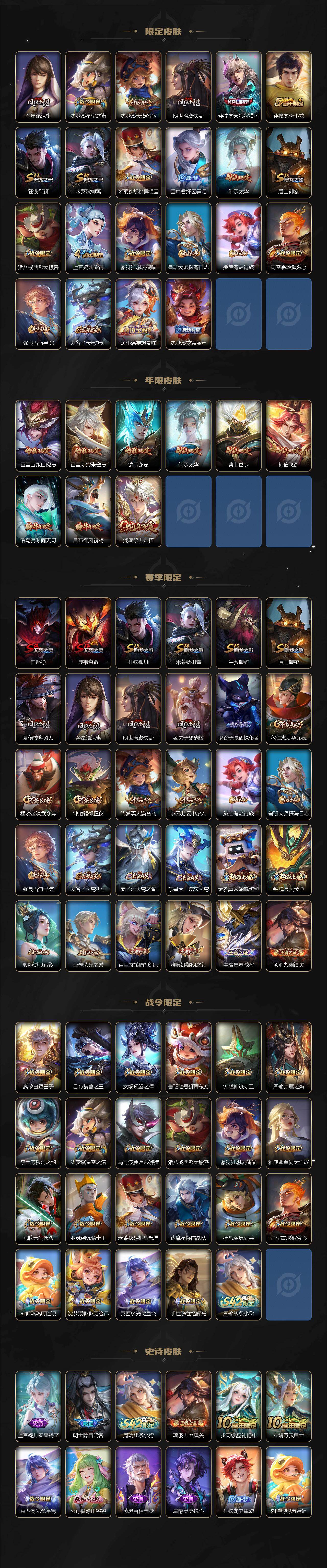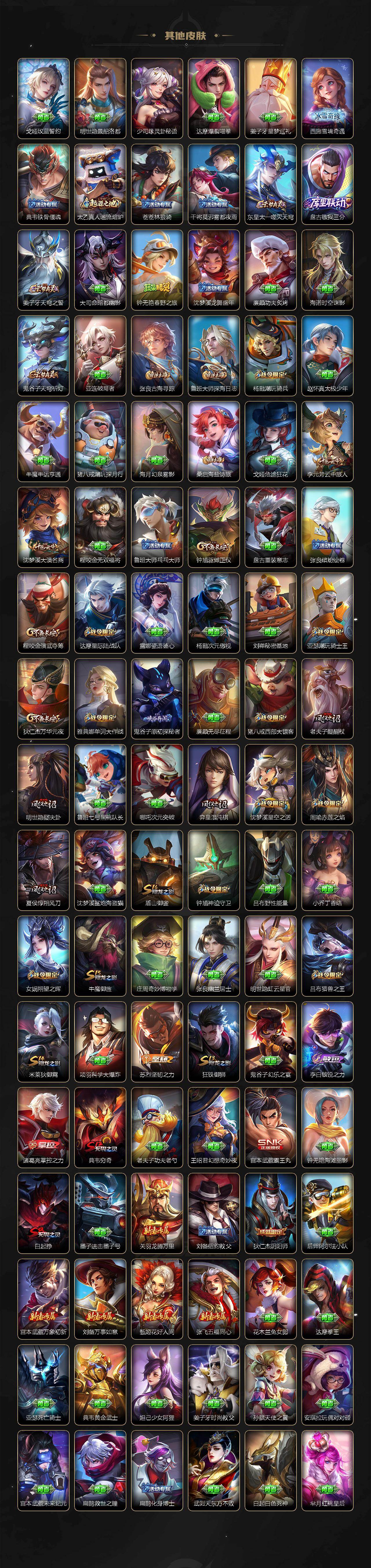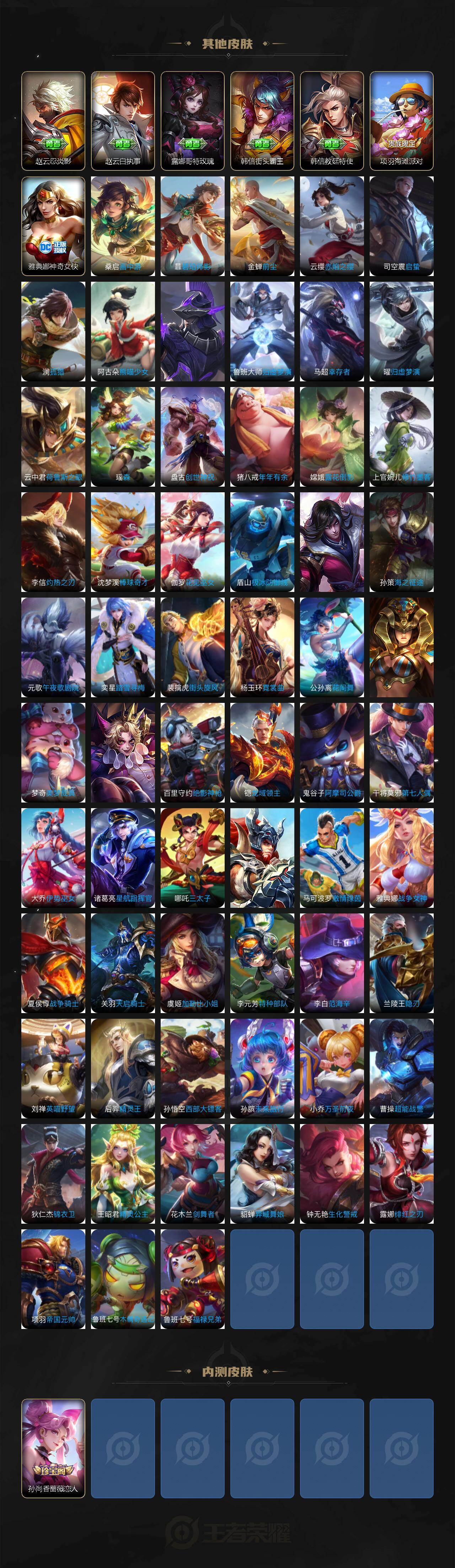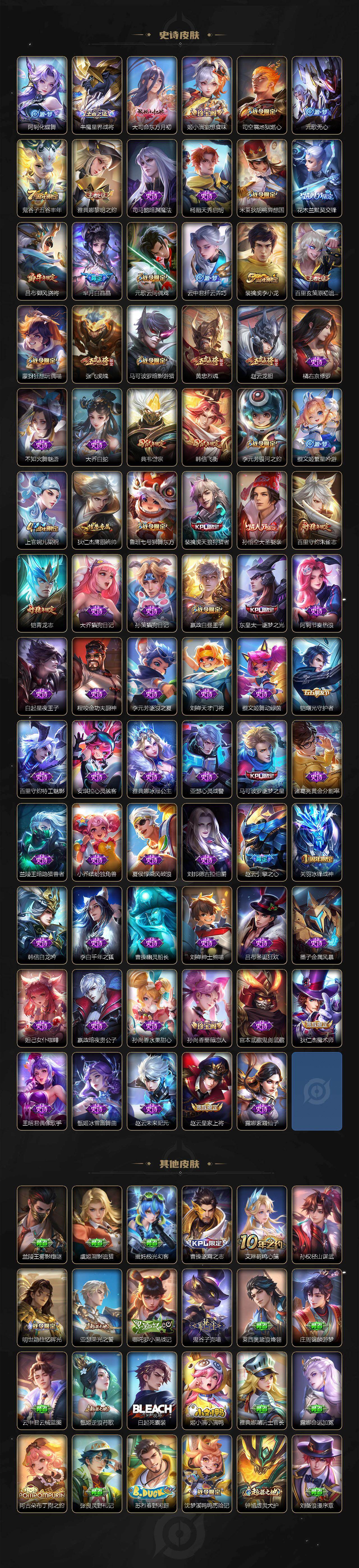 【传说皮肤】:云缨神骥越千峰,后羿神树通天,大司命死亡执政官,澜愿照九州拓,云缨幻光神枪,裴擒虎祥瑞亨通,桑启鸣野蒿,澜逐花归海,李元芳飞鸢探春,诸葛亮时雨天司,铠绛天战甲,镜炽阳神光,虞姬启明星使,孙悟空零号赤焰,关羽武圣,刘备时之恋人,伽罗太华,干将莫邪久胜战神,虞姬云霓雀翎,达摩黄金狮子