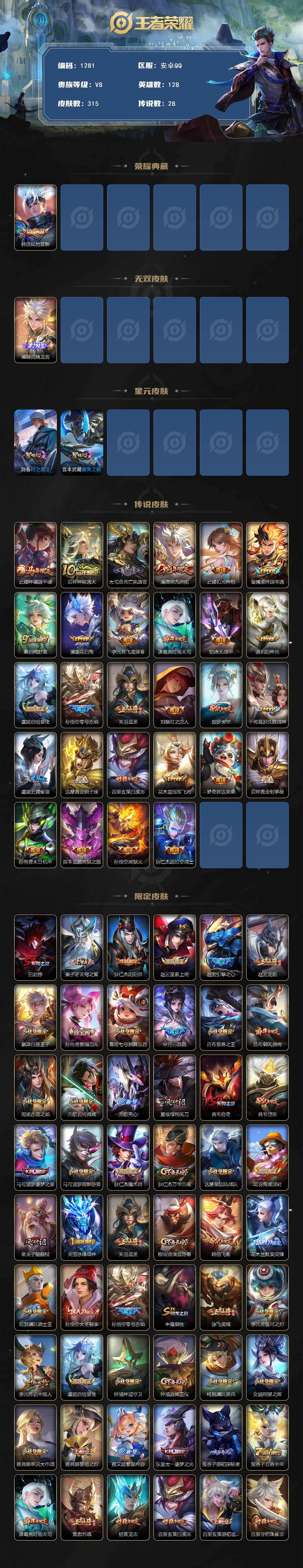 安卓Q-V8-最强王者段位-128英雄-315皮肤-1典藏皮肤-1无双-28传说-88史诗