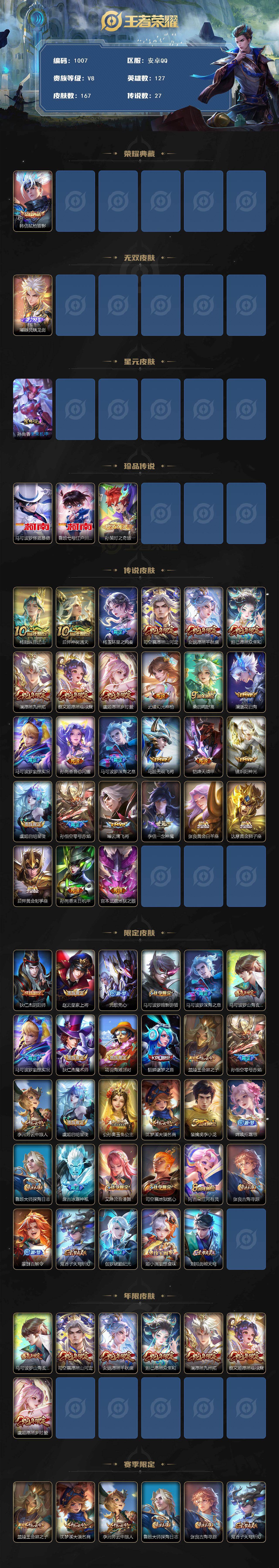 安卓Q-V8-永恒钻石II段位-127英雄-167皮肤-1典藏皮肤-1无双-3珍品传说-27传说-50史诗