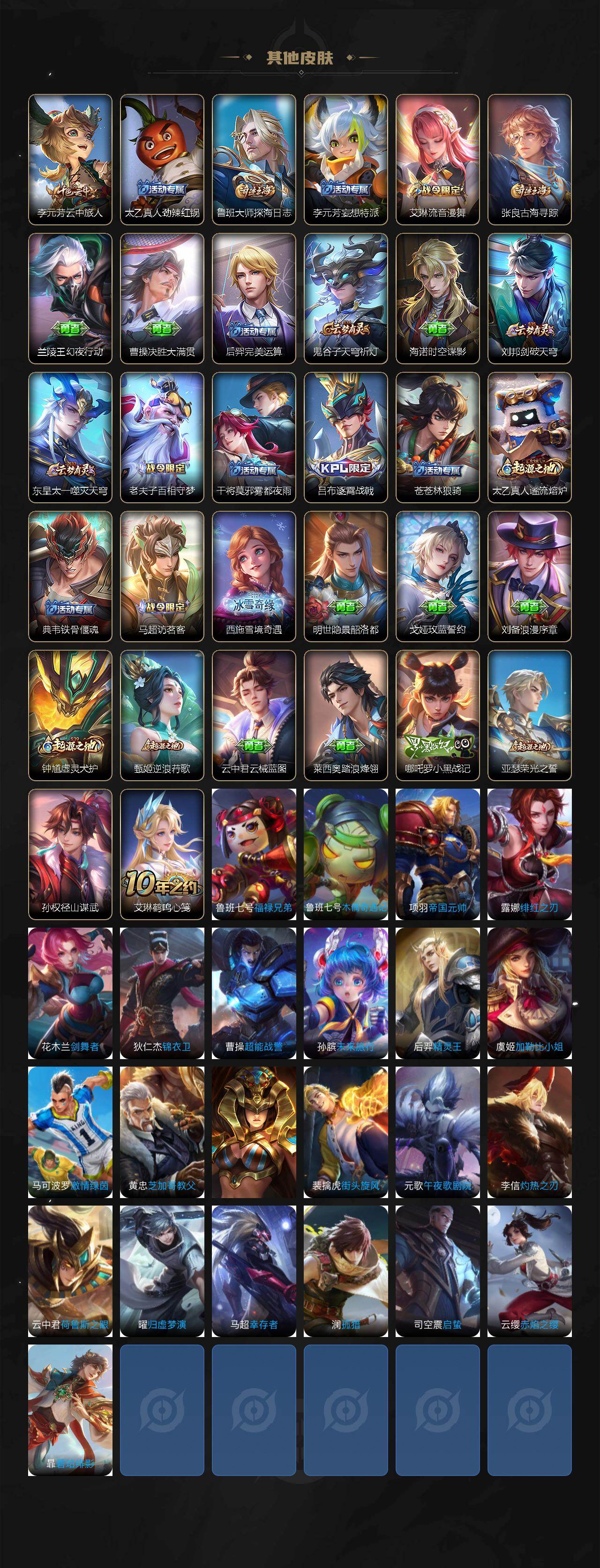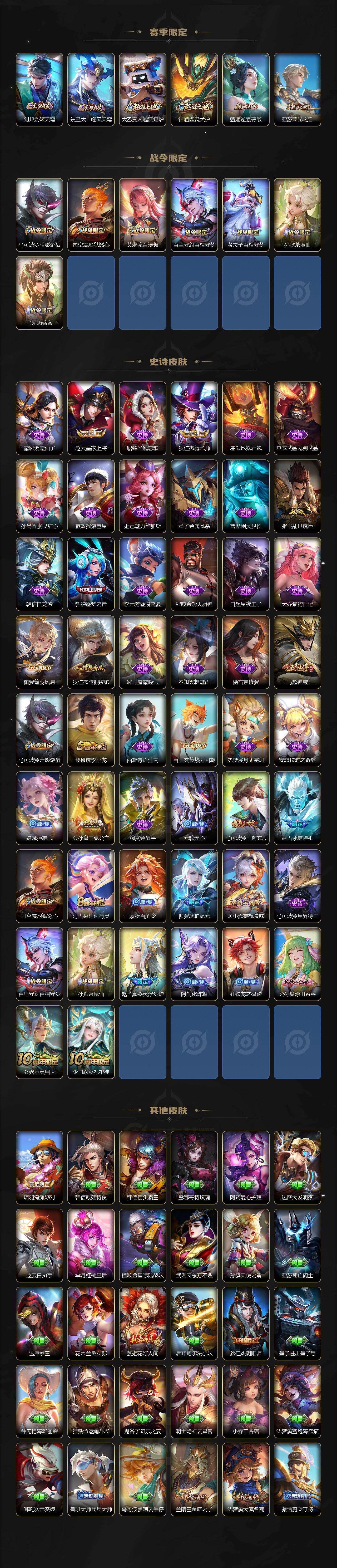 【传说皮肤】:杨戬纵目迁山,后羿神树通天,杨玉环星之鸣奏,司空震愿照山河定,女娲愿照千秋盛,妲己愿照众生和,澜愿照九州拓,蔡文姬愿照福禄聚,虞姬愿照岁时盈,云缨幻光神枪,桑启鸣野蒿,澜逐花归海,马可波罗妄想实况,孙尚香音你闪耀,马可波