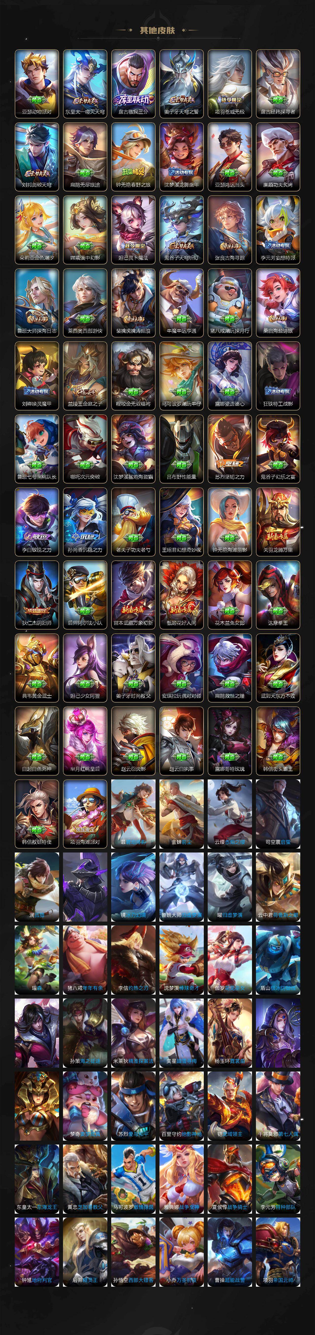 【传说皮肤】:花木兰异界灵契,曹操万灵伏威,公孙离云诺千山,澜愿照九州拓,虞姬愿照岁时盈,云缨幻光神枪,裴擒虎祥瑞亨通,桑启鸣野蒿,庄周牧神诗旅,孙尚香乘龙问璇玑,澜逐花归海,大乔时之奇旅,夏洛特浮生妄,百里守