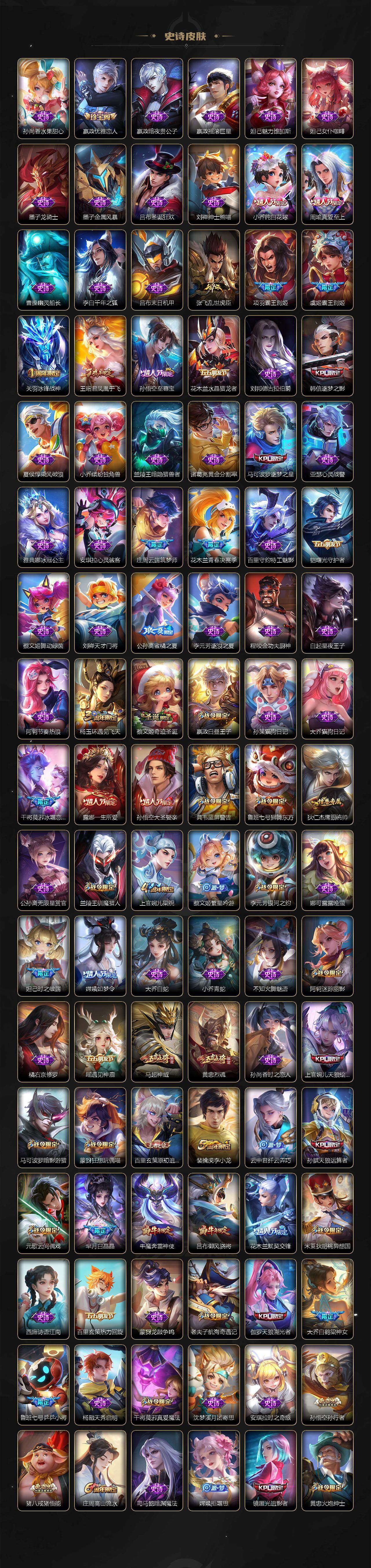 【荣耀典藏】:武则天英雄,孙悟空全息碎影,武则天倪克斯神谕,夏侯惇无限飓风号,小乔天鹅之梦,孙尚香杀手不太冷,鲁班七号星空梦想,芈月大秦宣太后,程咬金活力突击,李白鸣剑曳影,诸葛亮星域神启,花木兰九霄神辉
