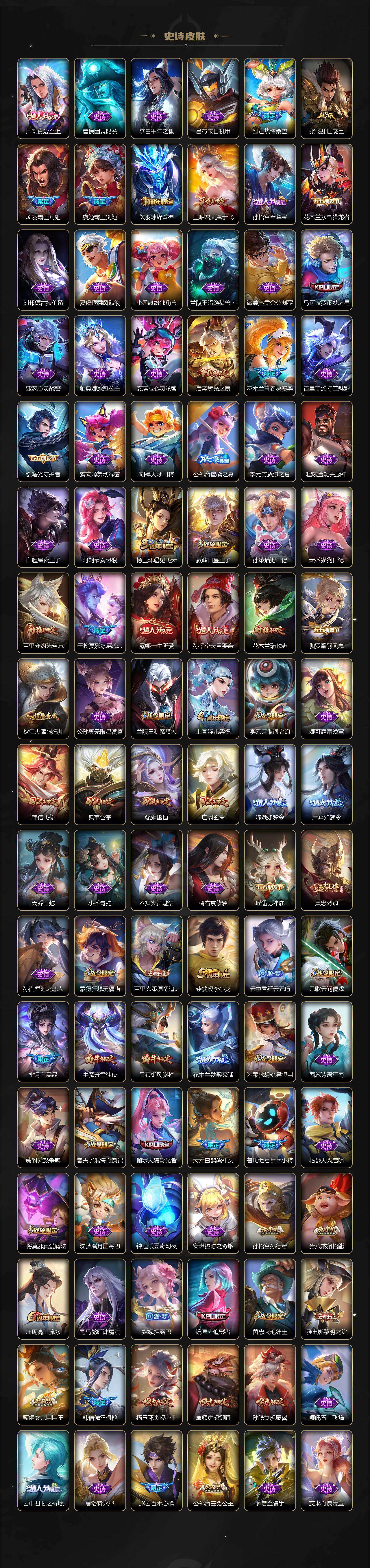 【英雄全皮】:刘禅全皮,扁鹊全皮,王昭君全皮,花木兰全皮,娜可露露全皮,橘右京全皮,太乙真人全皮,鬼谷子全皮,沈梦溪全皮,狂铁全皮,李信全皮,鲁班大师全皮,蒙恬全皮,夏洛特全皮,司空震全皮,金蝉全皮,戈娅全皮,空空儿全皮,影全皮